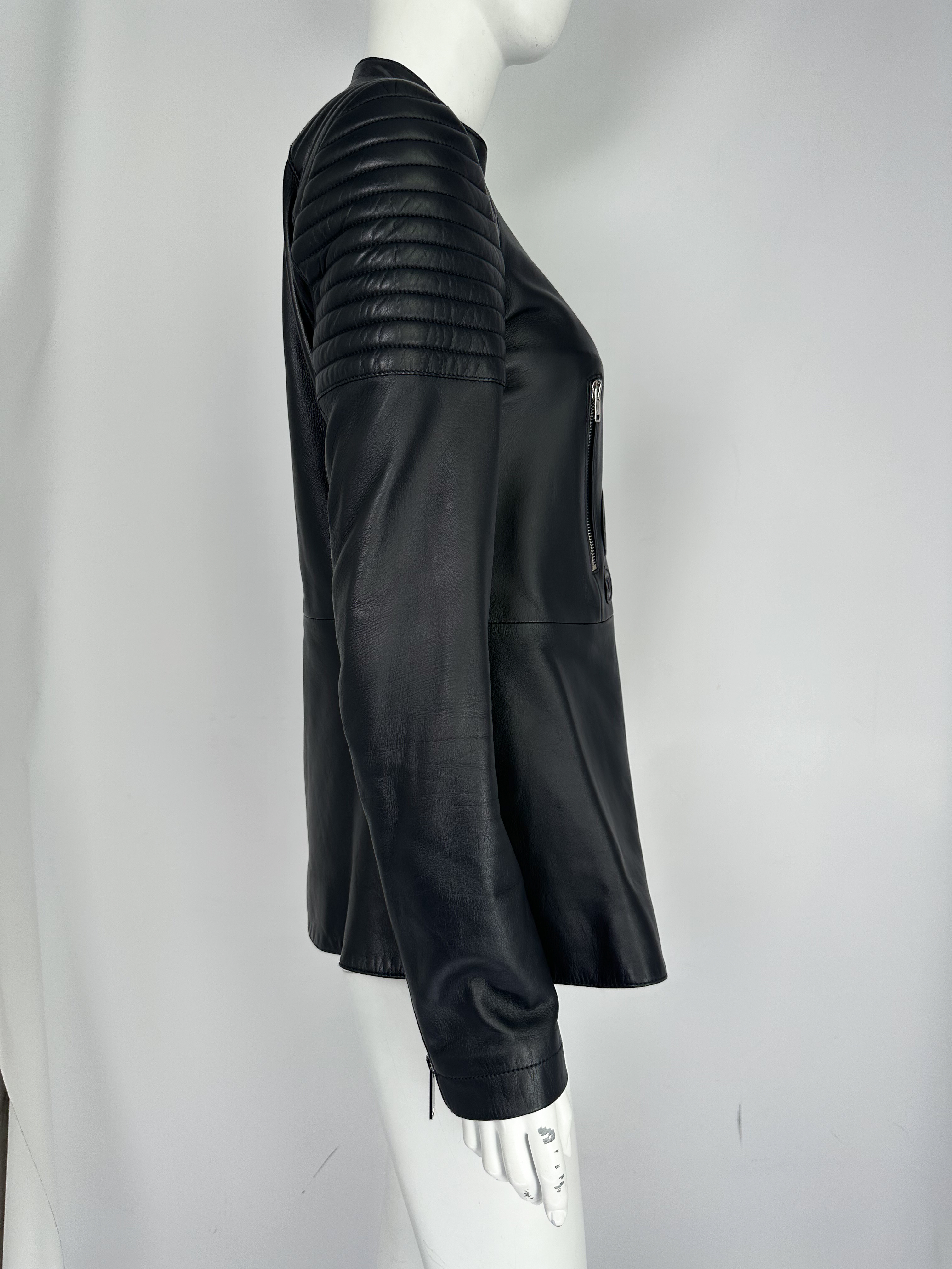 "Czarna skórzana ramoneska ozdobiona naszywkami z logo marki oraz o motywie kwiatowym, miękka skóra, zapinana na dwa logowane srebrne suwaki oraz stójkę przy szyi, pikowana na ramionach oraz częściowo na rękawach, jedna zasuwana kieszeń na przodzie, regulowane mankiety, tył wykończony falbaną, czarna jedwabna podszewka, używana. Stan bardzo dobry, delikatne ślady użytkowania widoczne na skórze oraz porysowane metalowe elementy. Rozmiar z metki IT 44. Skład: 100% skóra jagnięca; podszewka: 100% jedwab. Wymiary: szeokość mierzona do pachy do pachy 46cm, długość rękawa 64cm, długość całkowita 67cm."