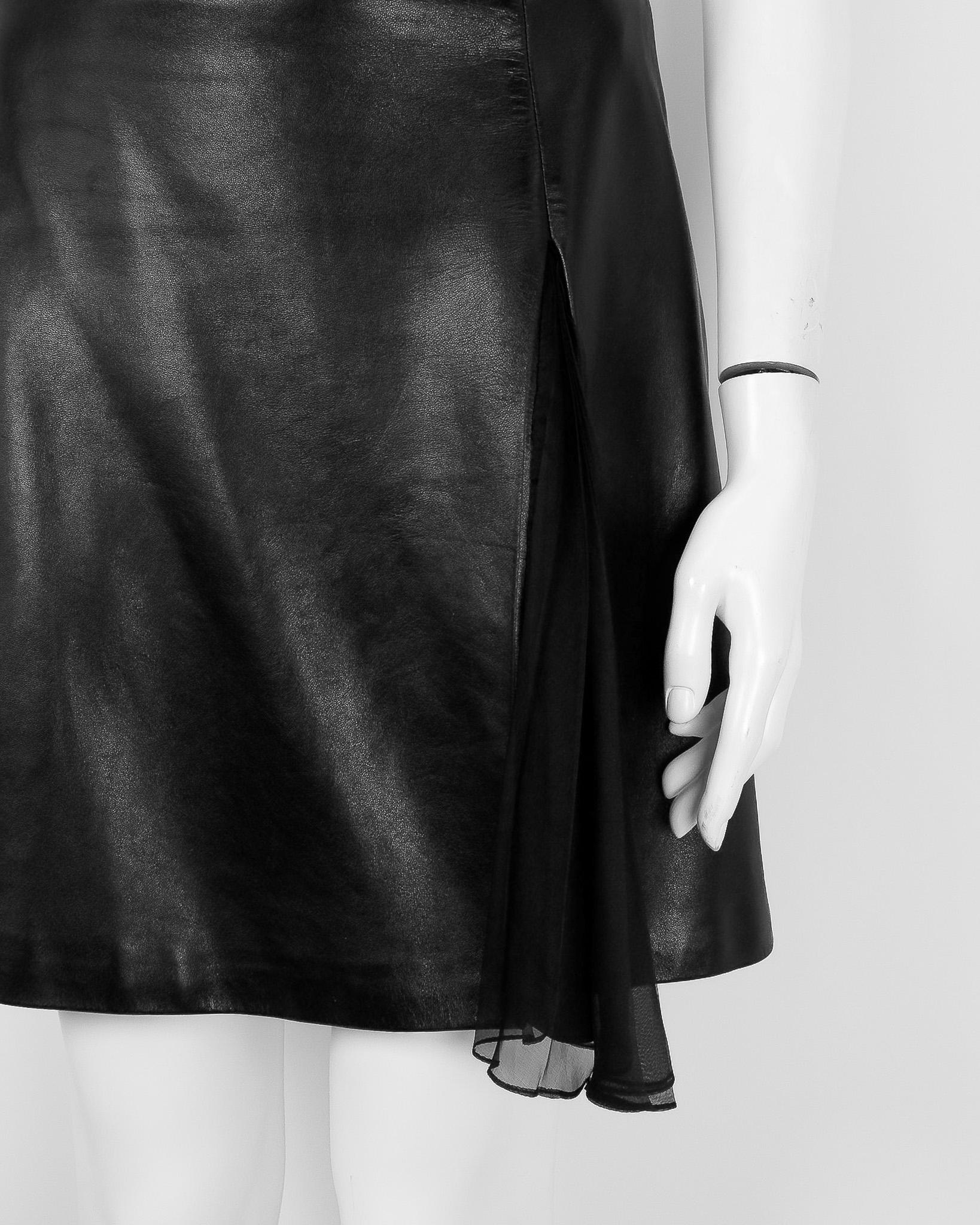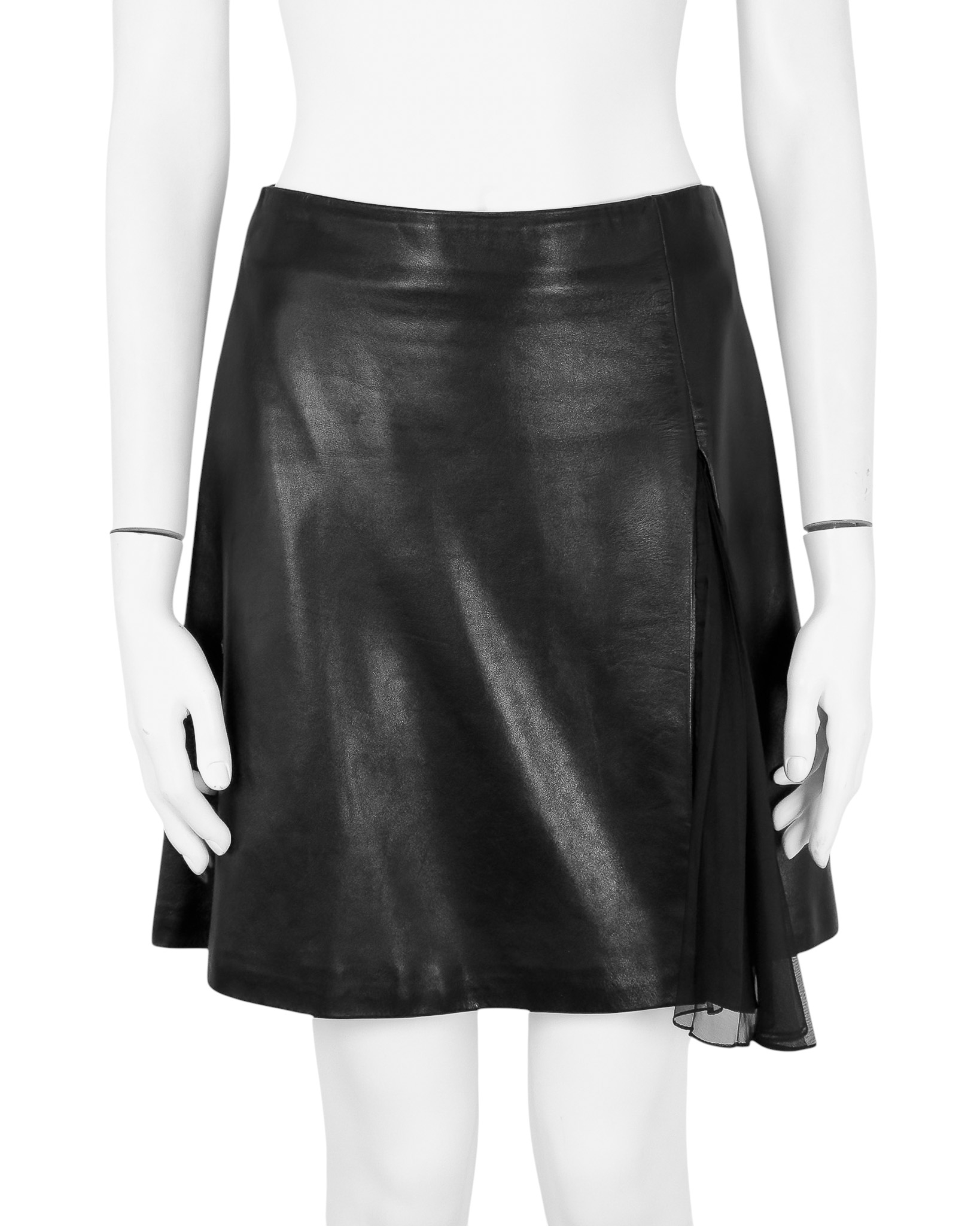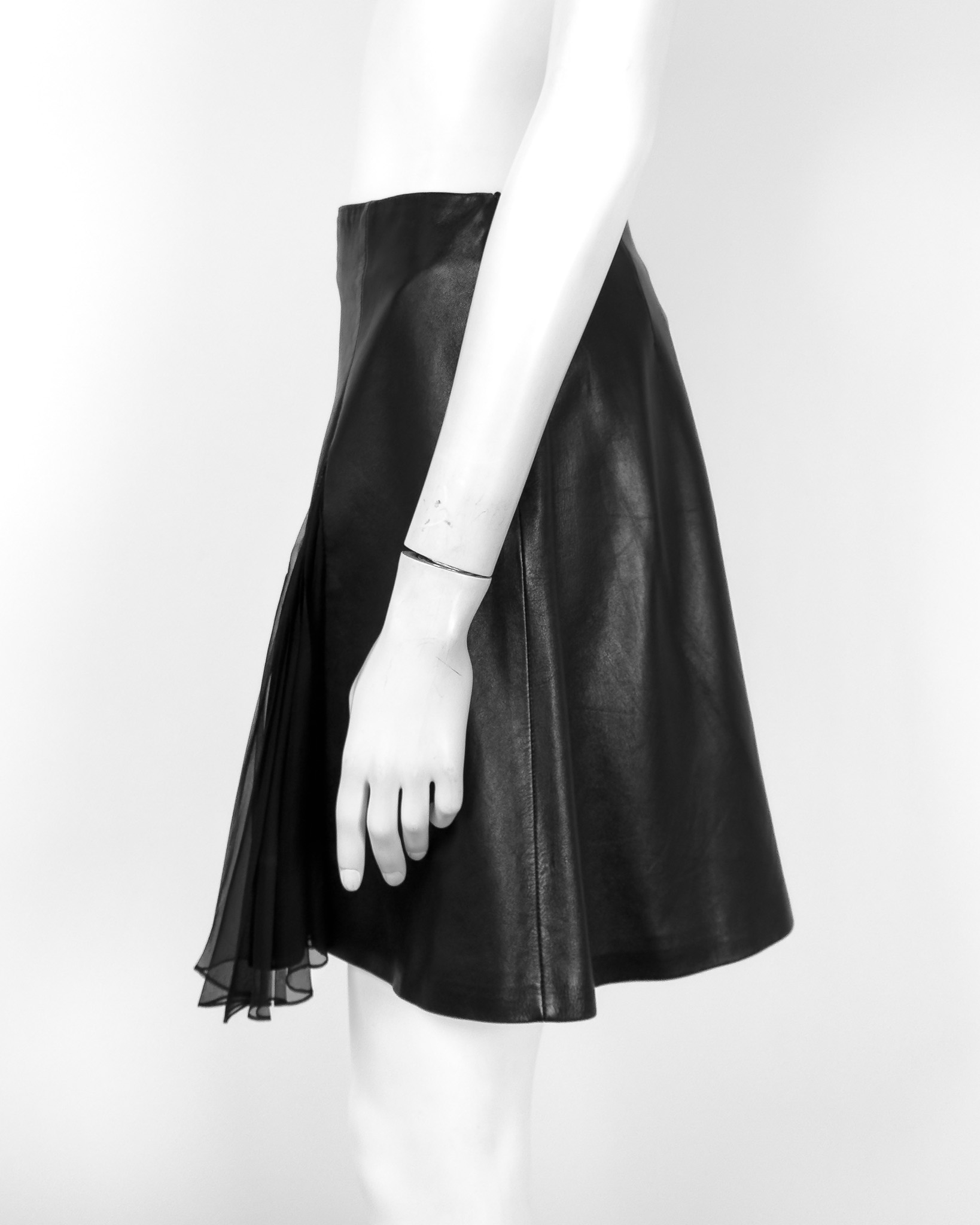 "Czarna skórzana rozkloszowana spódnica z rozcięciem ozdobionym plisowanym materiałem, długość przed kolano, zapinana w bocznej części na suwak. Wycięta metka ze składem. Wymiary: szerokość w pasie 35cm, długość całkowita 47cm."
