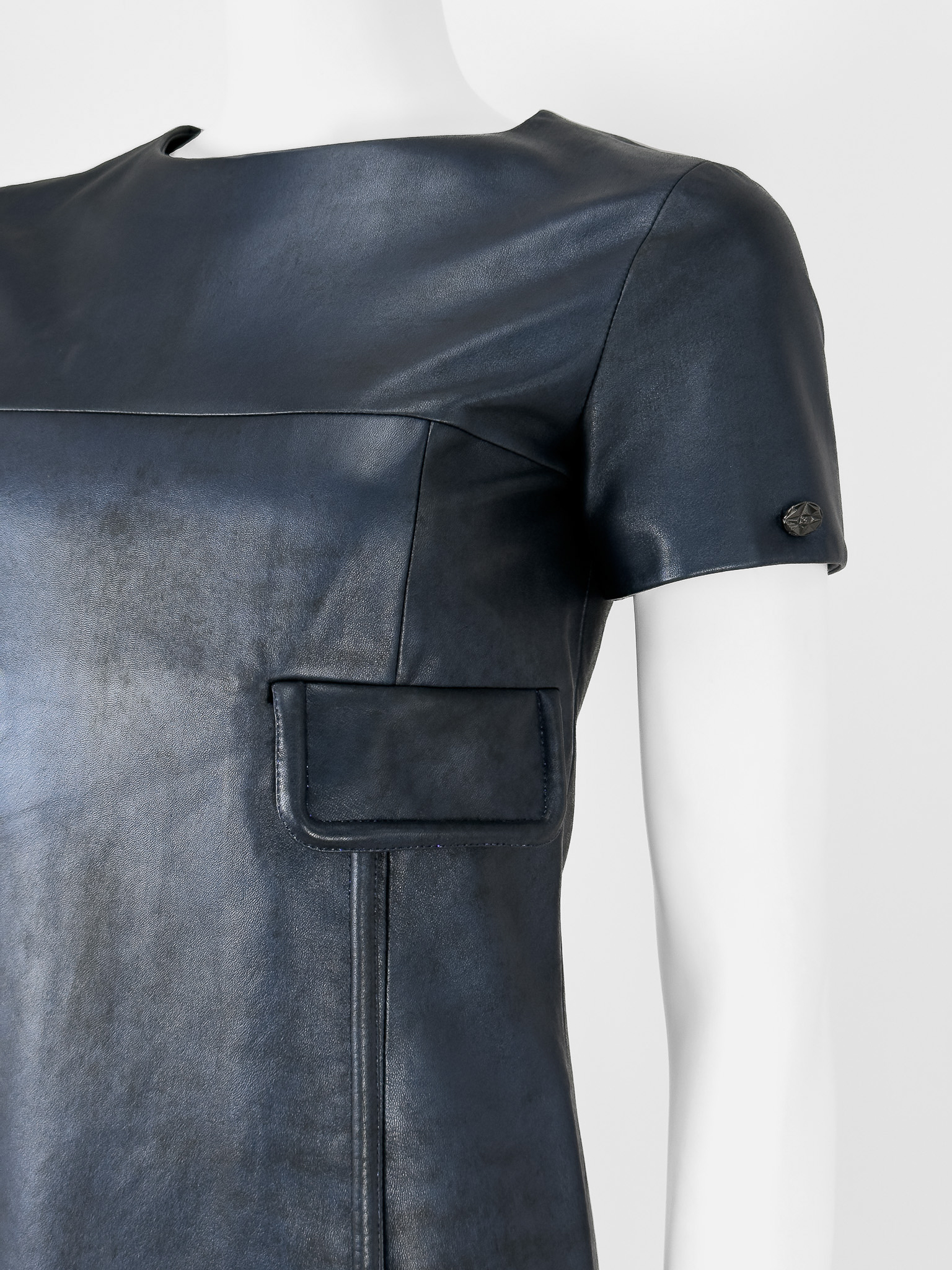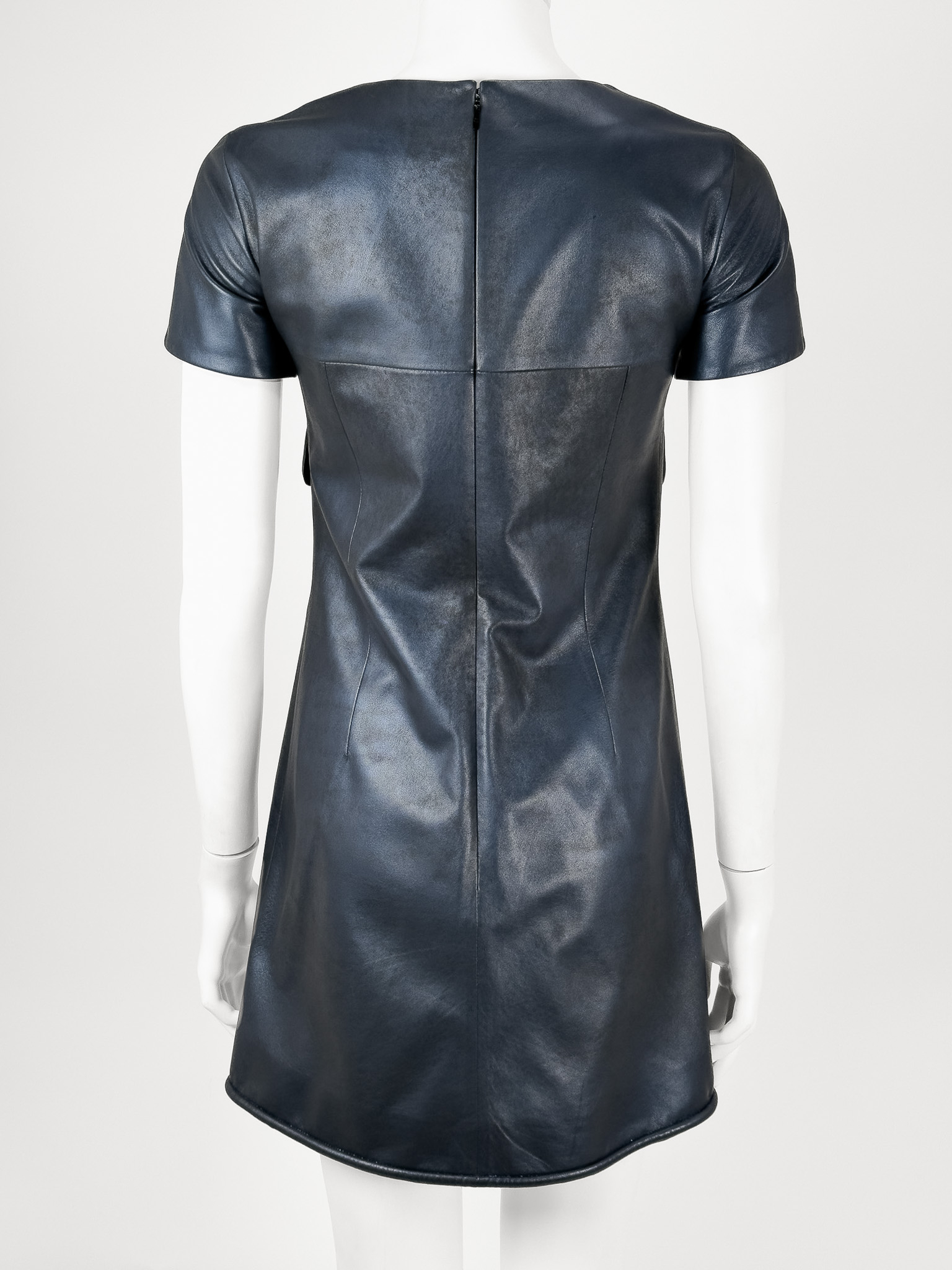 "Granatowa skórzana sukienka delikatnie przyciemniana, krótki rękaw, dwie patki na przodzie, zapinana z tyłu na suwak, zakładka na przodzie. Rozmiar z metki FR 36. Skład; 100% skóra cielęca, podszewka 100% jedwab. Stan bardzo dobry. Wymiary: szerokość mierzona od pachy do pachy 41cm, długość całkowita 82cm."
