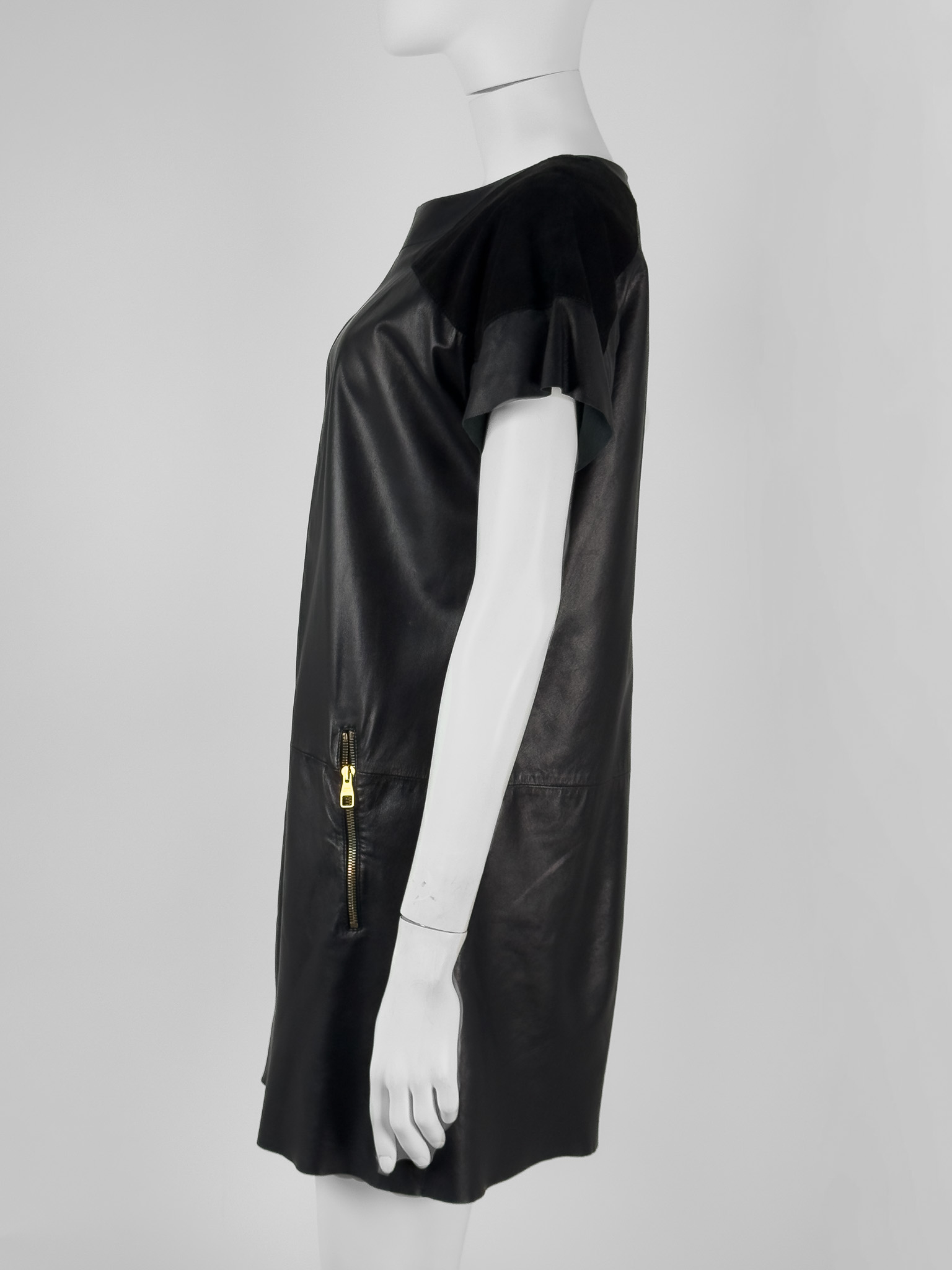 "Czarna skórzana sukienka o pudełkowym kroju, długość przed kolano, zamszowe wstawki na ramionach, zaokrąglony dekolt, dwie kieszenie zapinane na złote logowane suwaki po bokach, przeszycia, zapinana w tylnej części, surowo wykończona, podszewka. Stan bardzo dobry. Rozmiar z metki IT 38. Skład:100% skóra jagnięca; podszewka: 60% wiskoza, 35% kupro, 5% elastan. Wymiary: szerokość mierzona od pachy do pachy 52cm, długość całkowita 84cm."