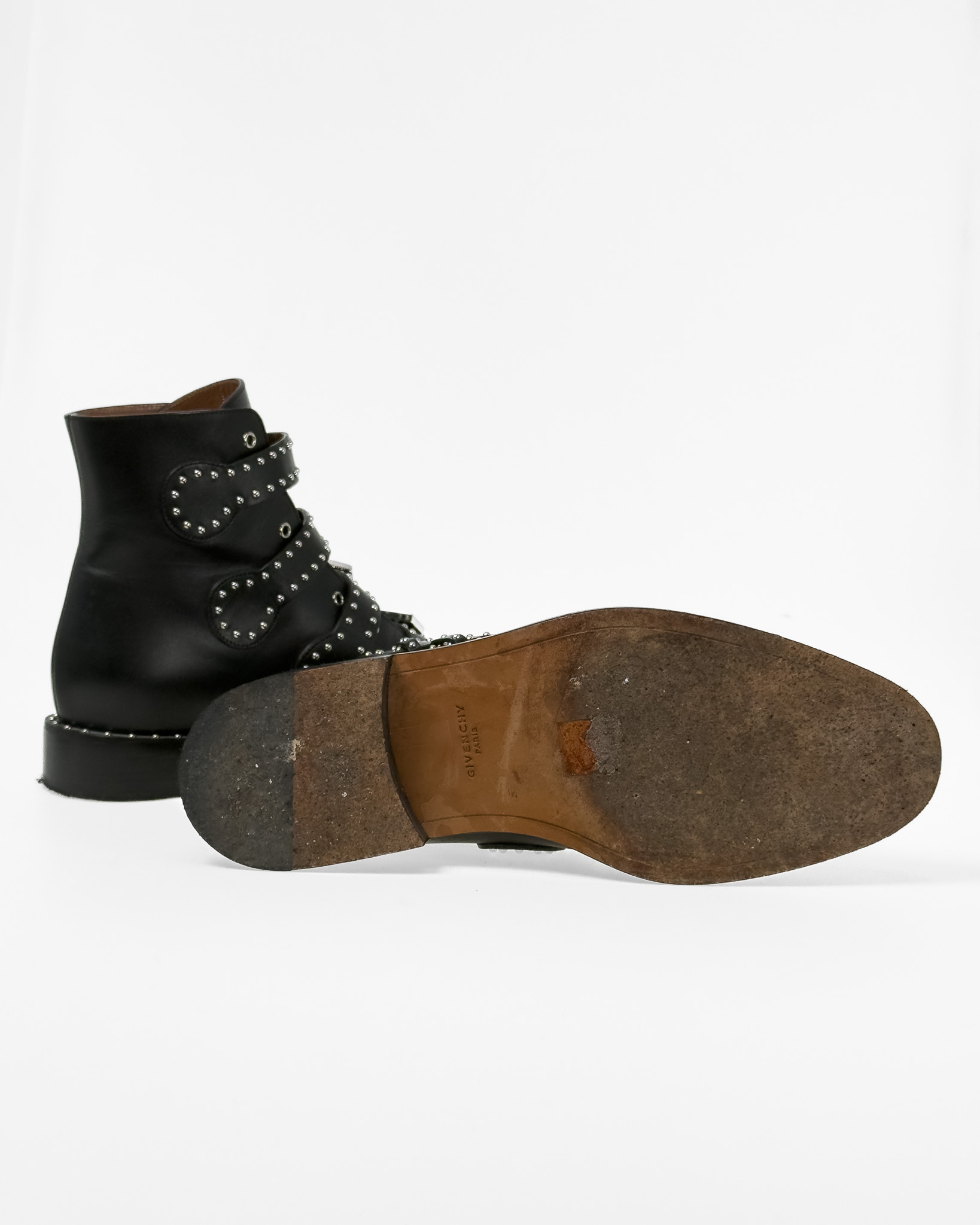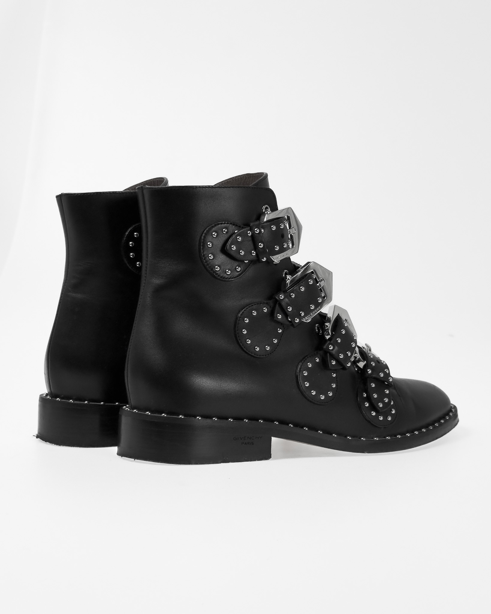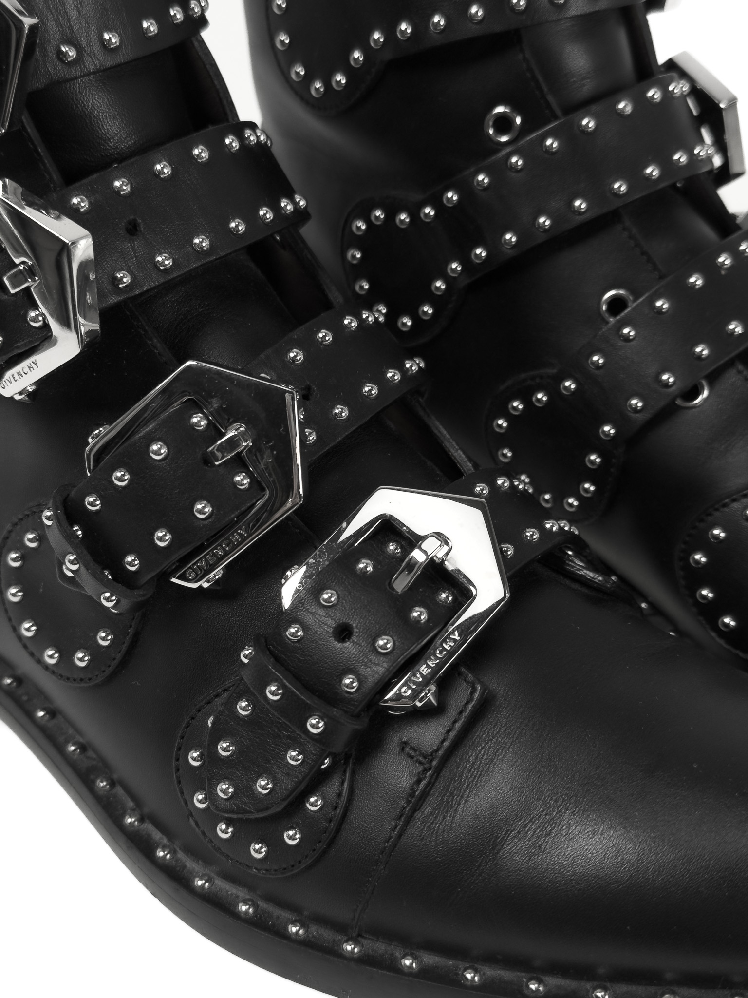 "Skórzane czarne botki ze srebrnymi dżetami, zapinane na cztery paski z logowanymi sprzączkami, niski obcas, brązowe wnętrze, w zestawie z pudełkiem. Stan bardzo dobry, posiadają ślady użytkowania na podeszwie. Rozmiar 38."