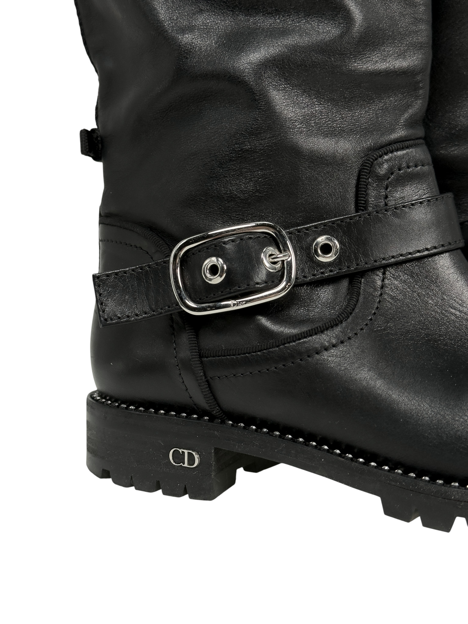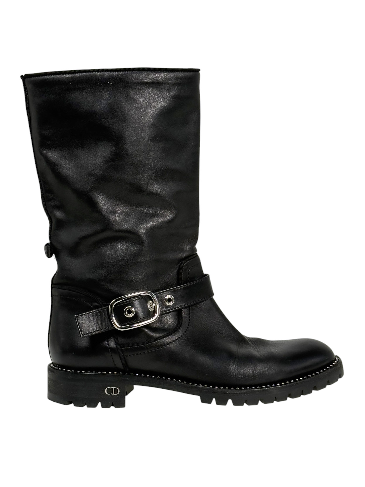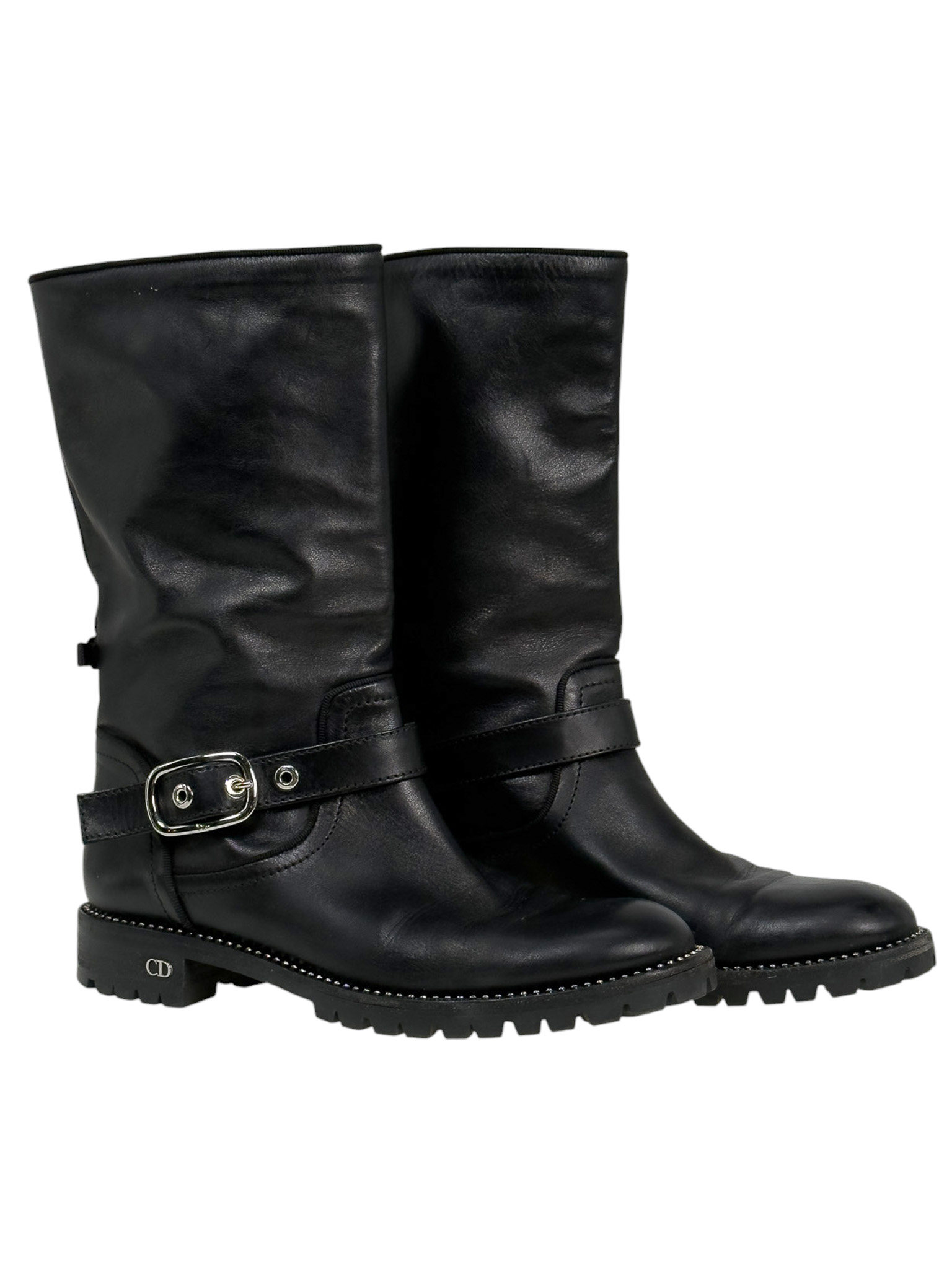 "Czarne skórzane botki ozdobione błyszczącymi cyrkoniami na podeszwie, regulowany pasek ze srebrną klamrą w bocznej części, niski obcas z inicjałami marki, wsuwane. Stan dobry, posiadają niewielkie zabrudzenia na podeszwie, marszczenia na skórze, minimalną wadę w postaci delikatnego rozklejenia podeszwy prawego buta. Rozmiar 38,5."