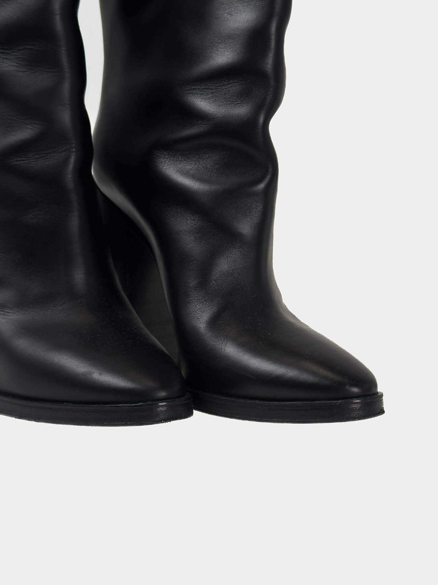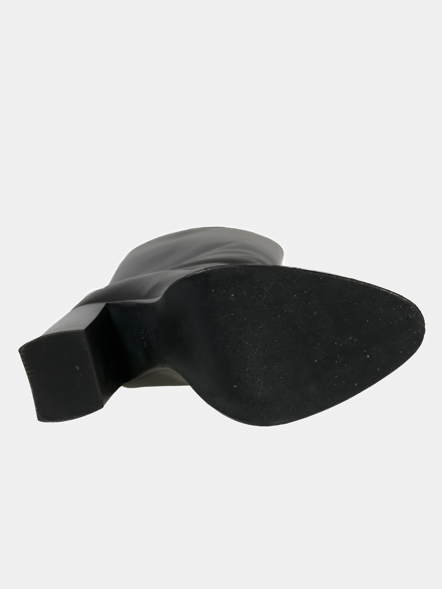 "Czarne skórzane kozaki, obcas słupek, migdałowe noski, wsuwane. Stan bardzo dobry. Rozmiar 39,5."