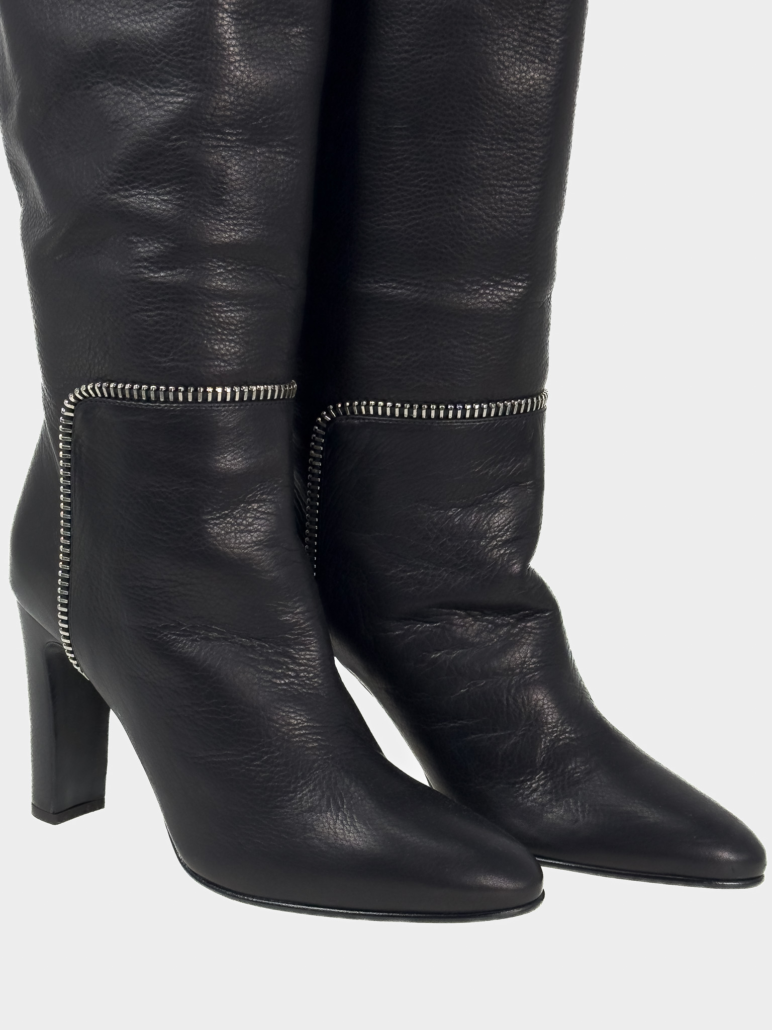 "Czarne skórzane kozaki, miękka skóra, cholewka o długości za kolano, ozdobione srebrnymi suwakami, migdałowe noski, obcas słupek, wsuwane, w zestawie z workiem przeciwkurzowym. Stan bardzo dobry. Rozmiar 38."