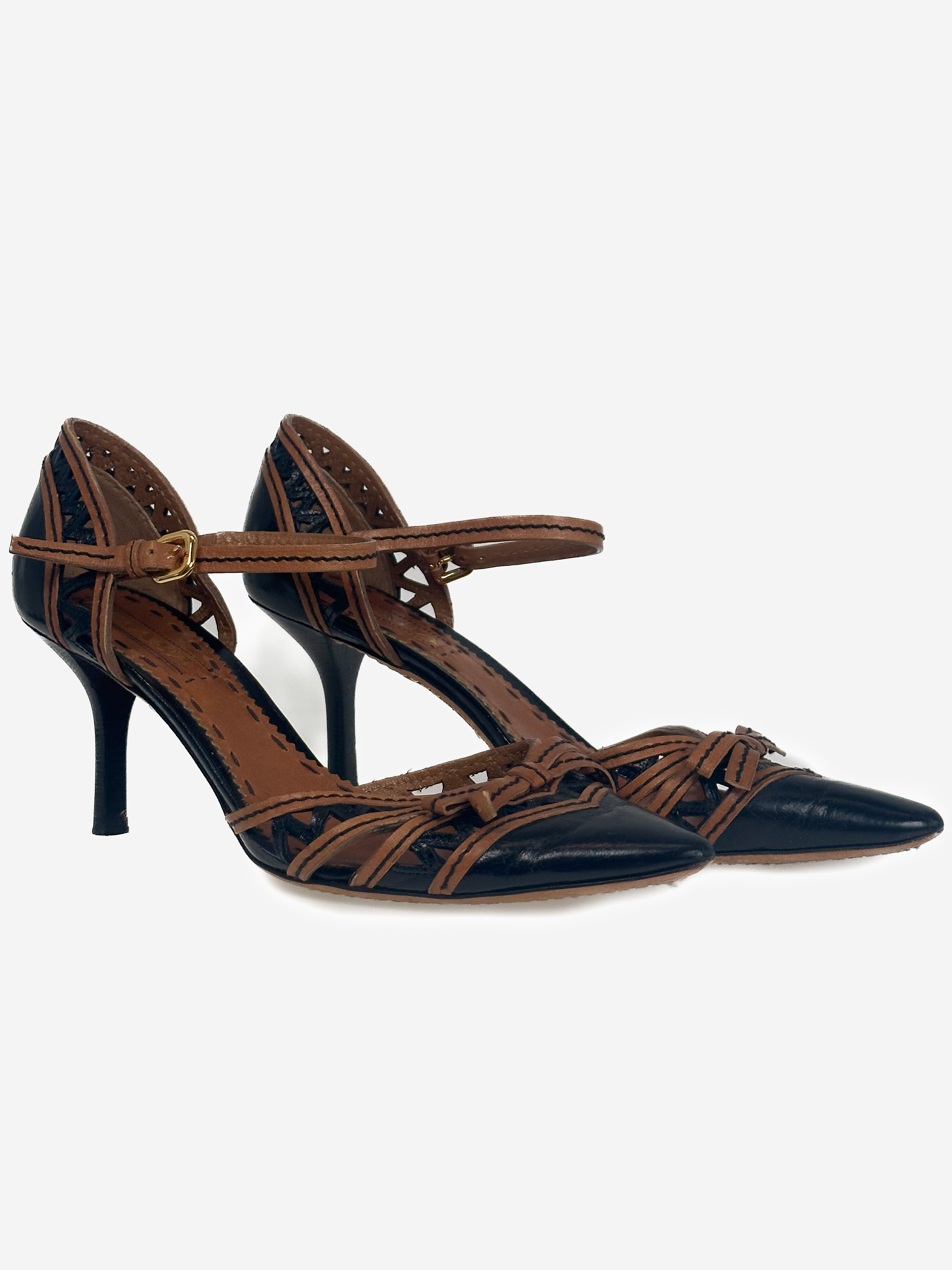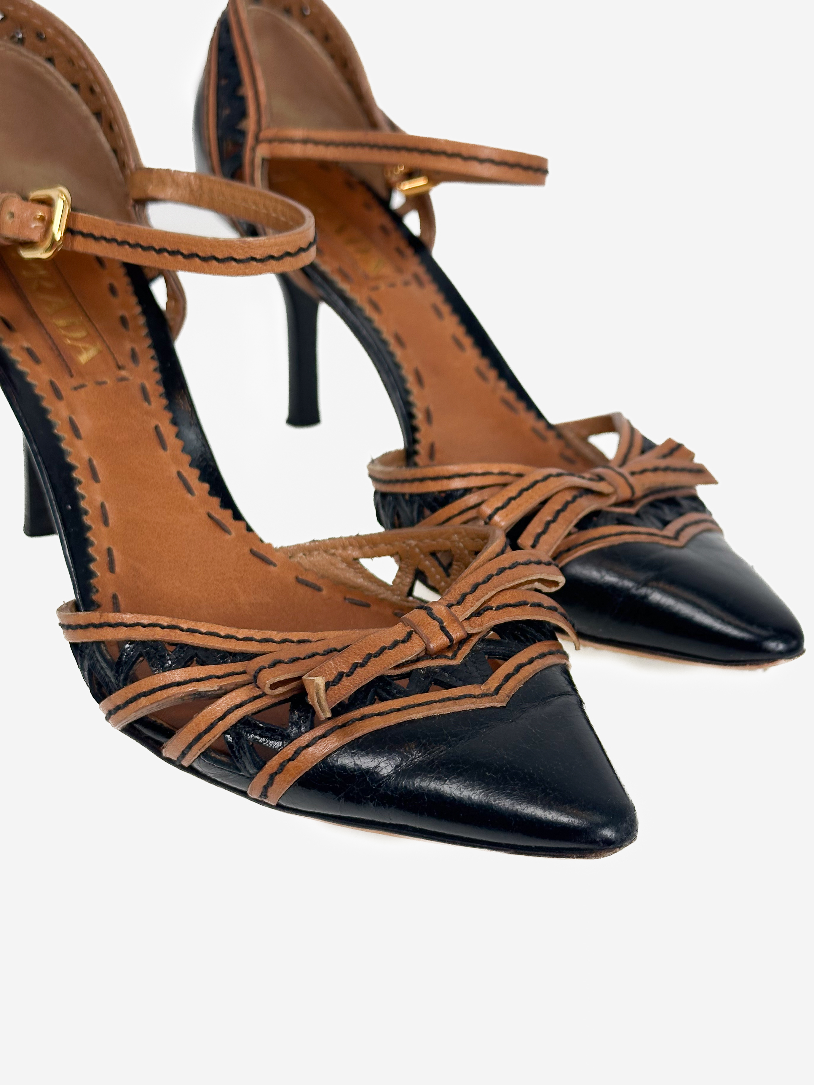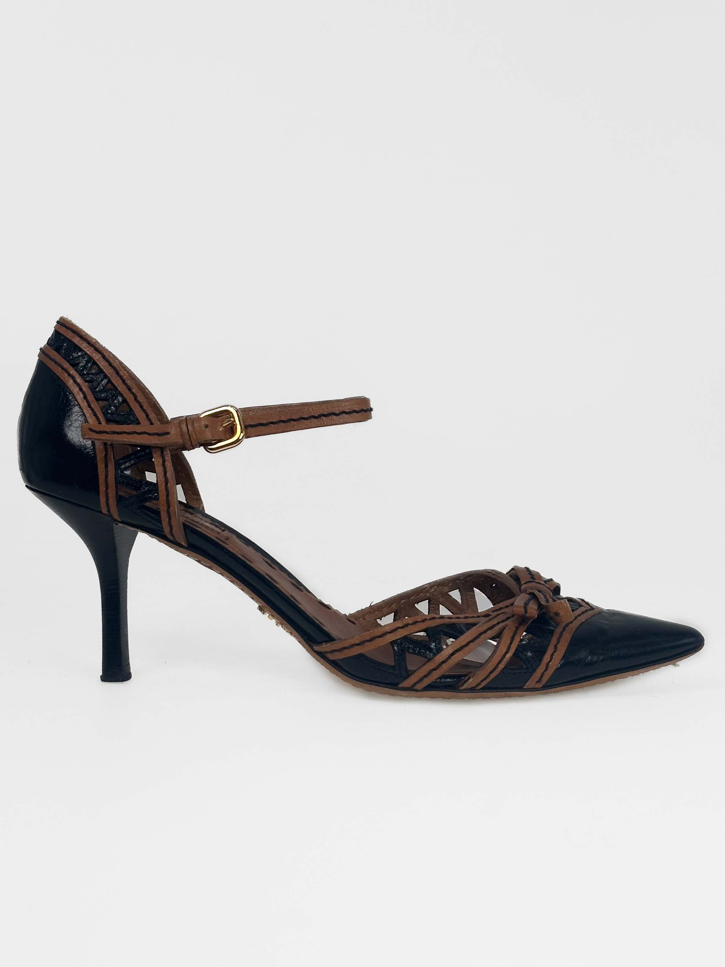 "Czarne skórzane szpilki w stylu vintage z camelowym wykończeniem, wkładką i kokardką na czubku, zapięcie wokół kostki ze złotą klamerką, rozmiar 36,5, w zestawie z pudełkiem, używane."