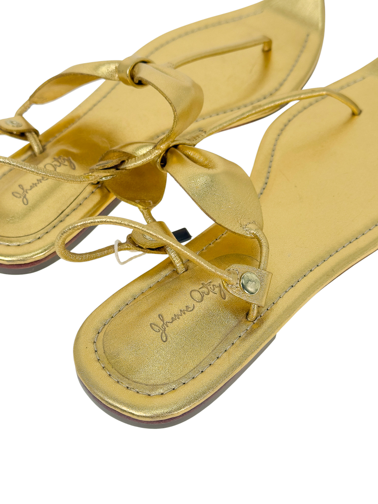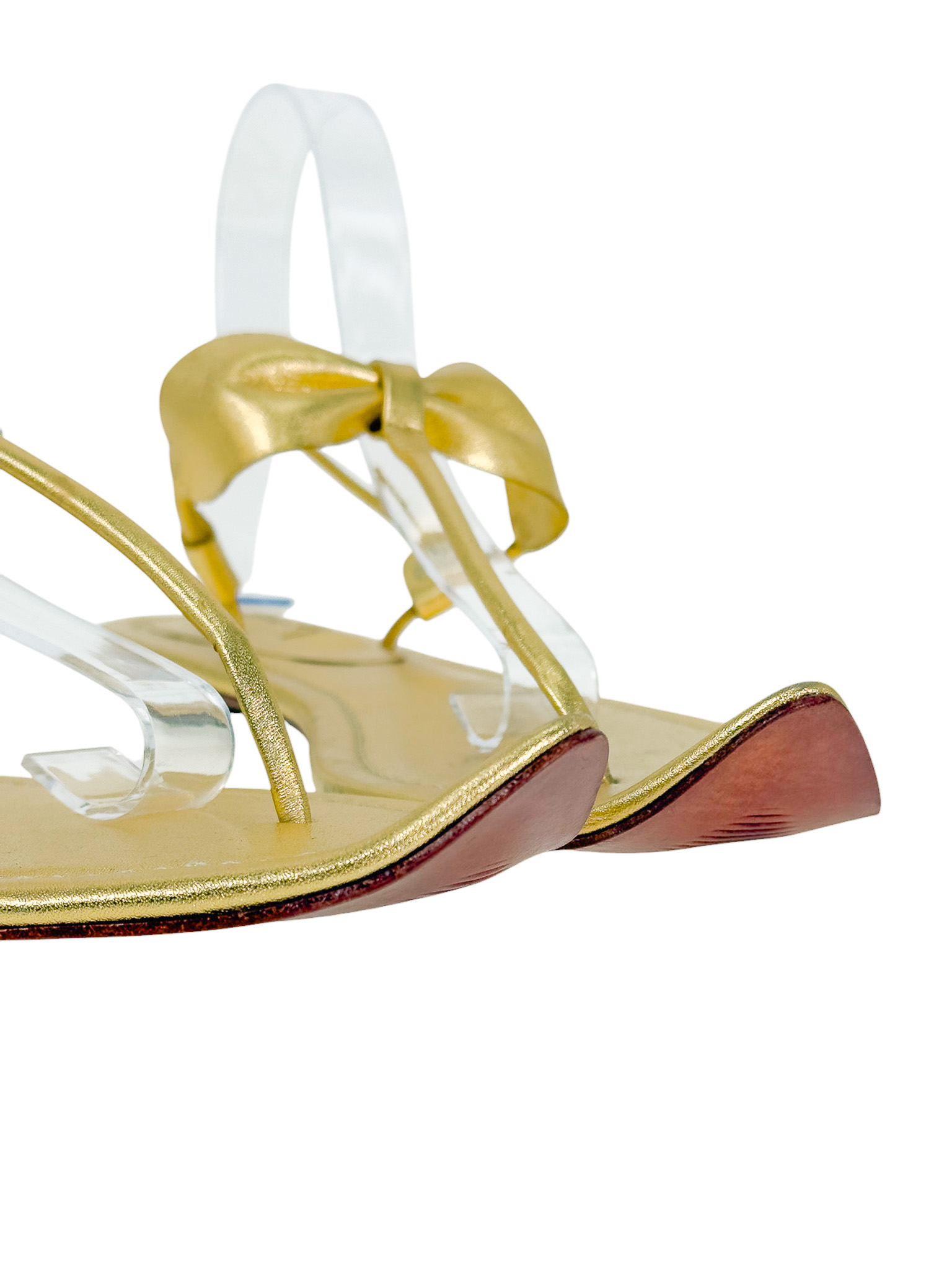 "Złote skórzane sandały, typu japonki, ozdobione kokardą na paskach, zakrzywione noski w szpic, odkryte palce oraz pięta, niski obcas, w zestawie z workiem przeciwkurzowym. Stan nowe. Rozmiar 40."