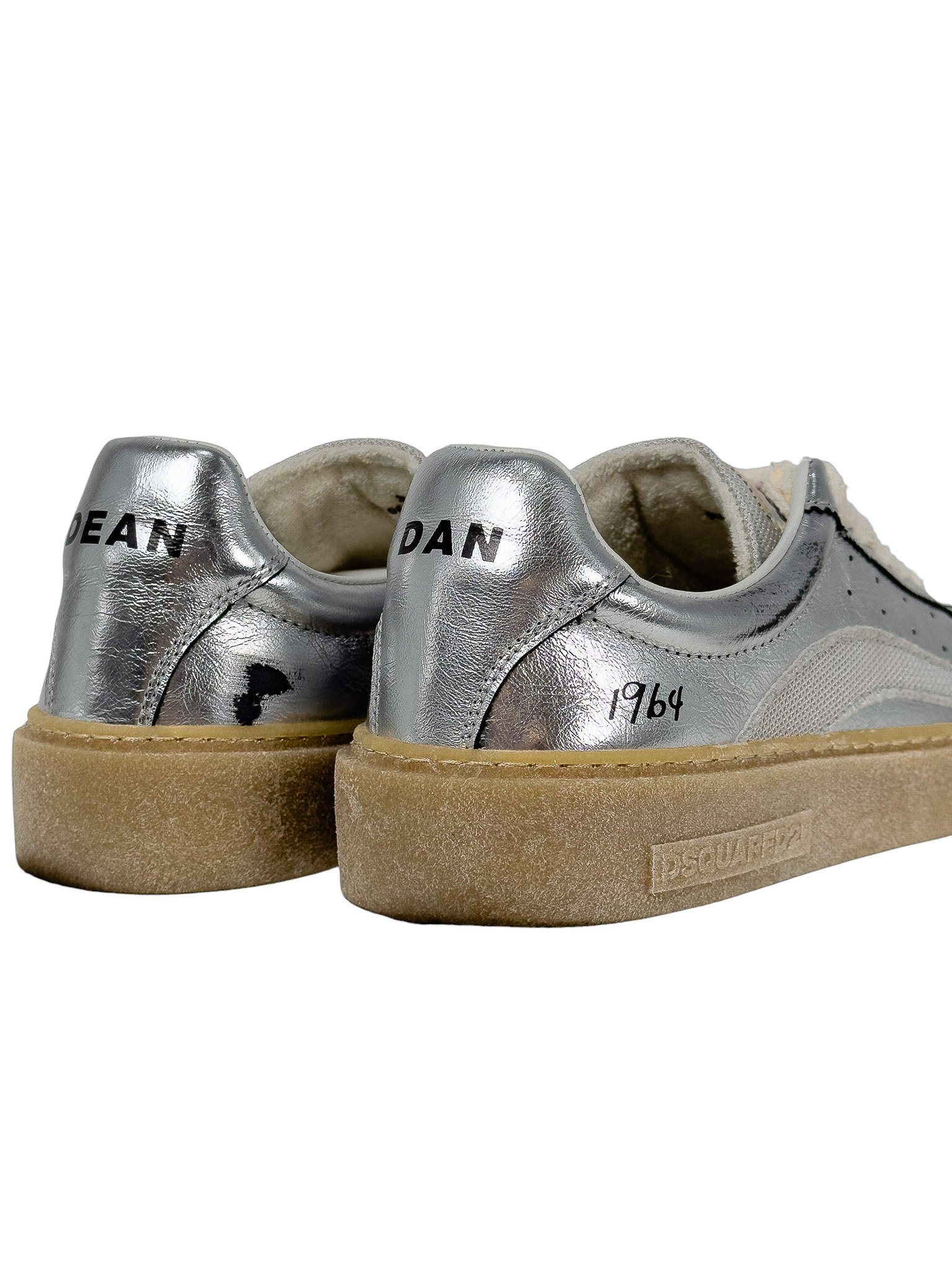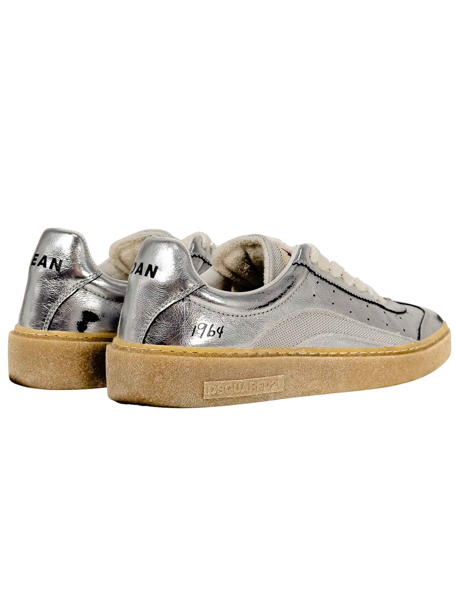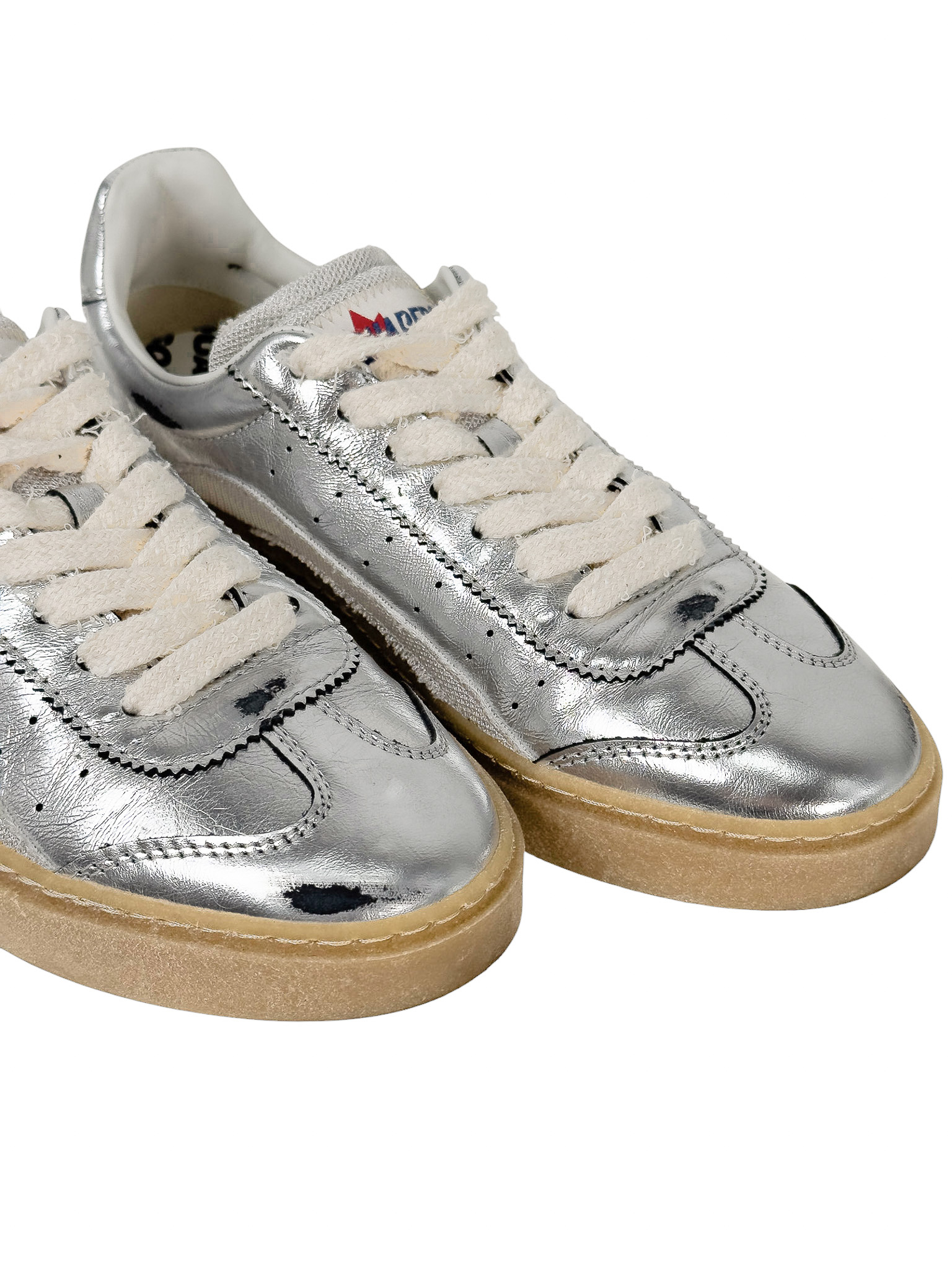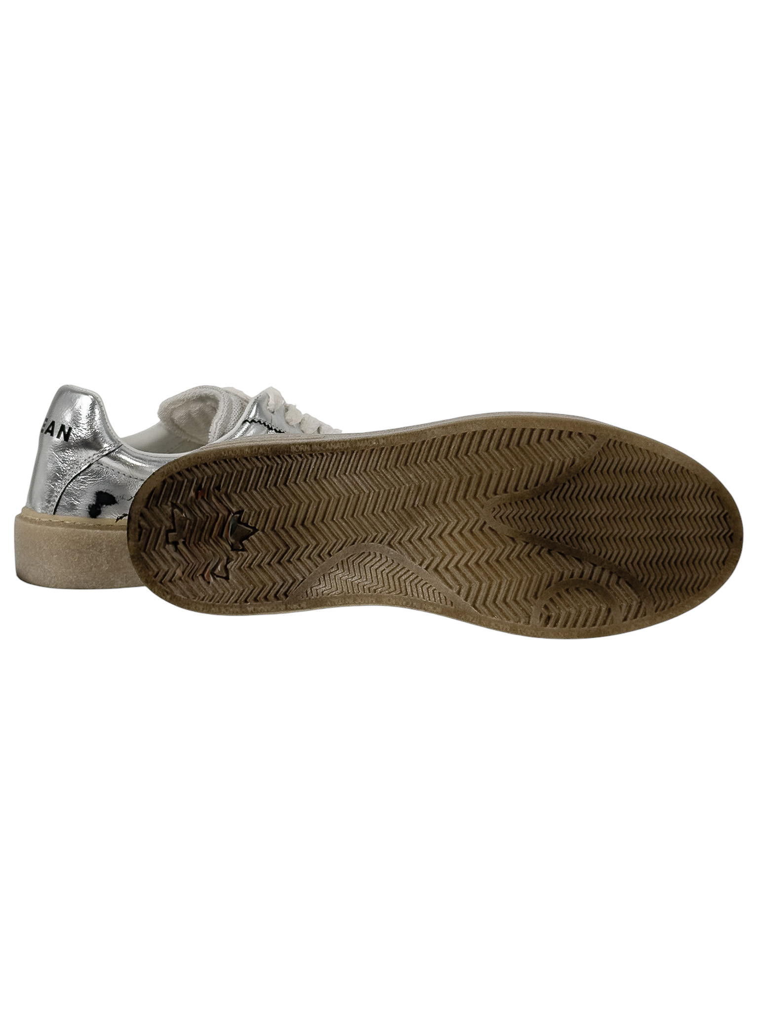 "Srebrne skórzane sneakersy, motyw przetarć, sznurowane beżowe postrzępione sznurówki, gumowa podeszwa z logo marki, zaokrąglone noski. Stan jak nowe. Rozmiar 39."