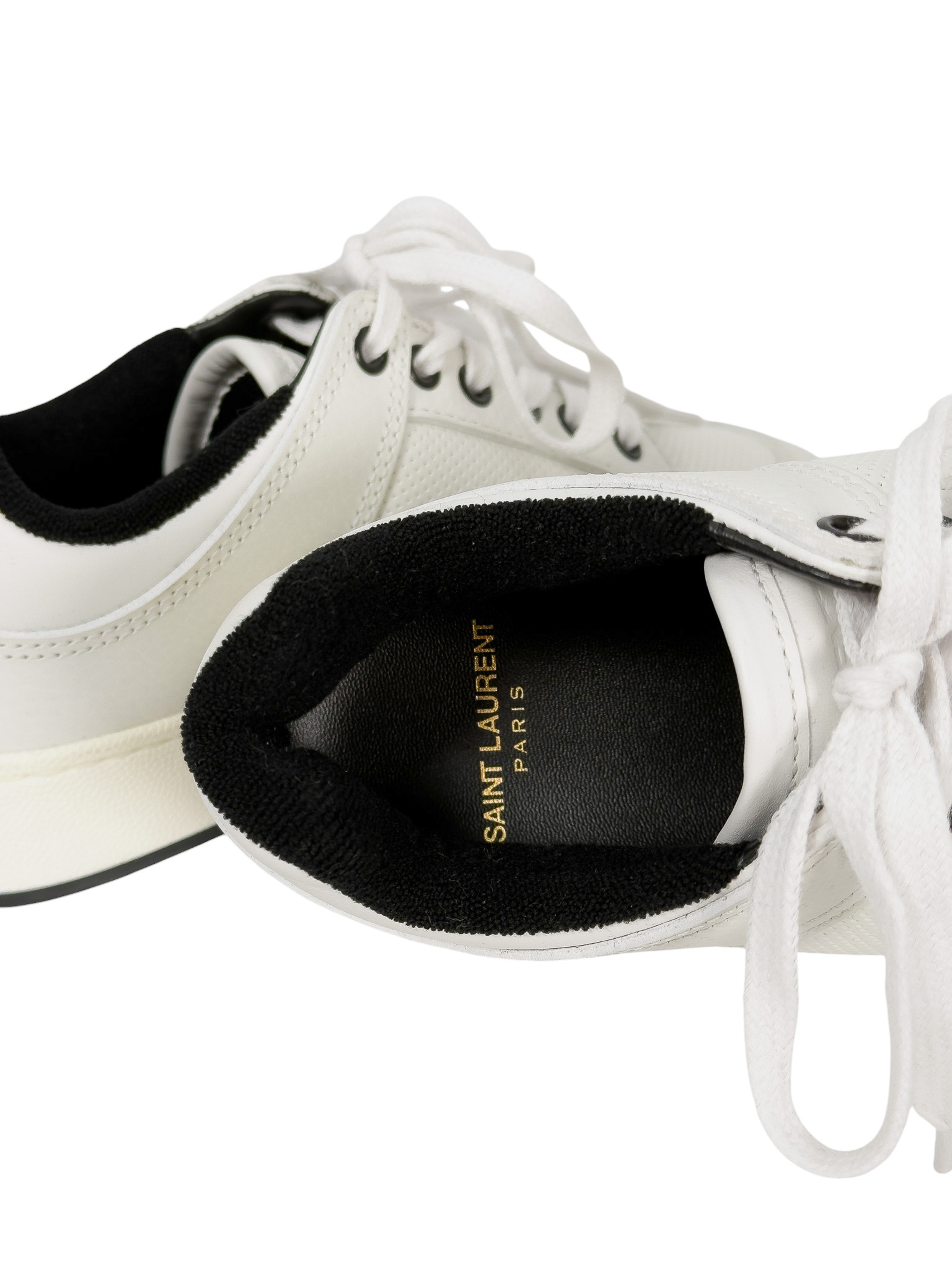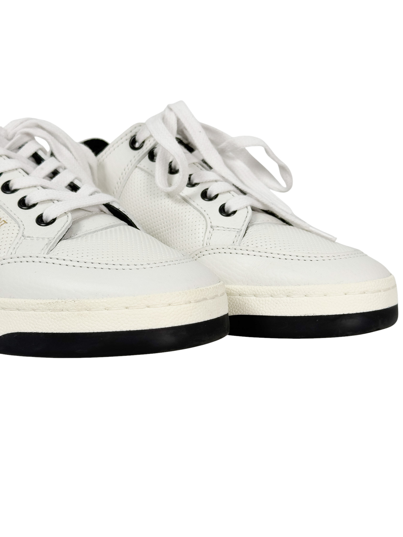 "Białe skórzane sneakersy, sznurowane, złote logo marki w bocznej części oraz na pięcie, częściowo wykończone dziurkami, zaokrąglone noski, czarne wnętrze. Stan bardzo dobry, posiadają delikatne ślady użytkowania, zabrudzenia na podeszwie, w zestawie z workiem przeciwkurzowym. Rozmiar 36."