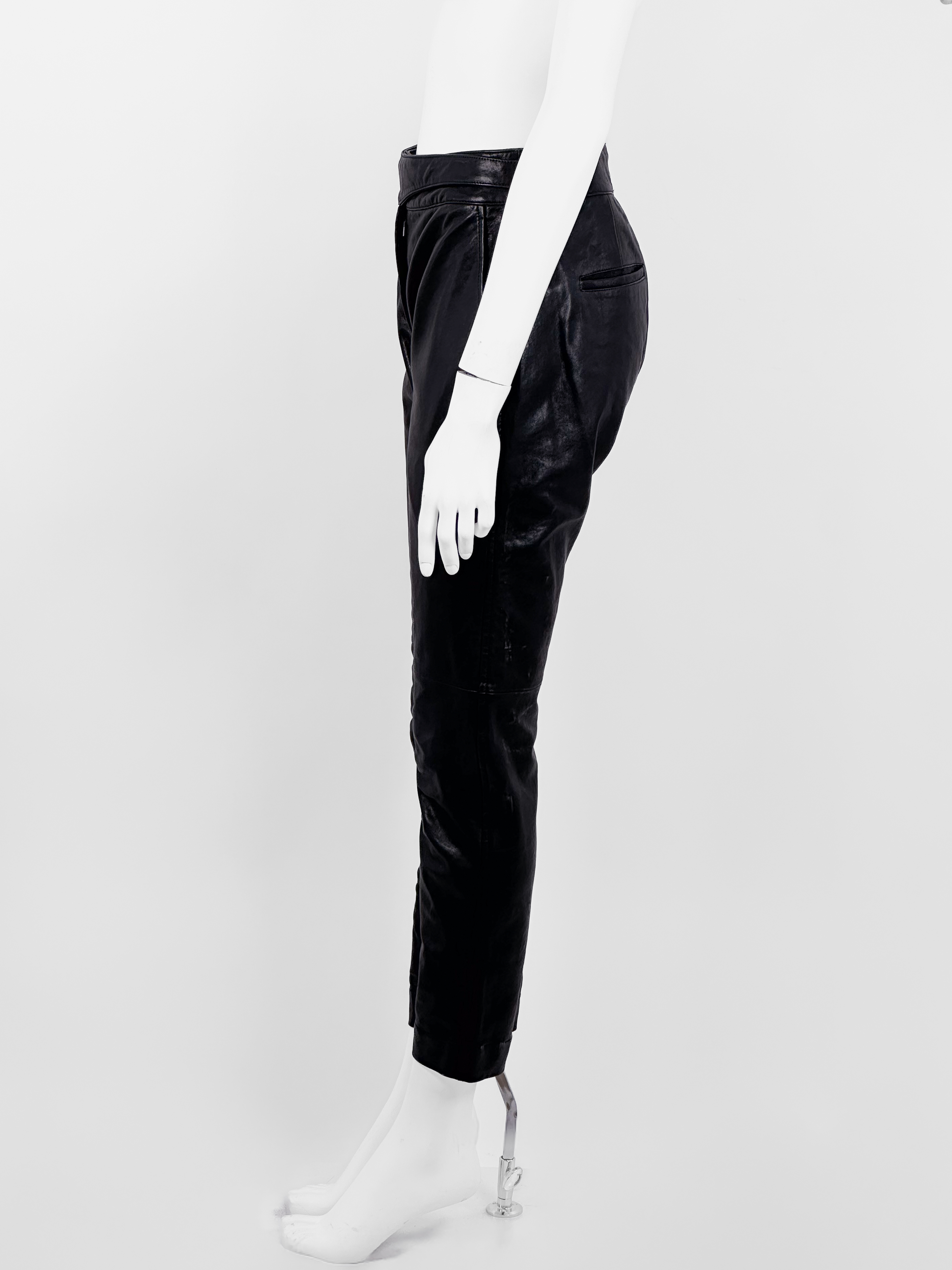 "Czarne skórzane spodnie ze zwężanymi nogawkami, zapinane na zatrzaski oraz kryty suwak, cztery kieszenie. Stan bardzo dobry. Rozmiar z metki 2. Skład: 100% skóra cielęca. Wymiary: szerokość w pasie 38cm, długość całkowita 96cm."