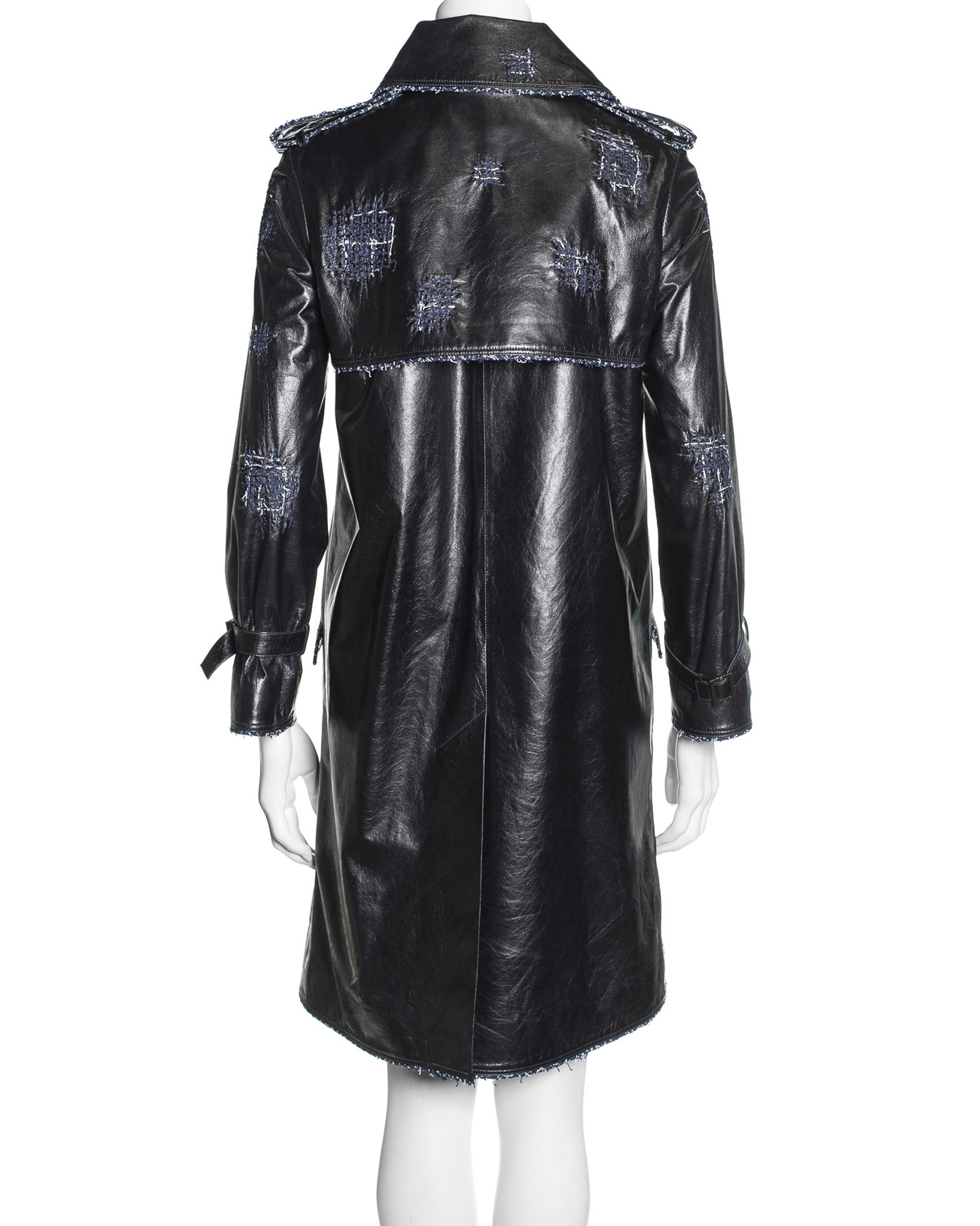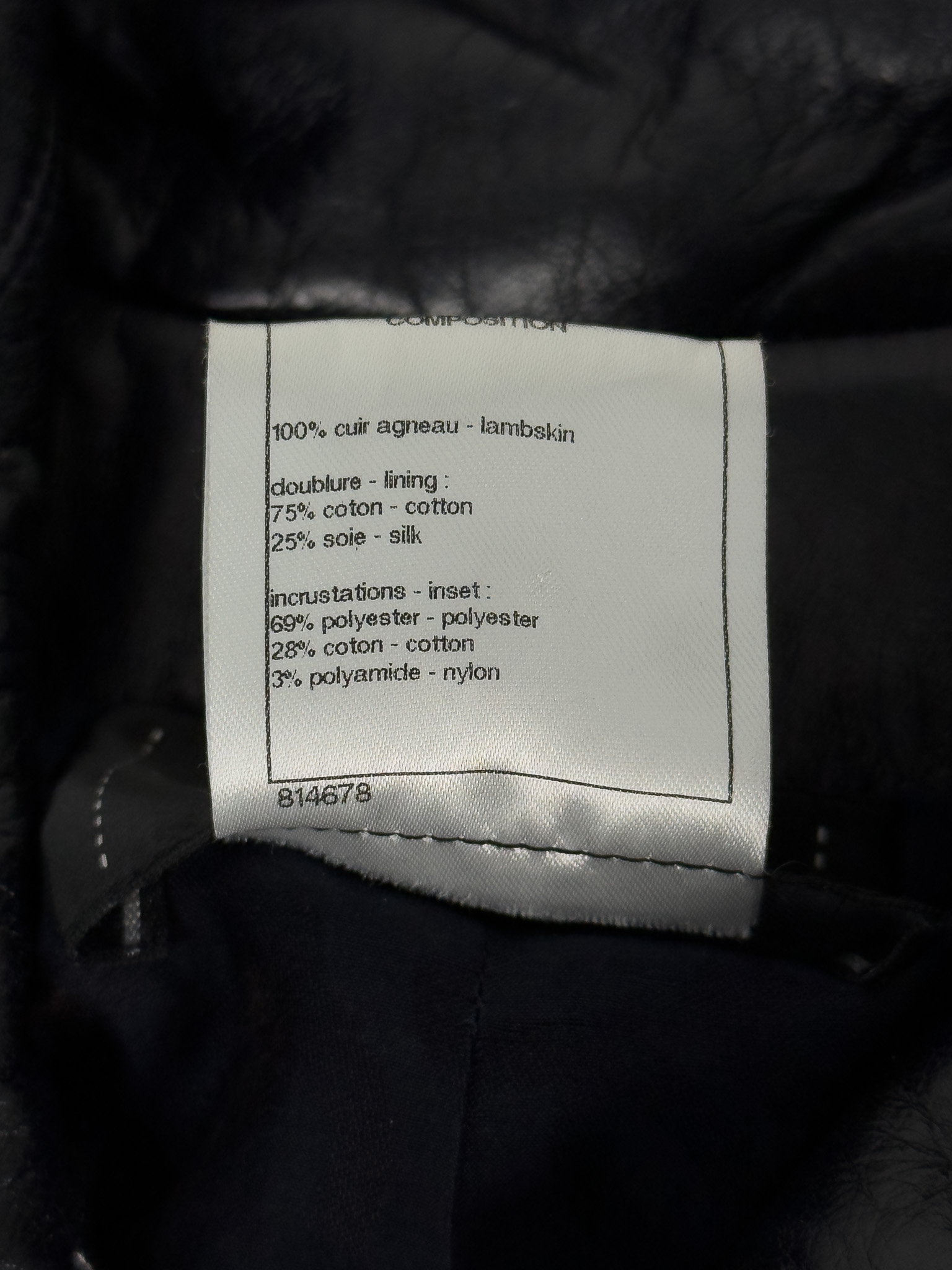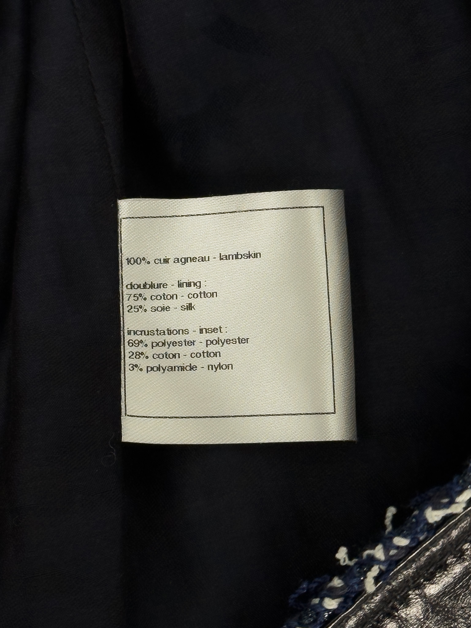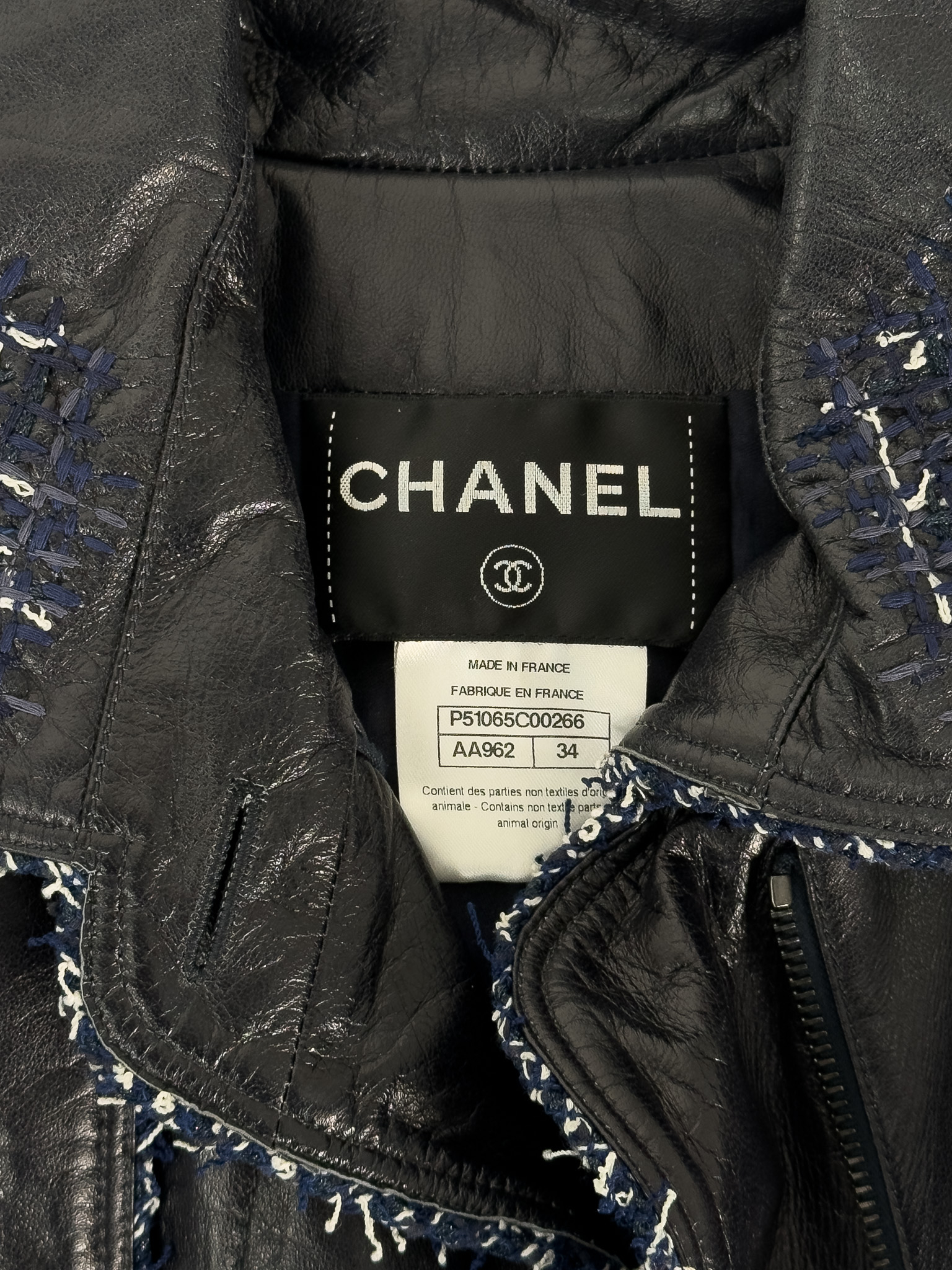 "Granatowy skórzany płaszcz z tweedowym biało-granatowym wykończeniem, srebrne guziki, zapinany na suwak, patki na ramionach. Rozmiar z metki 34. Skład: 100% skóra. Wymiary: długość całkowita 95cm, długość rękawa 59cm, szerokość w biuście 47cm."
