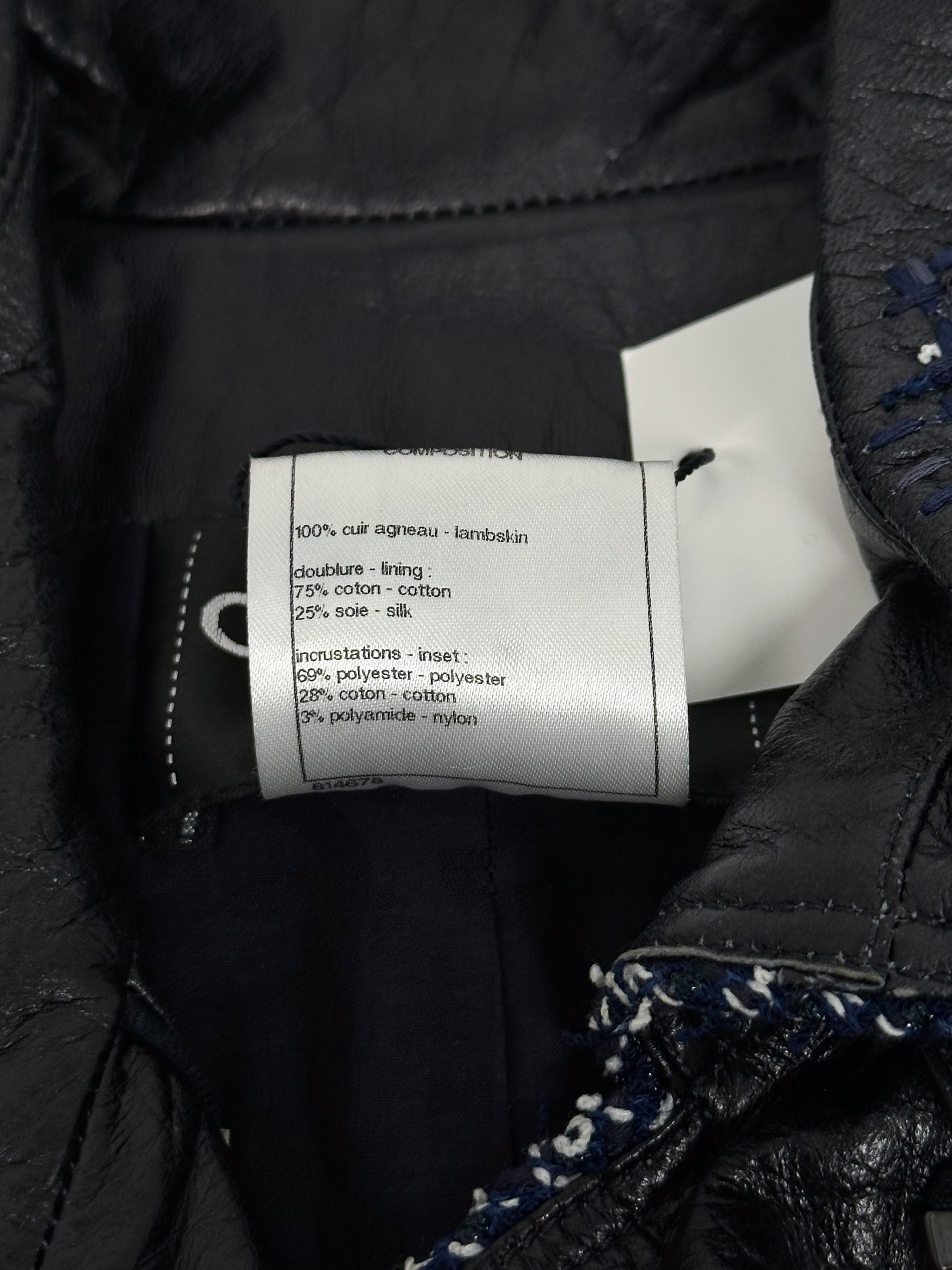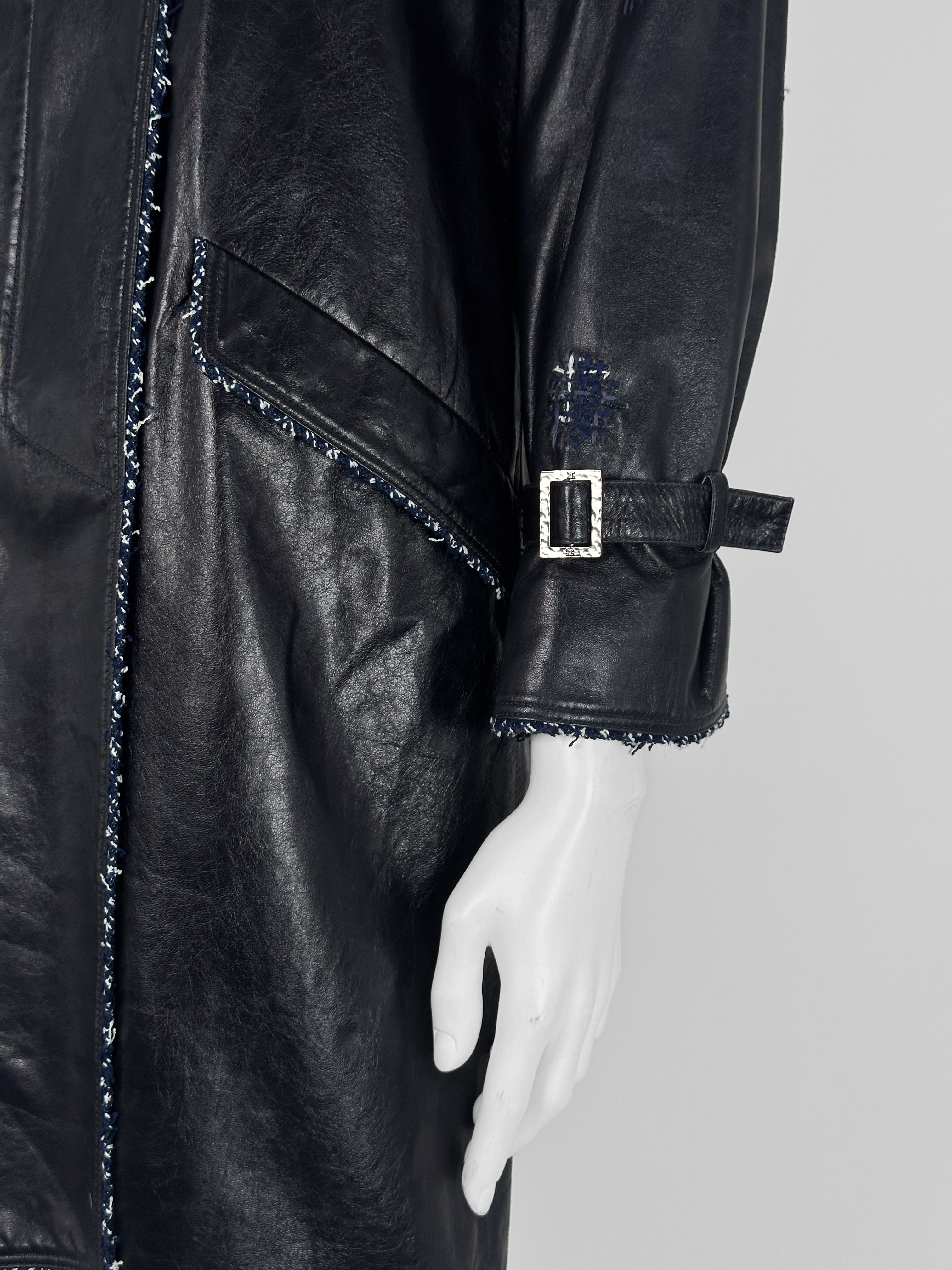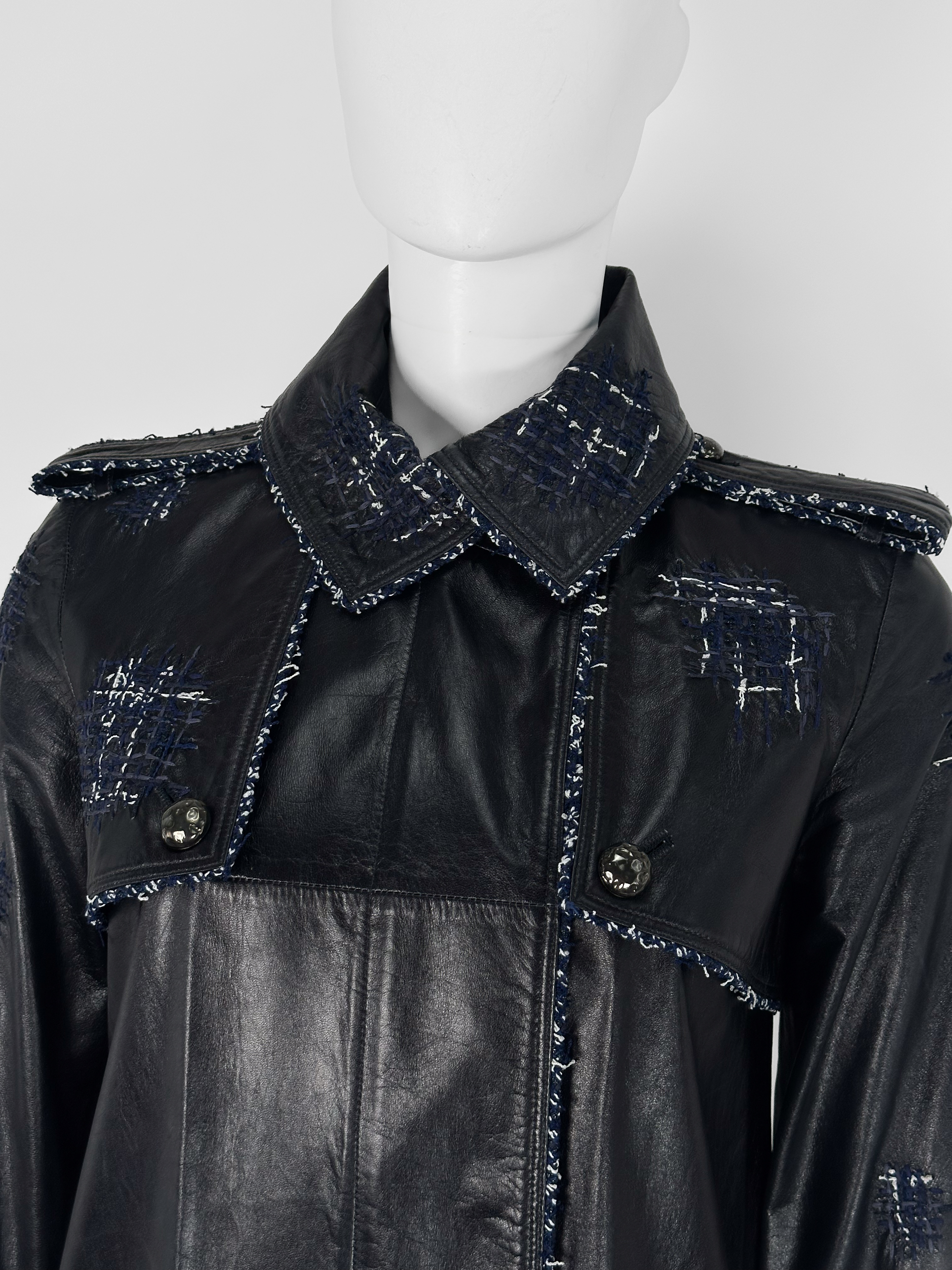 "Granatowy skórzany płaszcz z tweedowym biało-granatowym wykończeniem, srebrne guziki, zapinany na suwak, patki na ramionach. Rozmiar 34. Skład: 100% skóra."