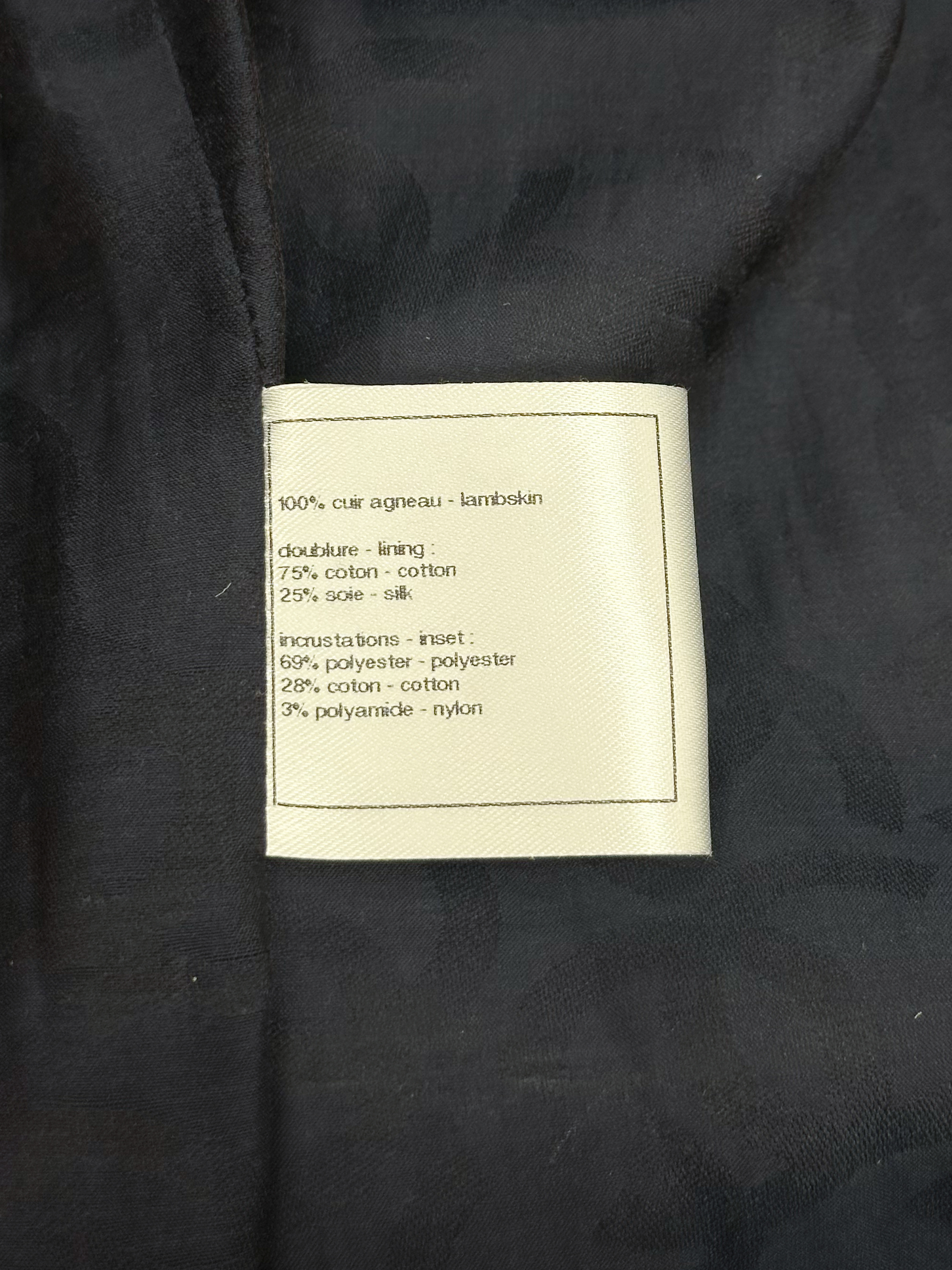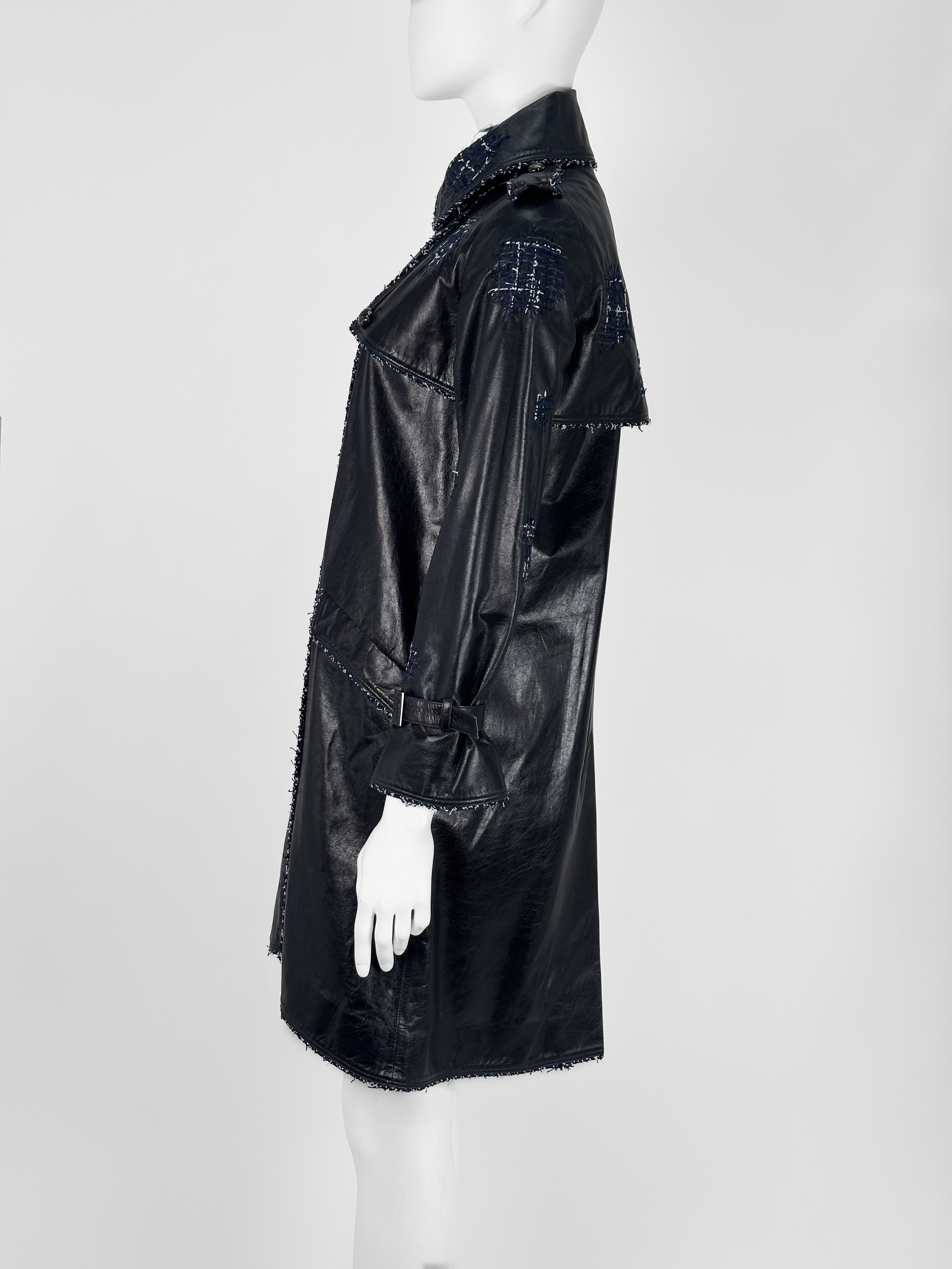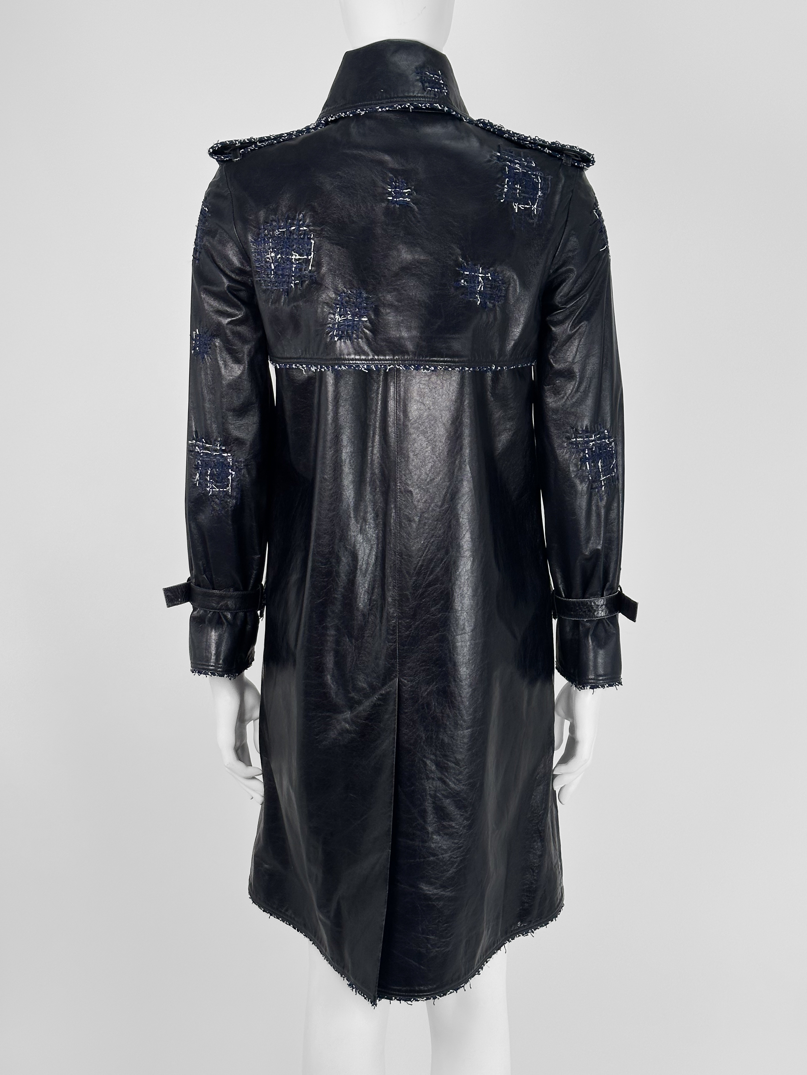 "Granatowy skórzany płaszcz z tweedowym biało-granatowym wykończeniem, srebrne guziki, zapinany na suwak, patki na ramionach. Rozmiar 34. Skład: 100% skóra."