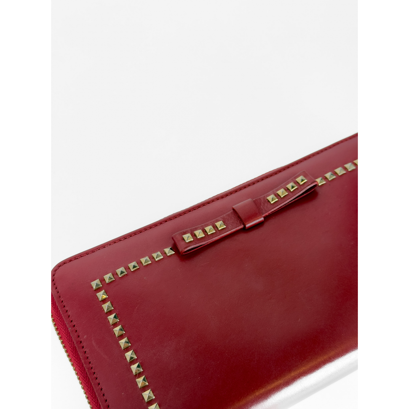 "Czerwony duży skórzany portfel ozdobiony kokardą oraz złotymi dżetami, prostokątny kształt, zapinany na złoty logowany suwak, wytłaczane logo marki w tylnej części, wewnątrz zasuwana kieszeń na monety, przegrody na karty oraz banknoty, używany. Stan dobry, delikatne rysy na skórze oram metalowych elementach, przetarcia na rogach. Wymiary: szerokość 19,5cm, wysokość 10,5cm."