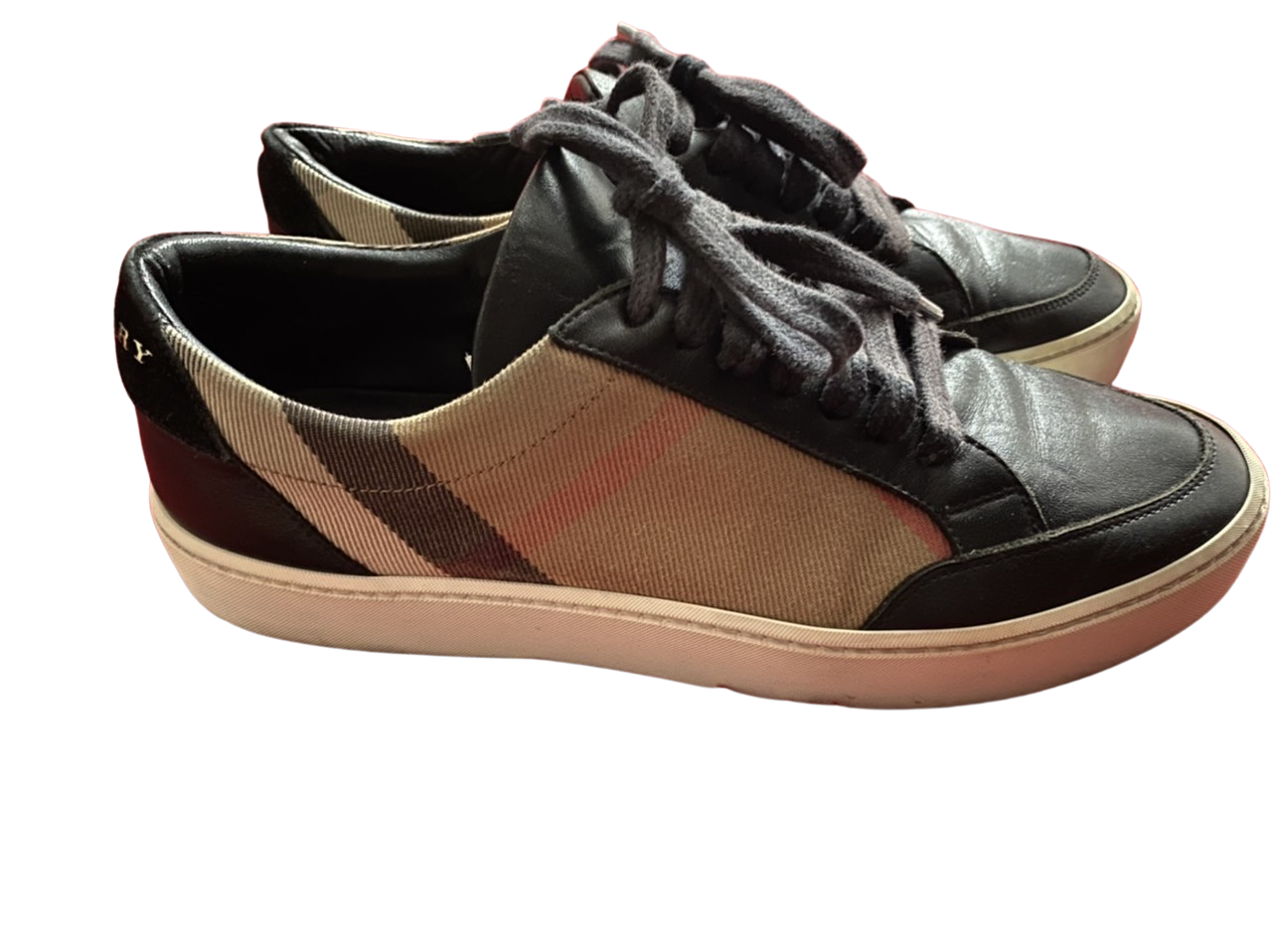 "Sneakersy Burberry , rozmiar 37. Na zdjęciu pokazane wady: na lewym bucie, z tylu brak liter oraz lekko wyblakły kolor w dwóch miejscach. Poza tym stan butów bardzo dobry."