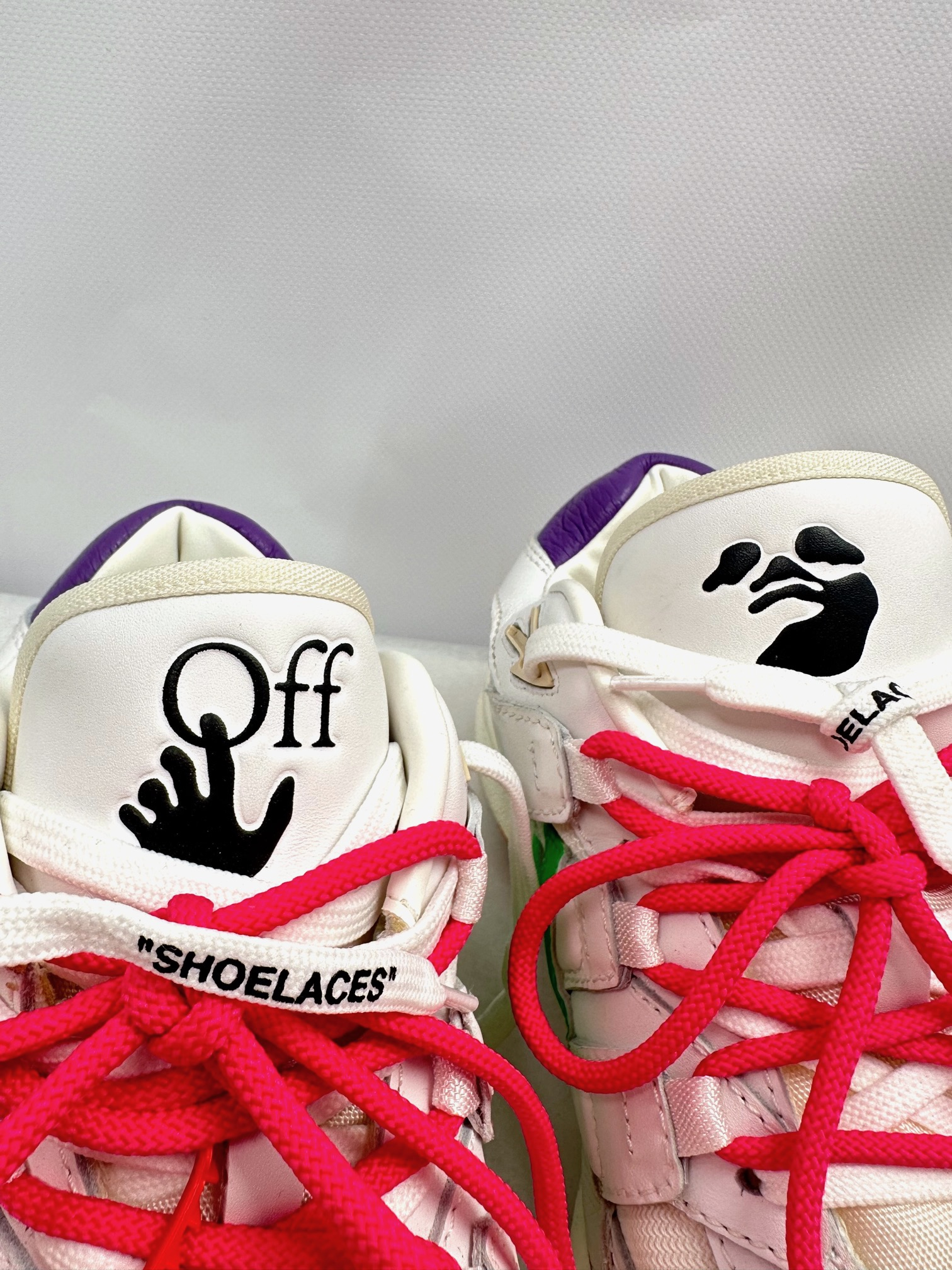 "białe sneakersy z kolorowymi wstawkami, zielony i fiolet, sznurówki w kolorze neonowego różu, antypoślizgowa podeszwa, stan dobry, widoczne drobne zabrudzenia. Rozmiar 40."