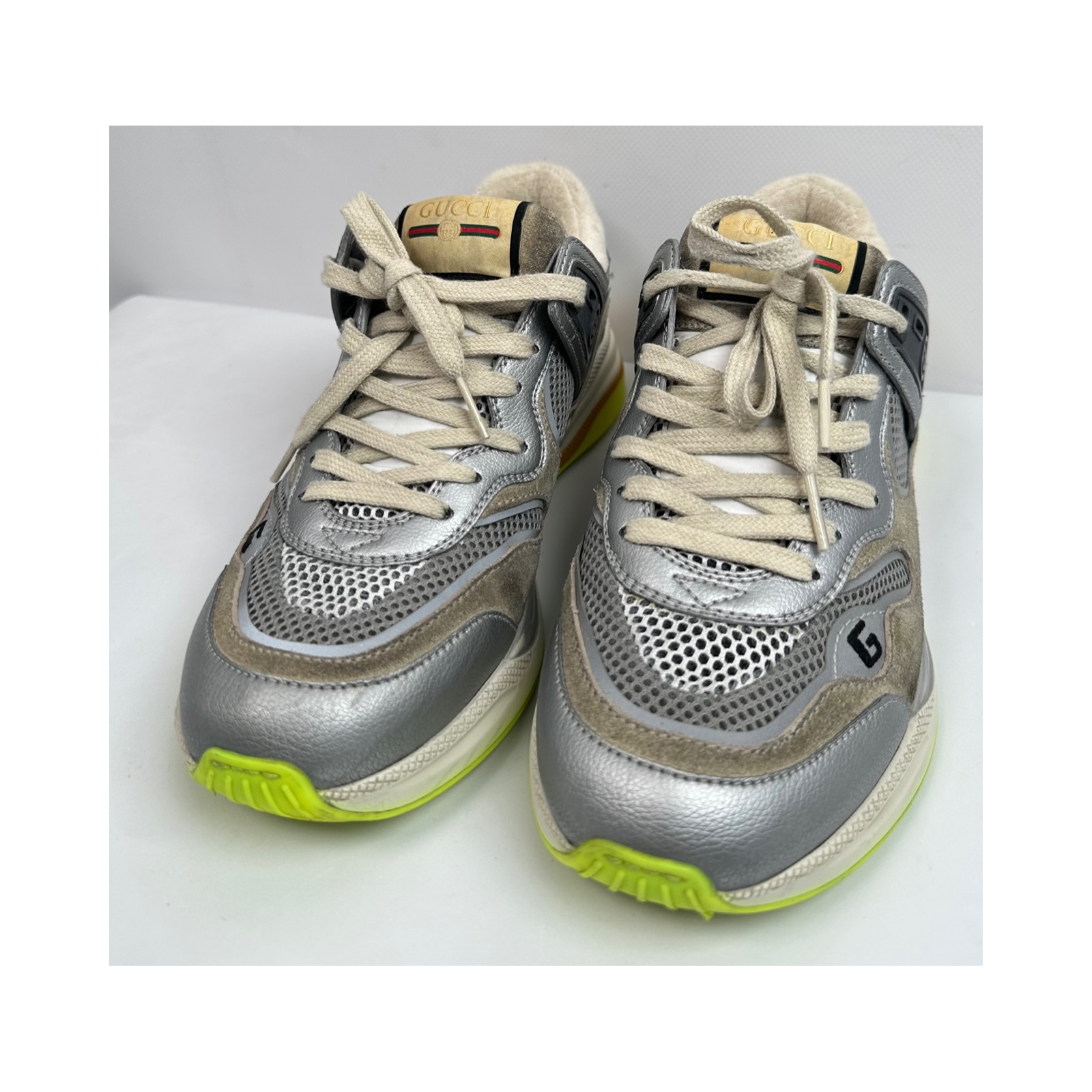 "Srebrno-szare snekaresy wykonane z łączonych materiałów, skórzane i zamszowe wstawki, siatka w przedniej części, sznurowane, zaokrąglone noski, gumowa biało-pomarańczowo-żółta podeszwa, logo marki z boku, na podeszwie, przy sznurówkach oraz na języku, wnętrze wykonane z tkaniny frotte w kolorze kremowym, używane. Stan bardzo dobry, lekko zabrudzona podeszwa. Rozmiar 39."