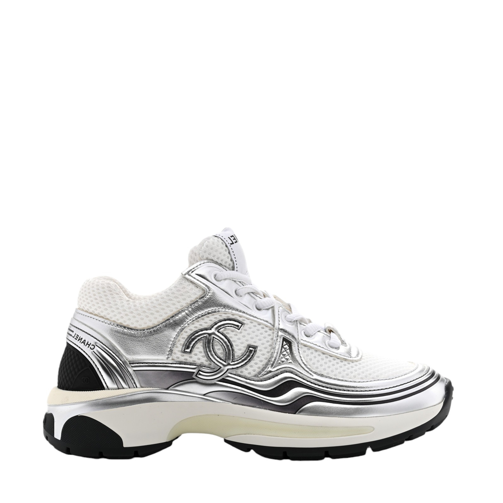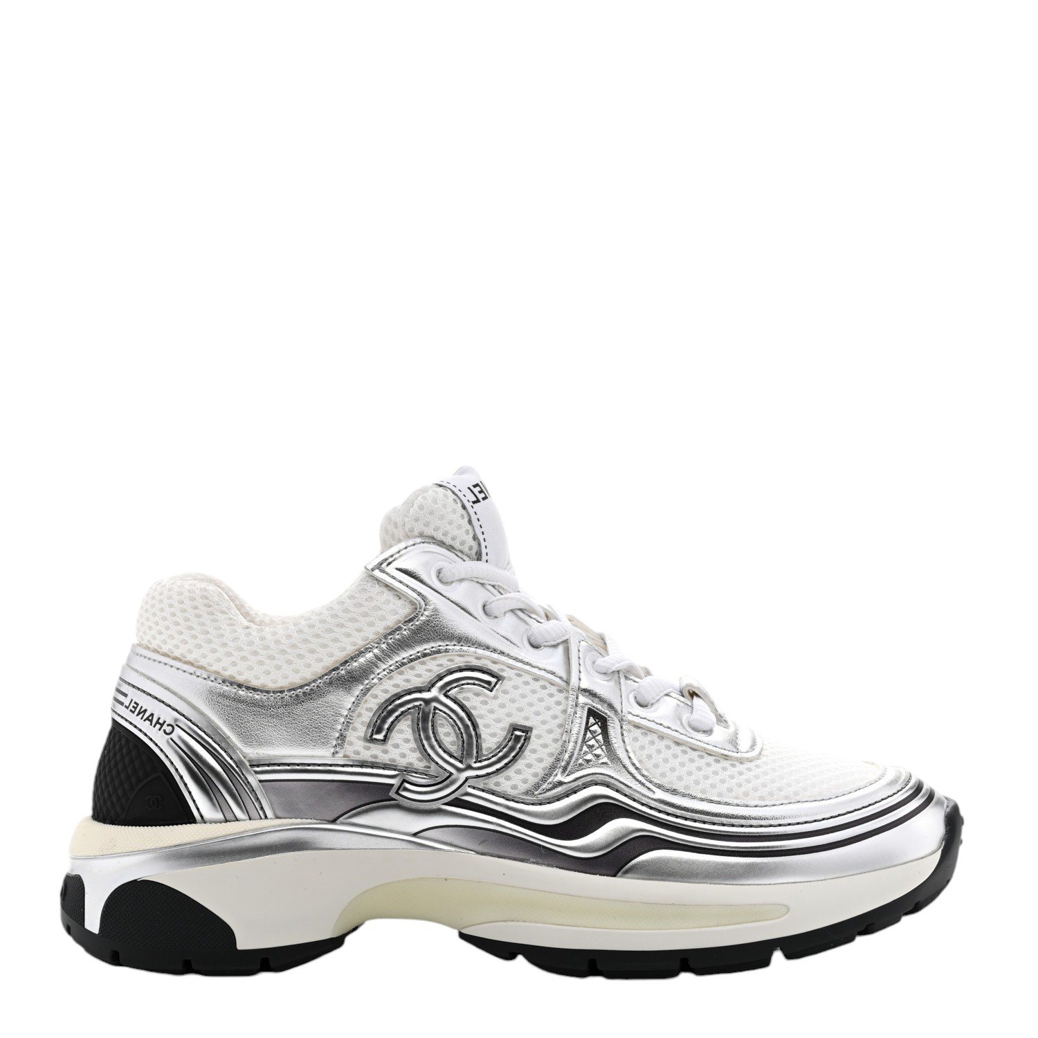 "Biało-srebrne sneakersy wykonane z łączonych materiałów, zaokrąglone noski, sznurowane, białe/szare sznurówki, duże srebrne skórzane logo marki w bocznej części, mniejsze w tylnej oraz na języku i noskach, gumowa podeszwa, w zestawie z pudełkiem, zapasowymi sznurówkami oraz workami przeciwkurzowymi, używane. Stan bardzo dobry, delikatne zabrudzenia na skórze, marszczenia na skórze. Rozmiar 36."