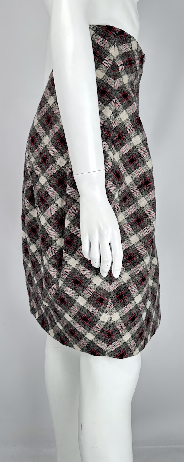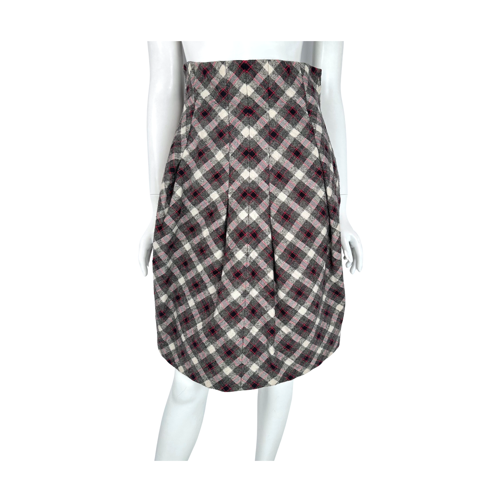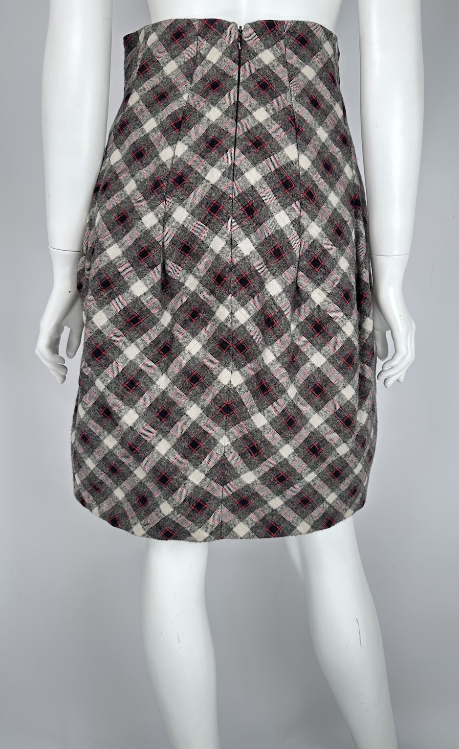 "Szara spódnica w czerwono-czarno-szarą kratę, taliowana, o kroju bombki, dekoracyjne przeszycia, wysoki stan, długość do kolan, zapinana z tyłu na kryty suwak oraz haftkę. Rozmiar z metki IT 40. Skład: 51% bawełna, 49% wełna; podszewka: 52% acetat, 48% wiskoza. Wymiary: szerokość w pasie 35cm, długość całkowita 60cm."