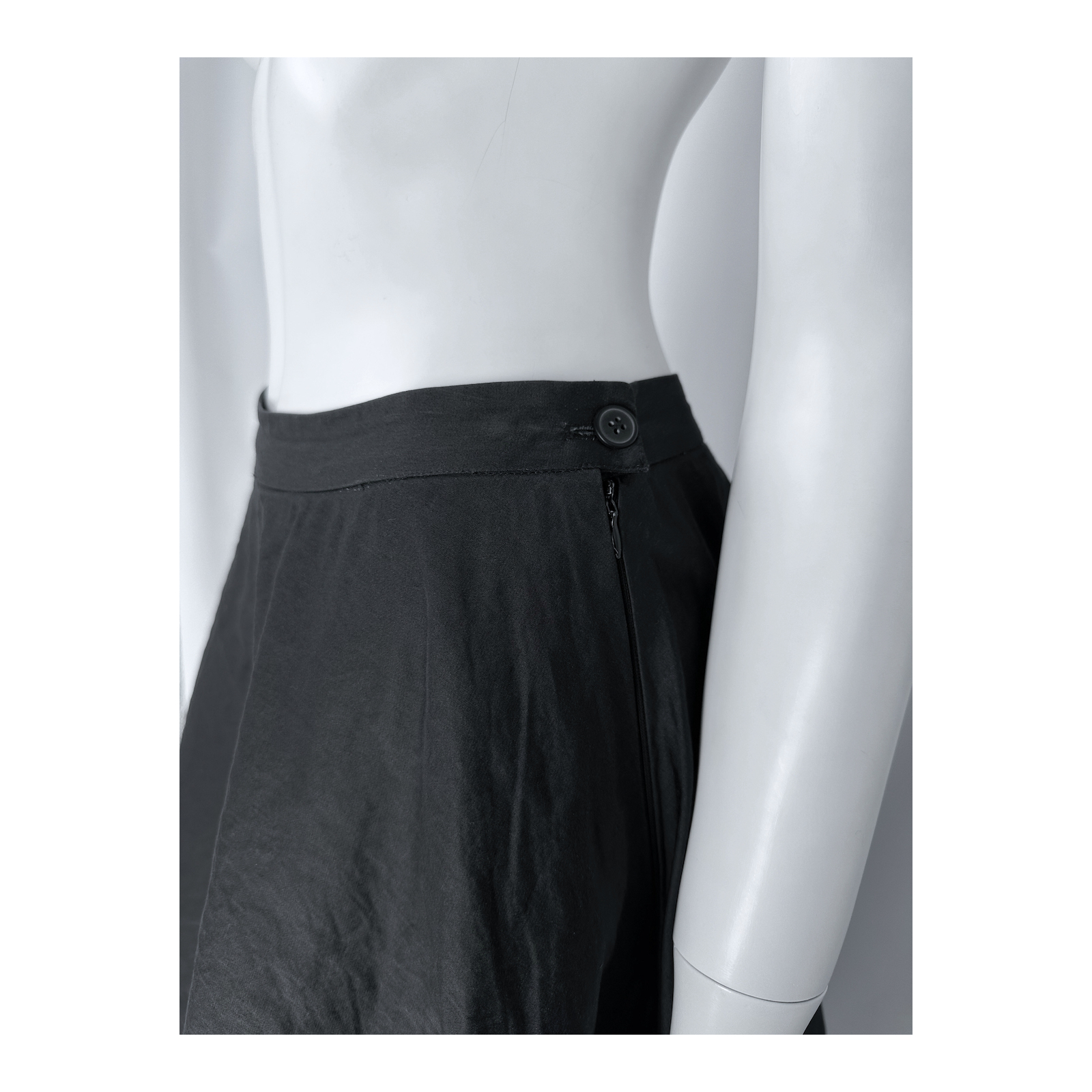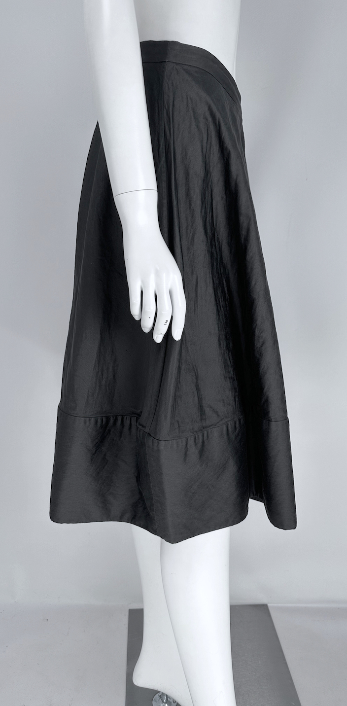 "Czarna bawełniana spódnica, połyskujący materiał, długość do kolan, wysoki stan, zapinana z boku na kryty suwak oraz guzik, rozszerzana ku dołowi, rozkloszowana, szeroki pas dołu, błyszcząca podszewka. Brak metki ze składem, rozmiarowo wypada jak M. Skład: 50% bawełna, 44% rayon, 6% włókno metaliczne. Wymiary: szerokość w pasie 36cm, długość całkowita 63cm."