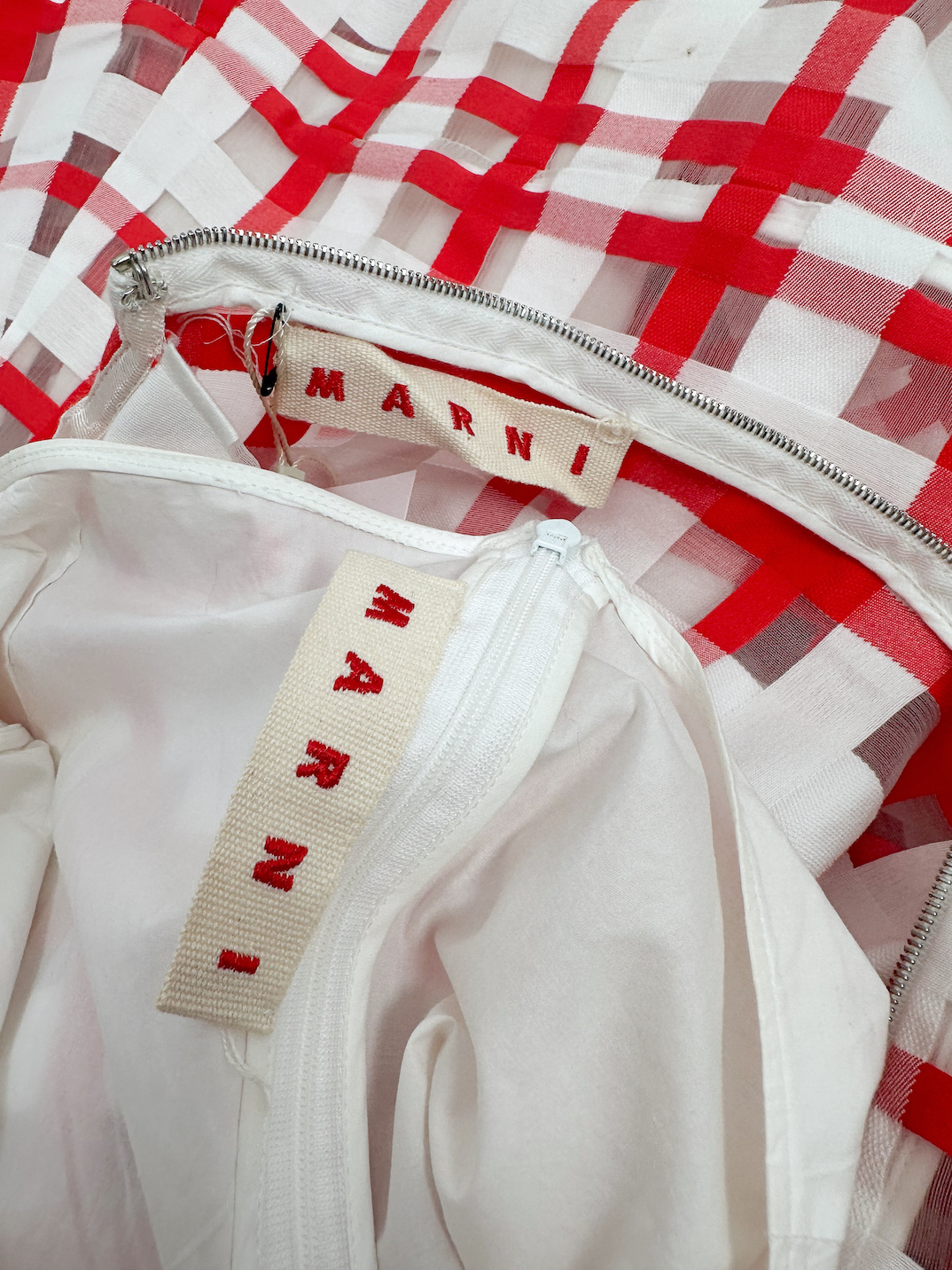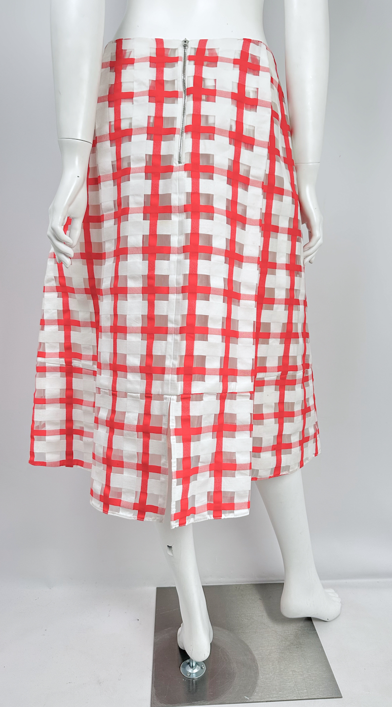 "Spódnica w biało-czerwoną kratę, półtransparentna, sztywny materiał, rozszerzana ku dołowi, rozkloszowana, plisowana, długość za kolano, wysoki stan, rozporek z tyłu, zapinana na srebrny suwak z tyłu, dwie kryte kieszenie bo bokach, przyszyta biała podszewka. Rozmiar z metki IT 42. Skład: podszewka: 100% bawełna. Wymiary: szerokość w pasie 38cm, długość całkowita 71cm."
