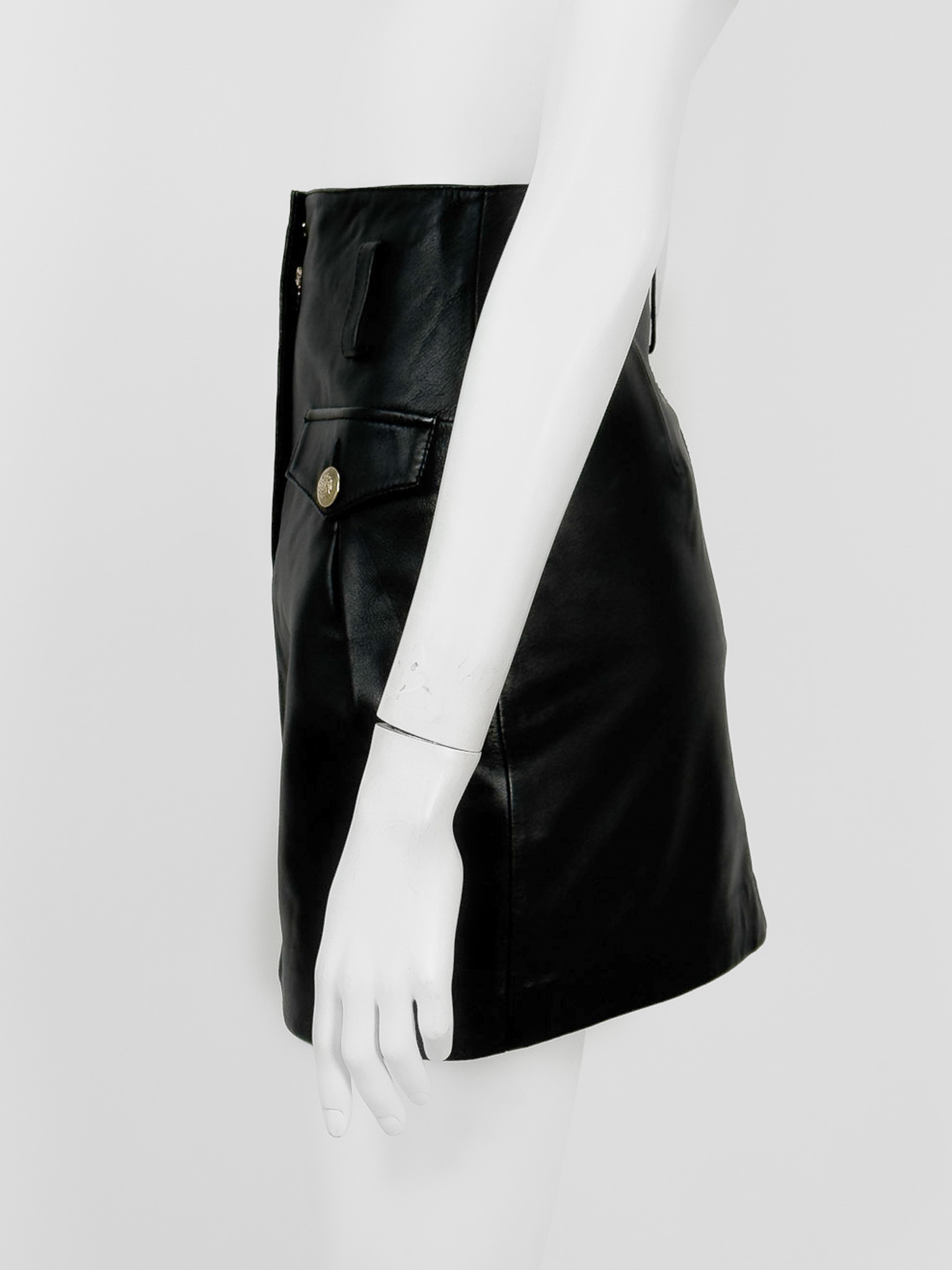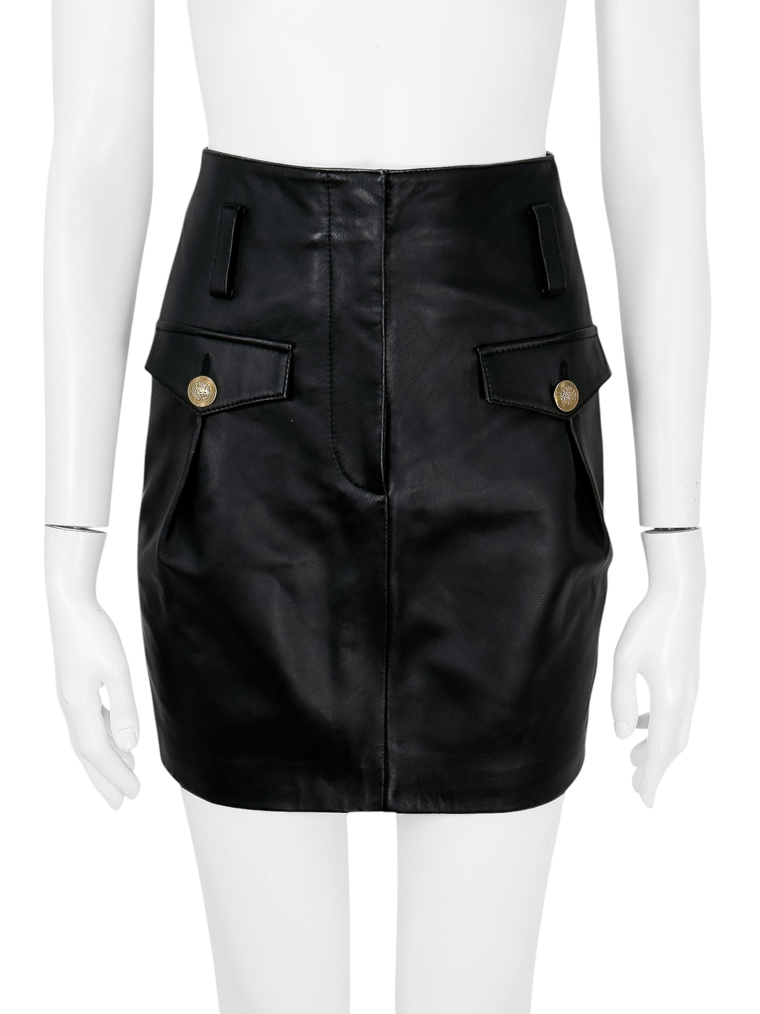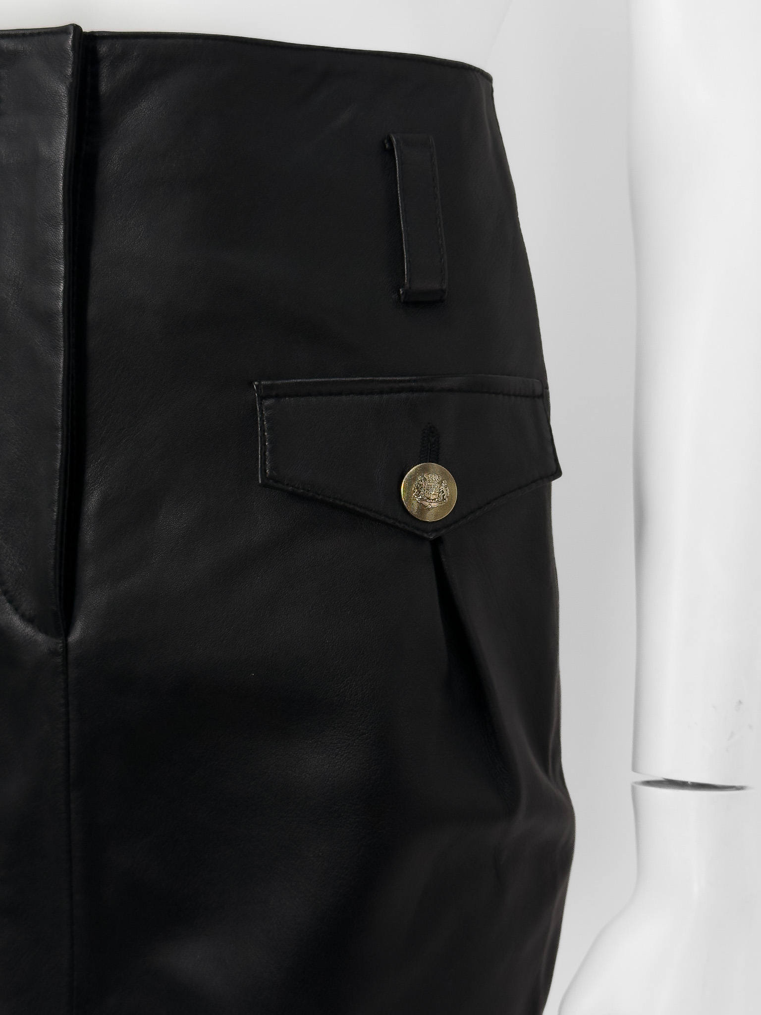 "Czarna spódnica skórzana, długość mini, dwie klapy na przodzie ozdobione złotymi guzikami z grafiką korony, zapinana na kryty suwak oraz zatrzask, szlufki w pasie. Stan nowa z metką. Rozmiar z metki 34. Skład: materiał podstawowy jagnię, podszewka: 100% poliester. Wymiary: szerokość w pasie 31cm, długość całkowita 43cm."