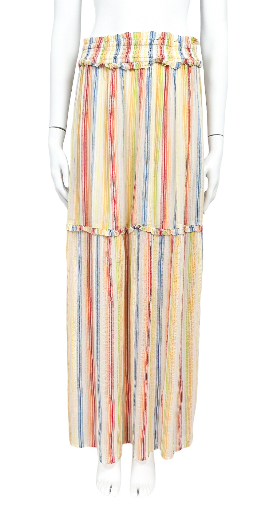 "Kolorowa spódnica w pionowe pasy w odcieniach niebieskiego, czerwonego, pomarańczowego, zieloni, żółci oraz bieli, rozcięcie w bocznej części, szeroka guma w pasie, długość maxi, delikatnie rozkloszowana. Skład: 50% bawełna, 50% wiskoza; podszewka: 100% rayon. Wymiary: szerokość w pasie 35cm, długość całkowita 110cm."