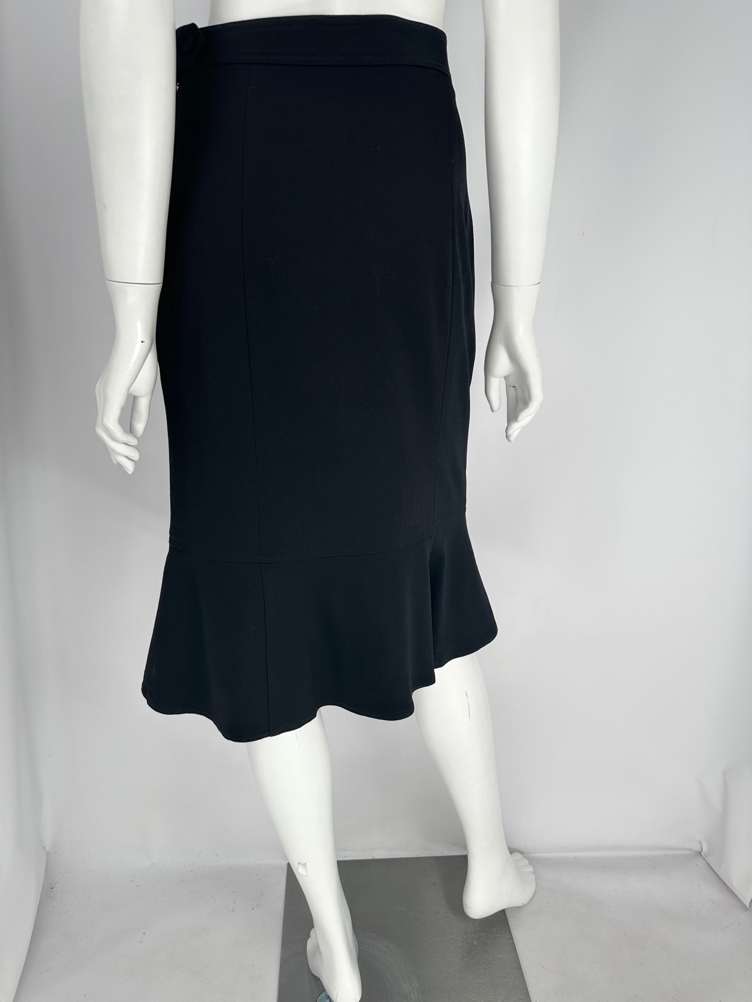 "Czarna wełniana spódnica, vintage, prosty krój, dekoracyjna falbana na przodzie oraz na zakończeniu, długość do kolan, wysoki stan, zapinana na metalowy logowany zamek oraz guzik z boku. Rozmiar z metki FR 38. Skład: 98% wełna, 2% elastan.