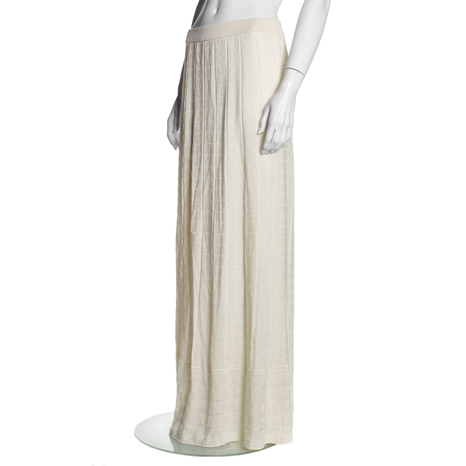 "Kremowa, dzianinowa spódnica maxi, dziergana. Rozmiar 44. Skład 54% wełna 46% viskoza. Wymiary: talia 37 cm, długość całkowita 113 cm"