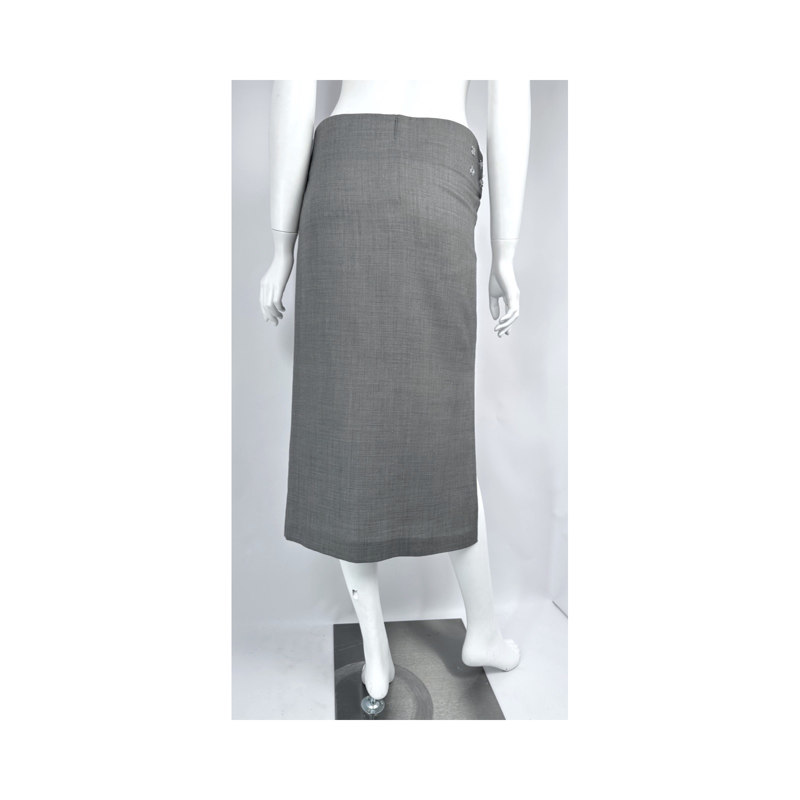 "szara ołówkowa spódnica midi, z boku rozcięcie, w talii gumka oraz zatrzaski z jednej strony. Rozmiar 38. Skład: 90% poliester, 10% wełna. Wymiary: szer. talii 41 cm, szer. bioder 44 cm, dł. całkowita 56 cm."