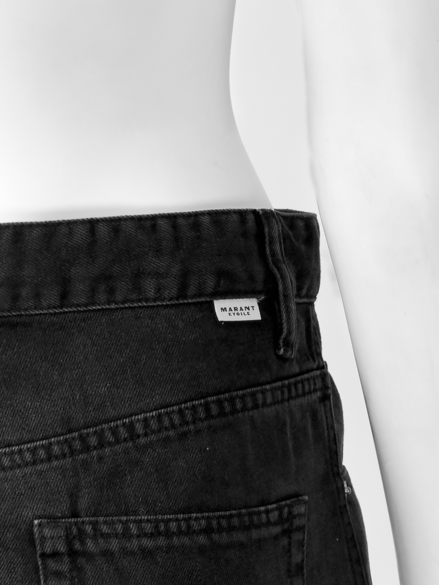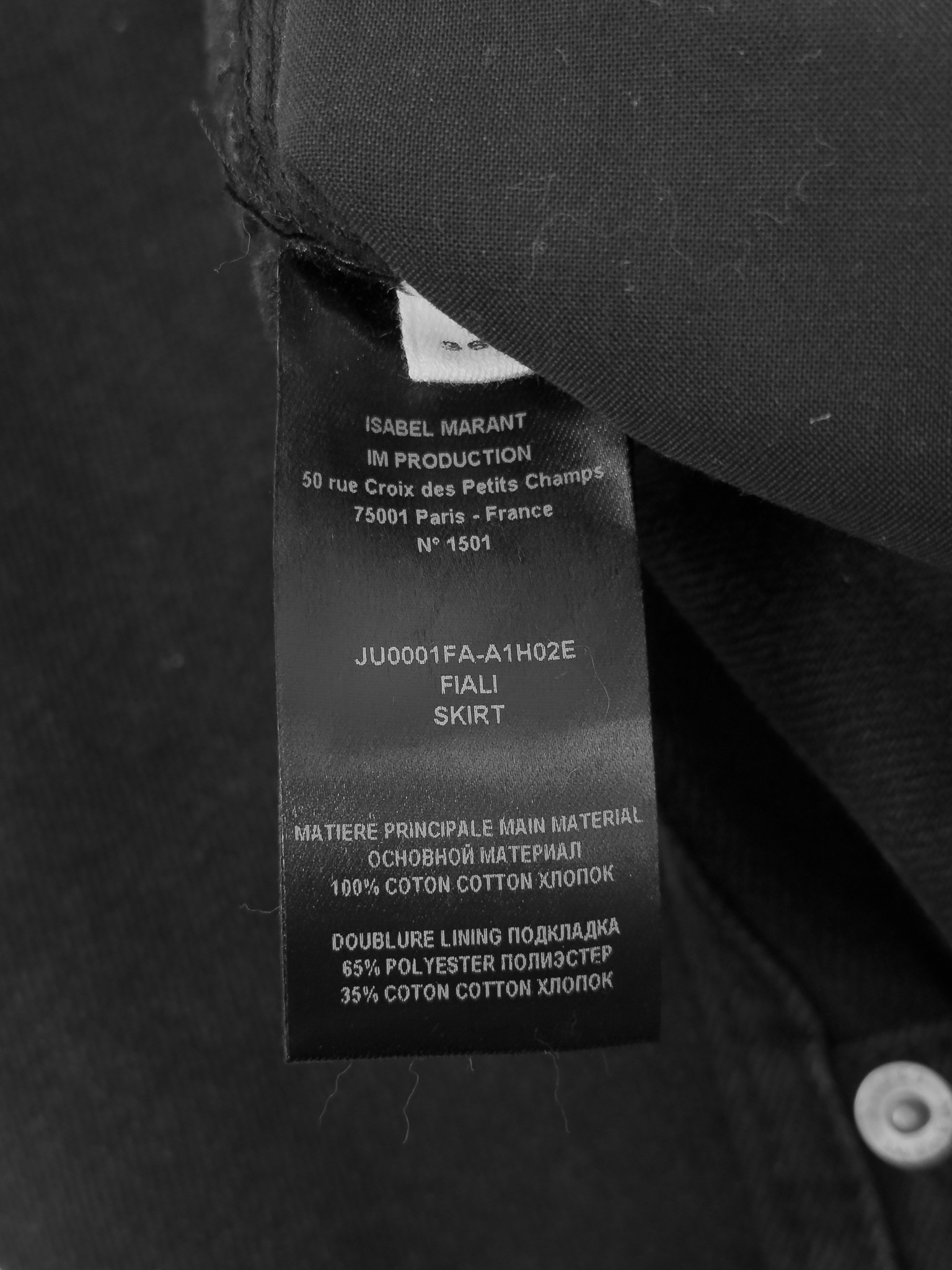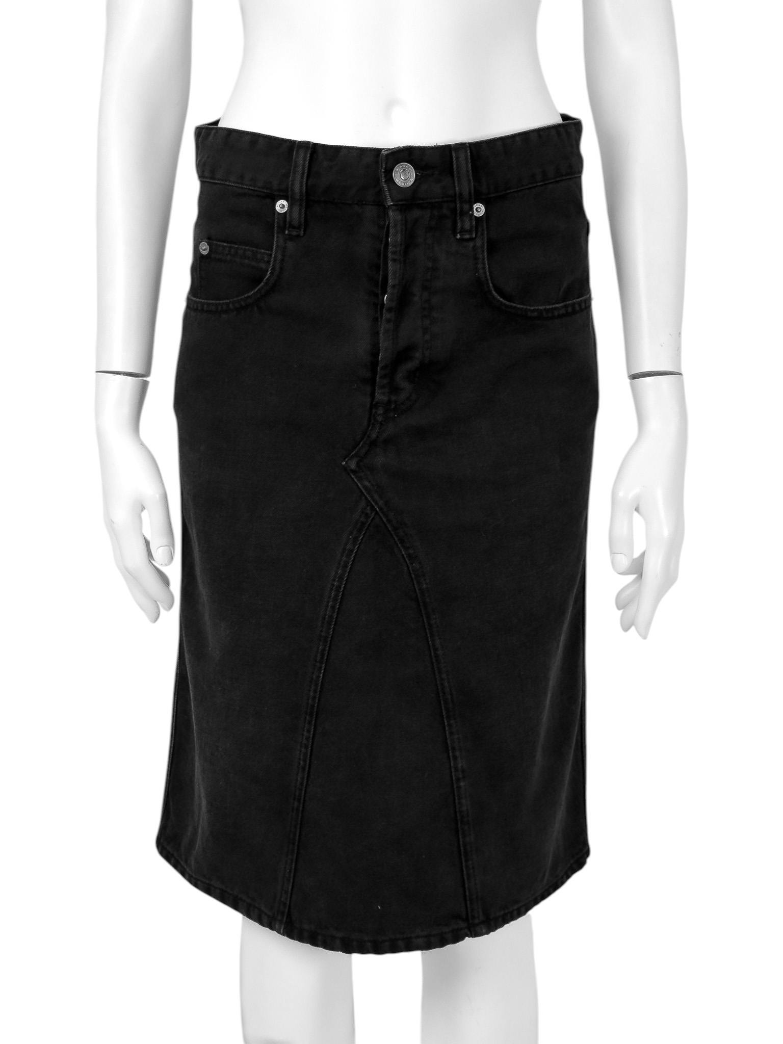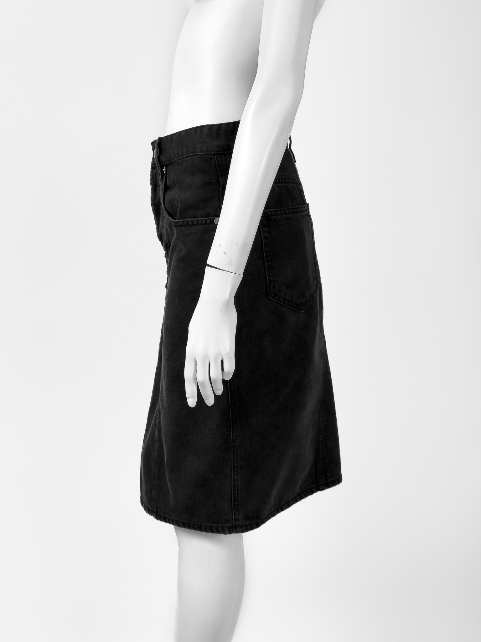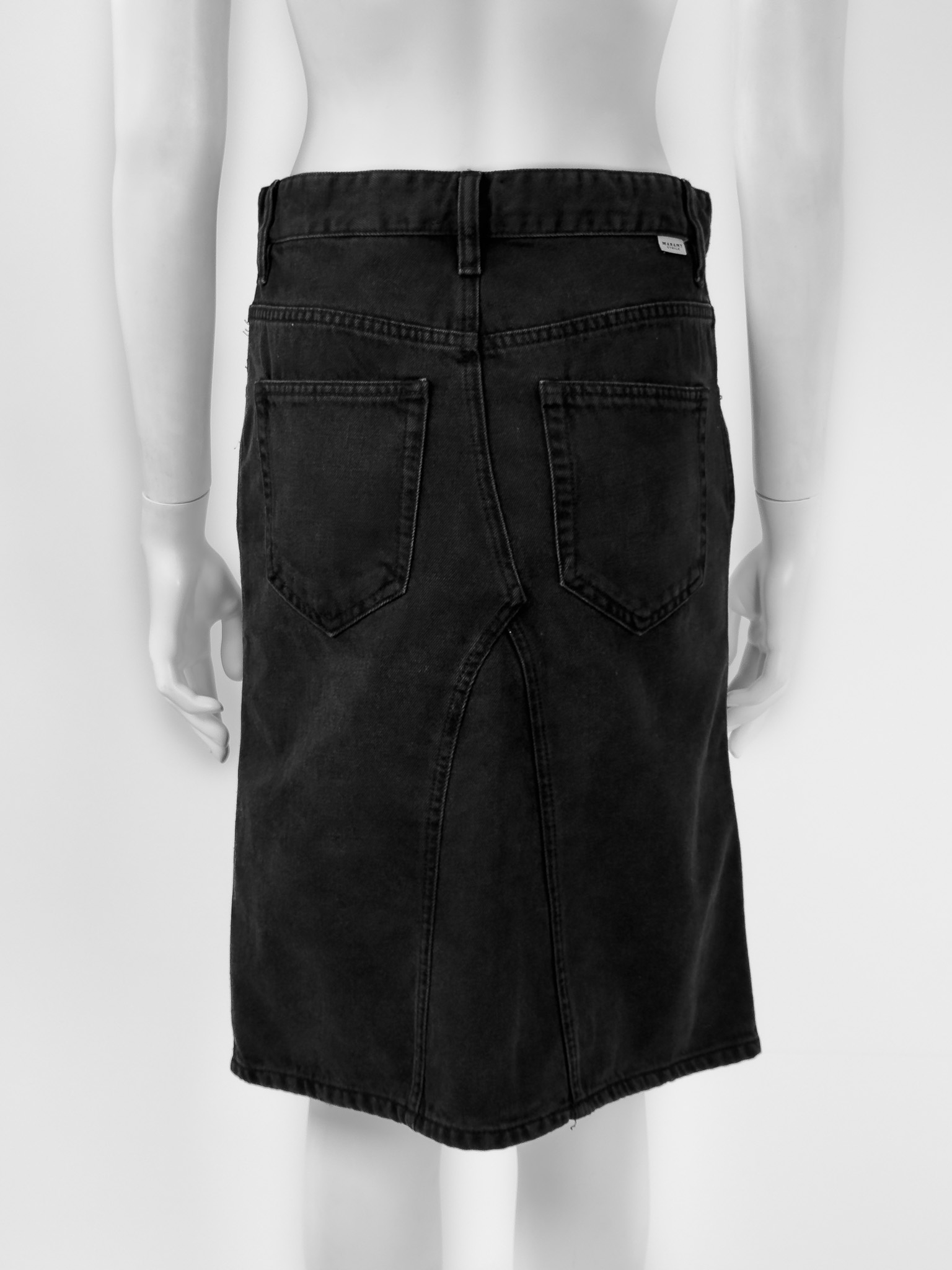 "Czarna, denim spódnica, prosty krój, zapinana na srebrne logowane guziki, długość za kolano. Rozmiar z metki 36. Skład: 100% bawełna. Nowa z metkami. Wymiary: szerokość w pasie 39cm, długość całkowita 60cm."
