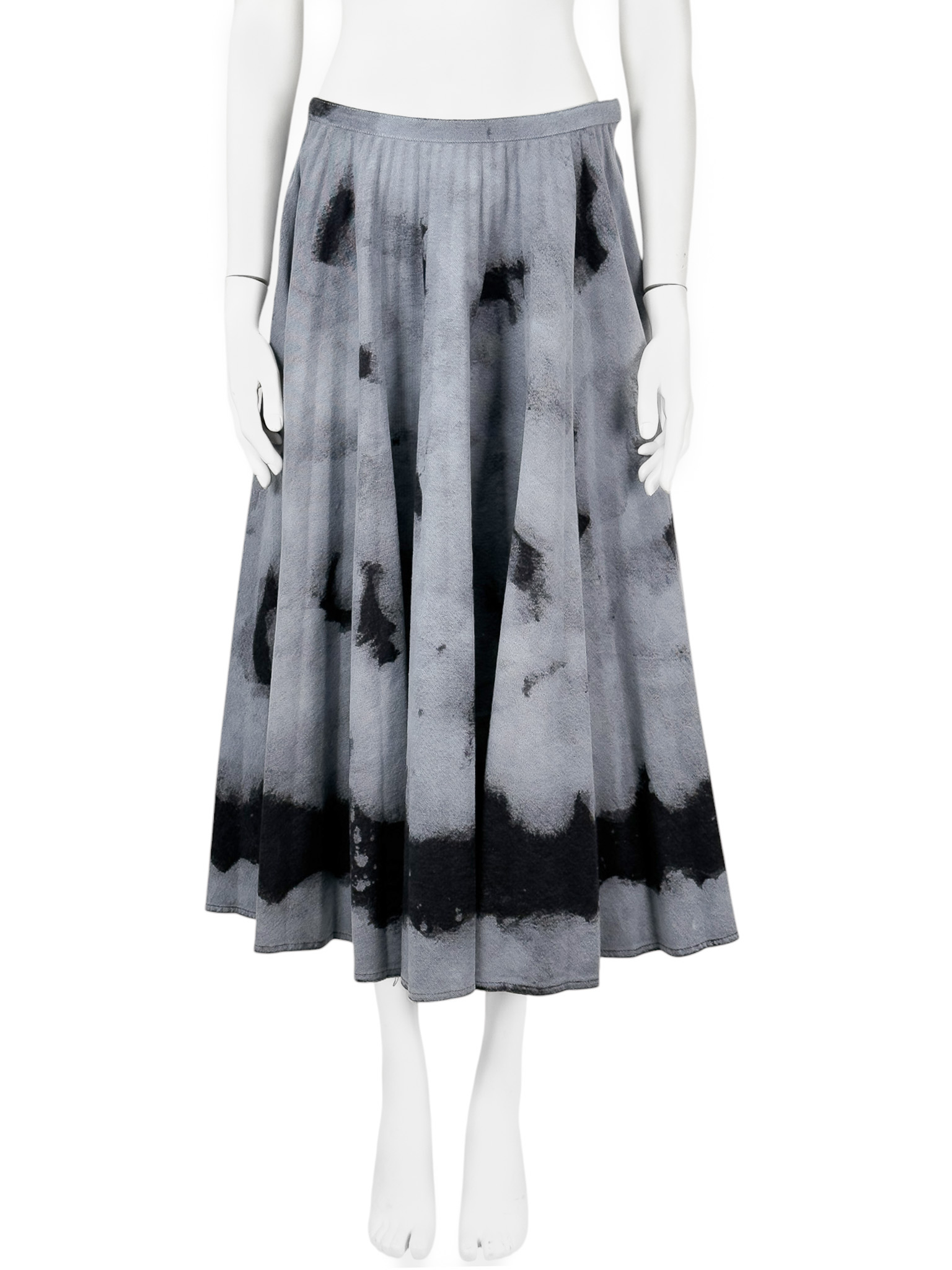 "Szaro - grafitowa maxi spódnica, rozkloszowana, denimowa, we wzór z efektem przybrudzenia. Rozmiar z metki IT 48. Skład: 100% bawełna. Nowa z metkami. Wymiary: szerokość w pasie 40cm, długość całkowita 83cm."
