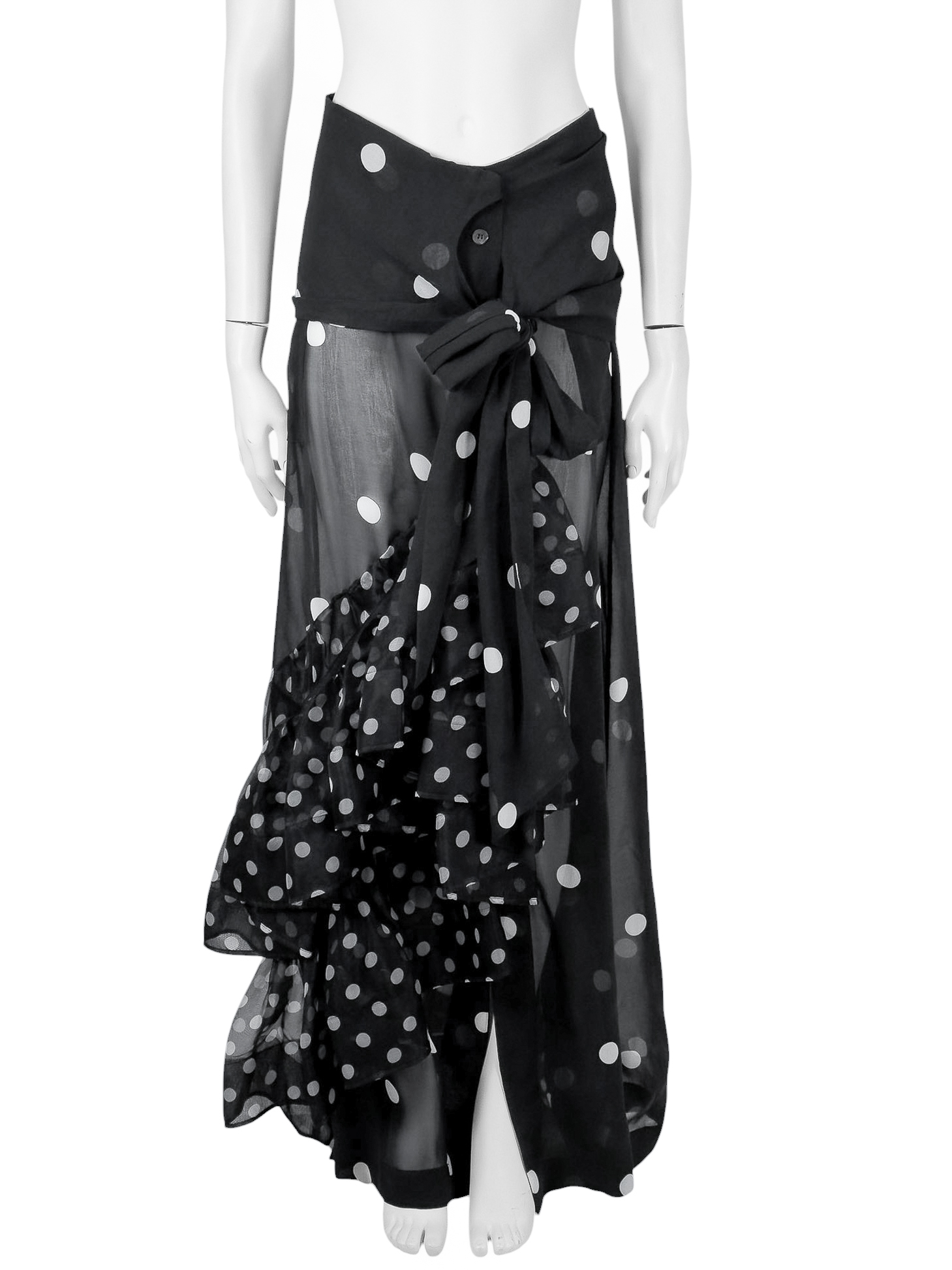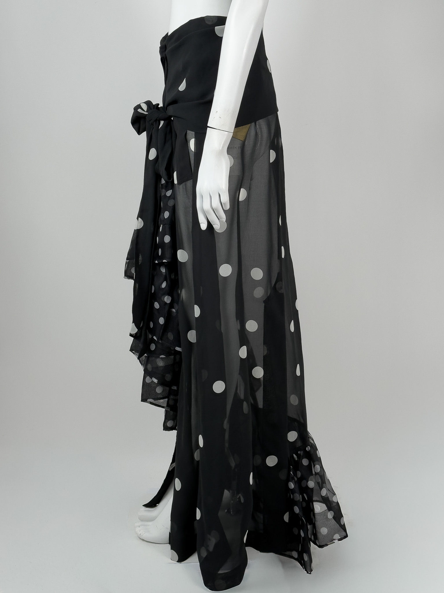 "Czarna spódnica w białe grochy, asymetryczna, długość maxi, ozdobiona falbaną wykończoną tiulem, miejscami transparentna, zapinana oraz wiązana w pasie. Stan bardzo dobry, w zestawie z metką. Rozmiar z metki 38. Skład: 100% poliester. Wymiary: szerokość w pasie 36cm, długość całkowita 120cm."