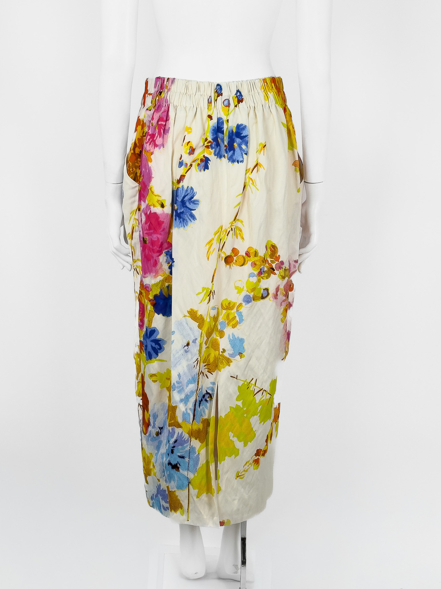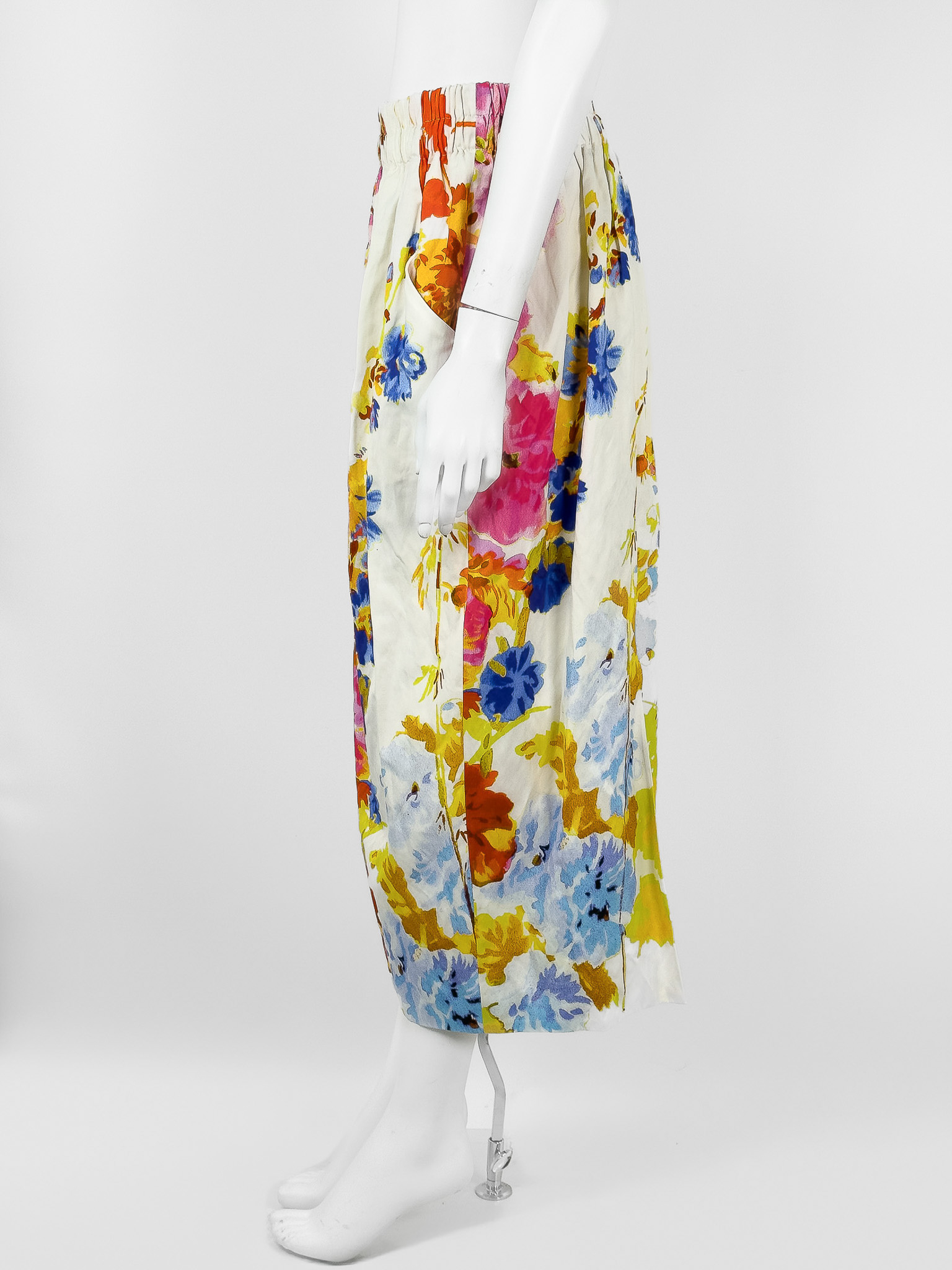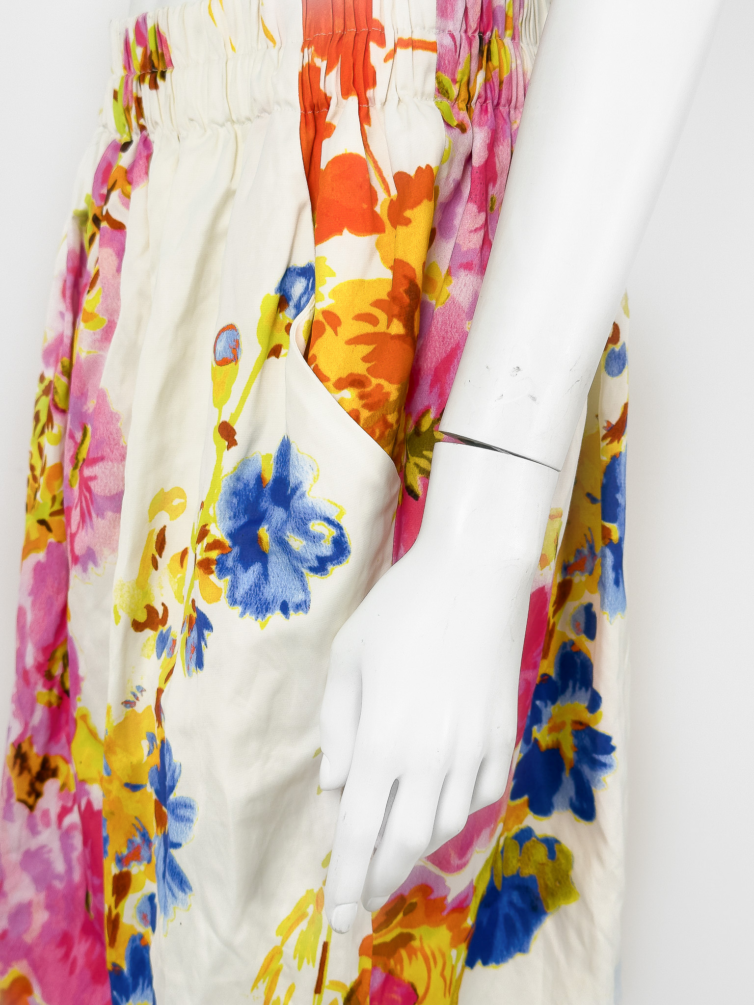 "Kremowa marszczona spódnica w wielobarwną grafikę kwiatową, długość midi, guma w pasie, regulowana sznurkiem od wewnętrznej strony.dwie kryte kieszenie po bokach, rozcięcie. Stan bardzo dobry. Rozmiar z metki L. Skład: 54% wiskoza, 41% bawełna, 5%włókna metalizowane. Wymiary: szerokość w pasie 38cm, długość całkowita 88cm."