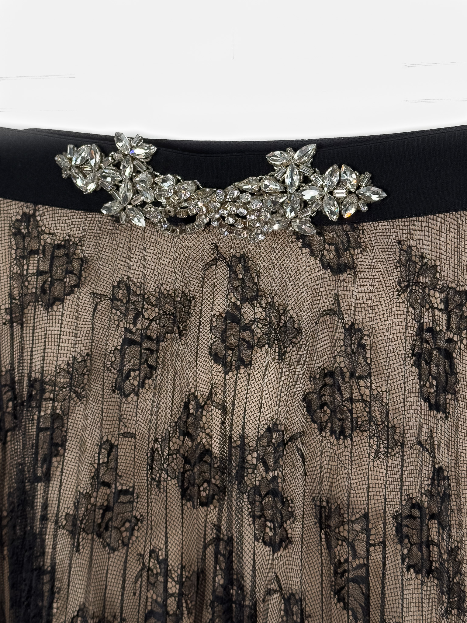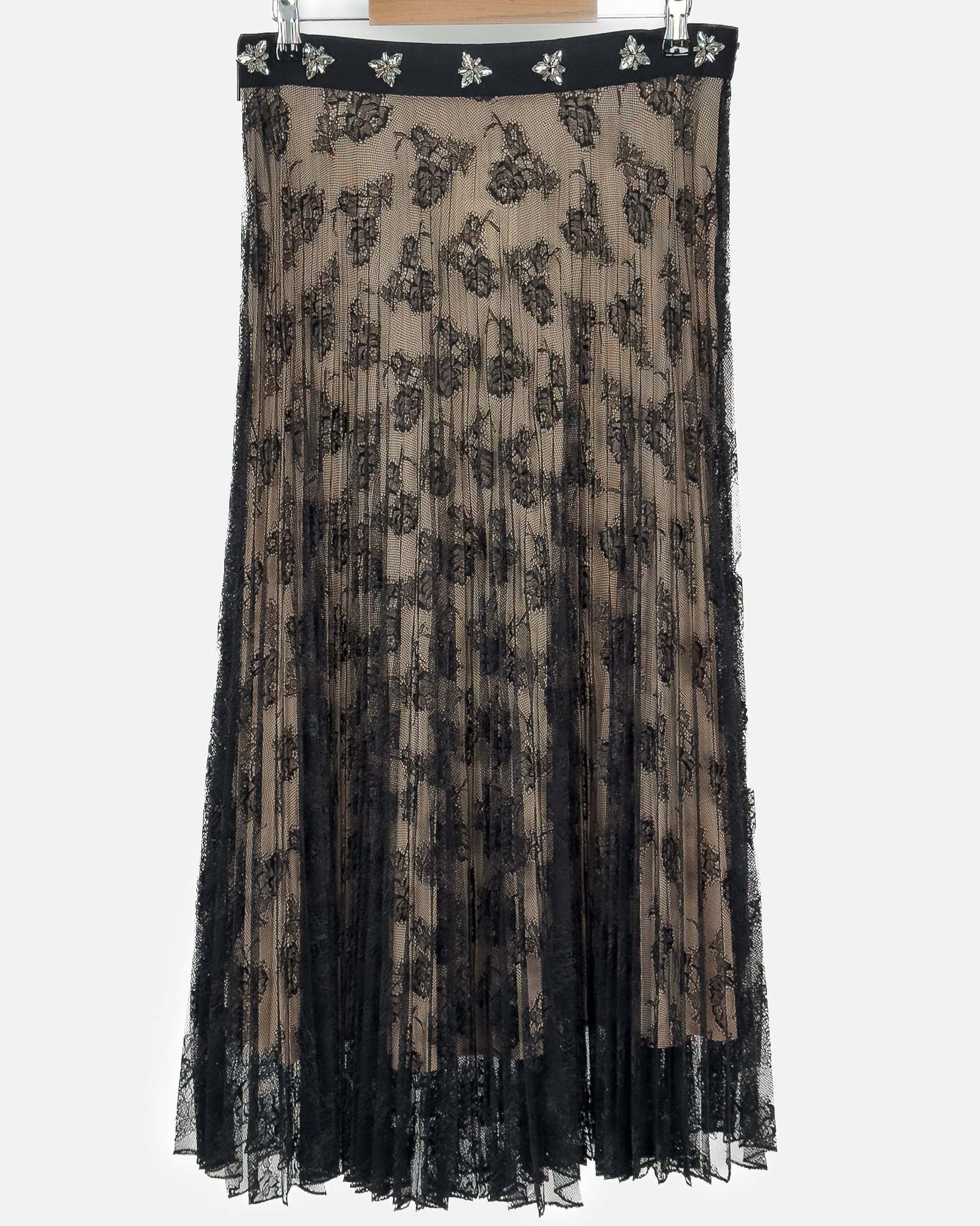 "Czarna tiulowa, transparentna spódnica we wzór koronki, beżowa halka, talia wysadzana kryształami we wzór kokardki oraz gwiazdek. Stan bardzo dobry. Rozmiar z metki IT46. Skład: 100% poliester, podszewka: 52% nylon, 39% jedwab, 9% elastan. Wymiary: szerokość w pasie 40cm, długość całkowita 93cm."