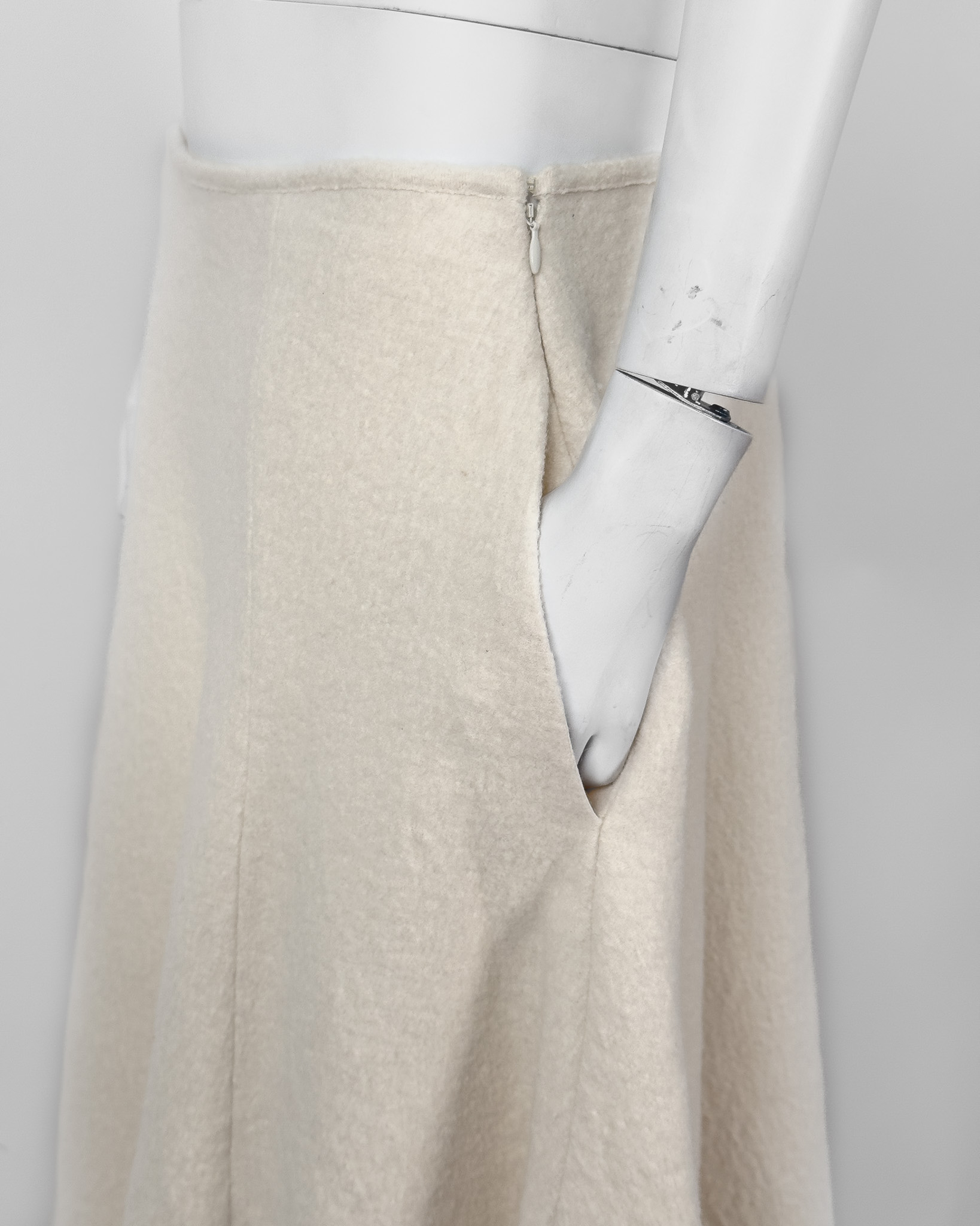 "Kremowa spódnica z domieszką bawełny oraz wełny w składzie, rozkloszowany krój, długość midi, zapinana w bocznej części na suwak oraz haftkę, dwie kryte kieszenie po bokach, brak podszewki. Stan bardzo dobry. Rozmiar z metki IT 42. Wymiary: szerokość w pasie 40cm, długość całkowita 80cm."