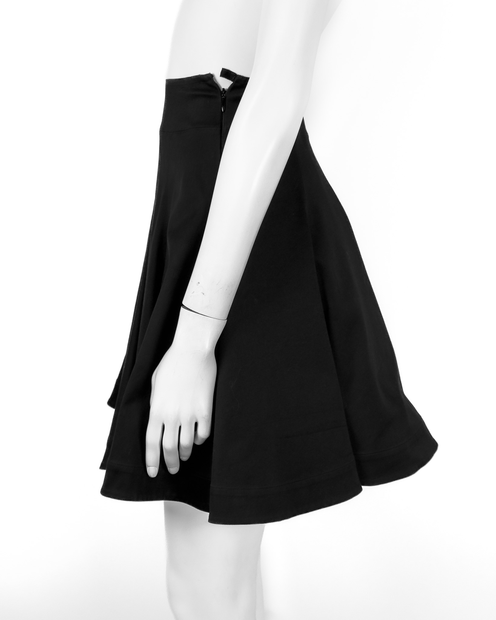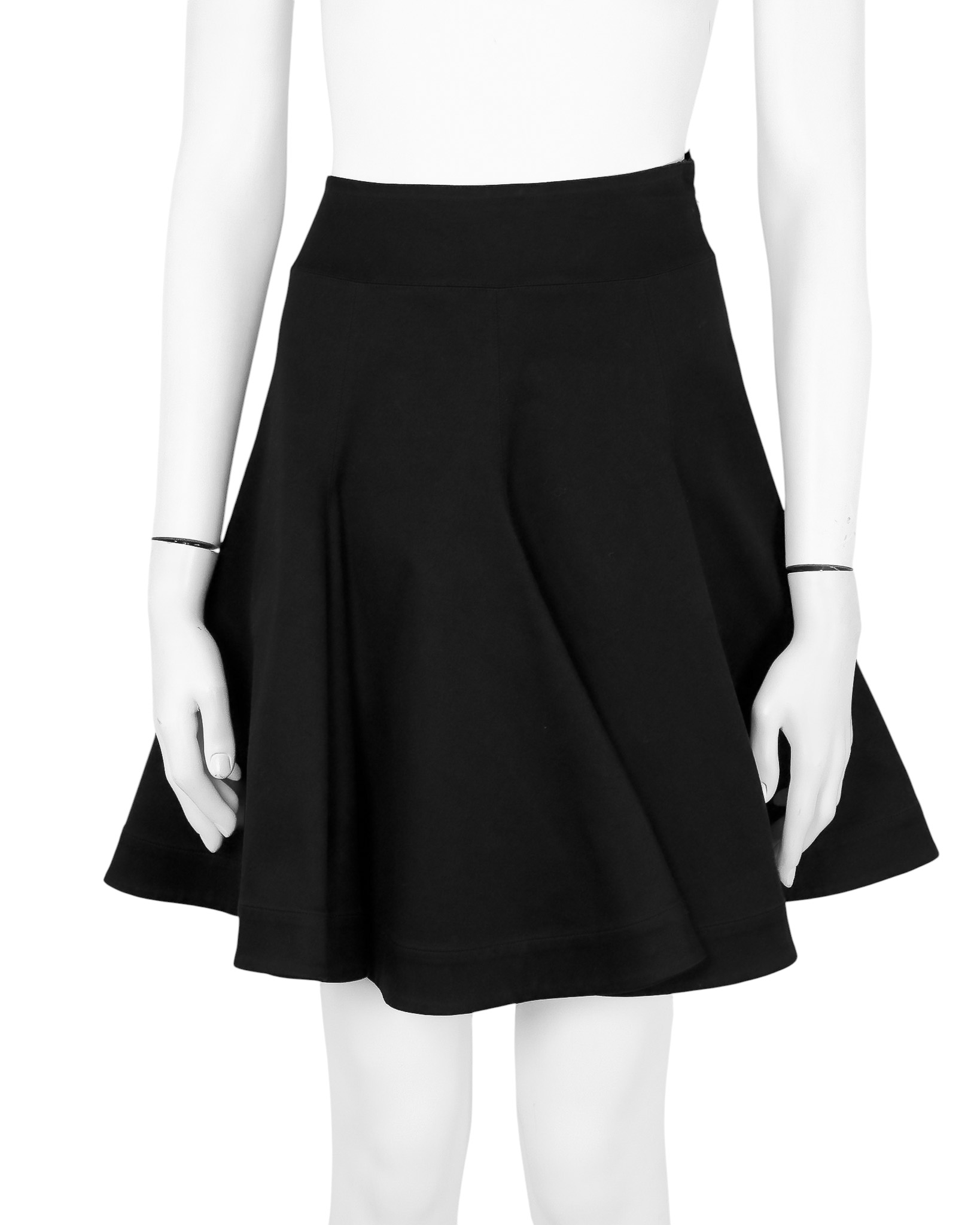 "Czarna spódnica z wysokim stanem, rozkloszowana, zapinana w bocznej części na kryty suwak oraz haftkę, długość przed kolano. Stan bardzo dobry. Rozmiar z metki FR 36. Wymiary: szerokość w pasie 29 cm, długość całkowita 50 cm."