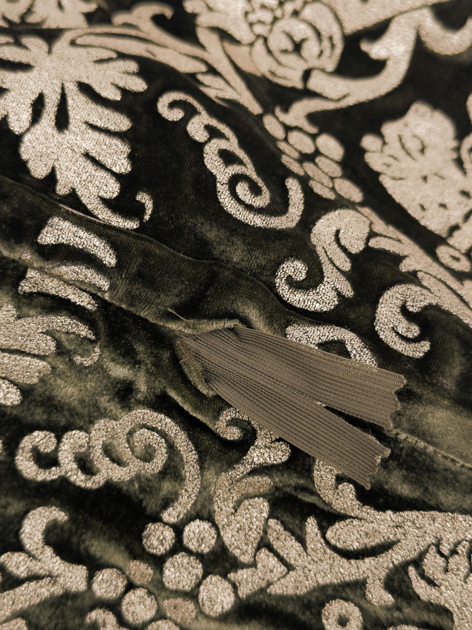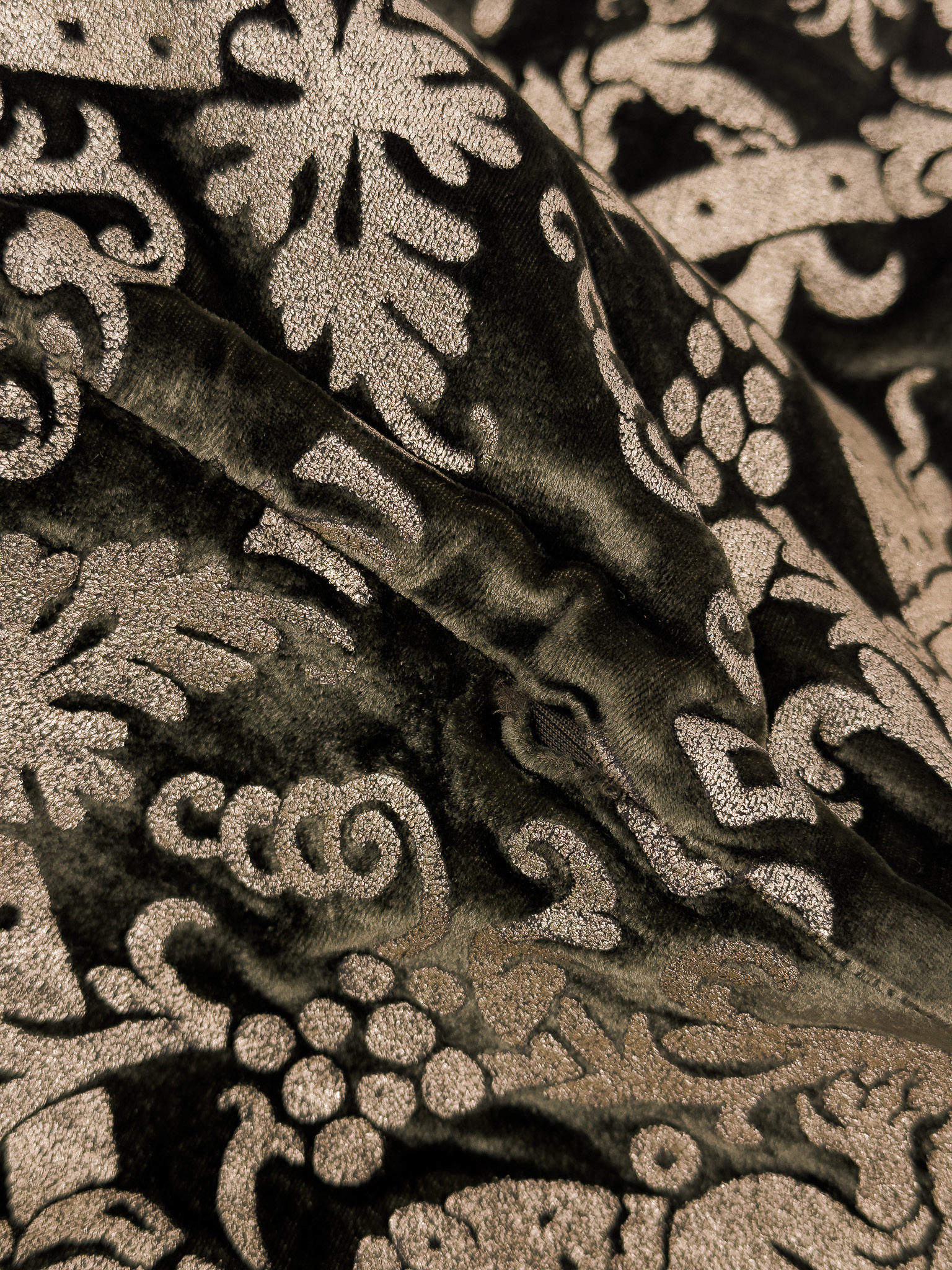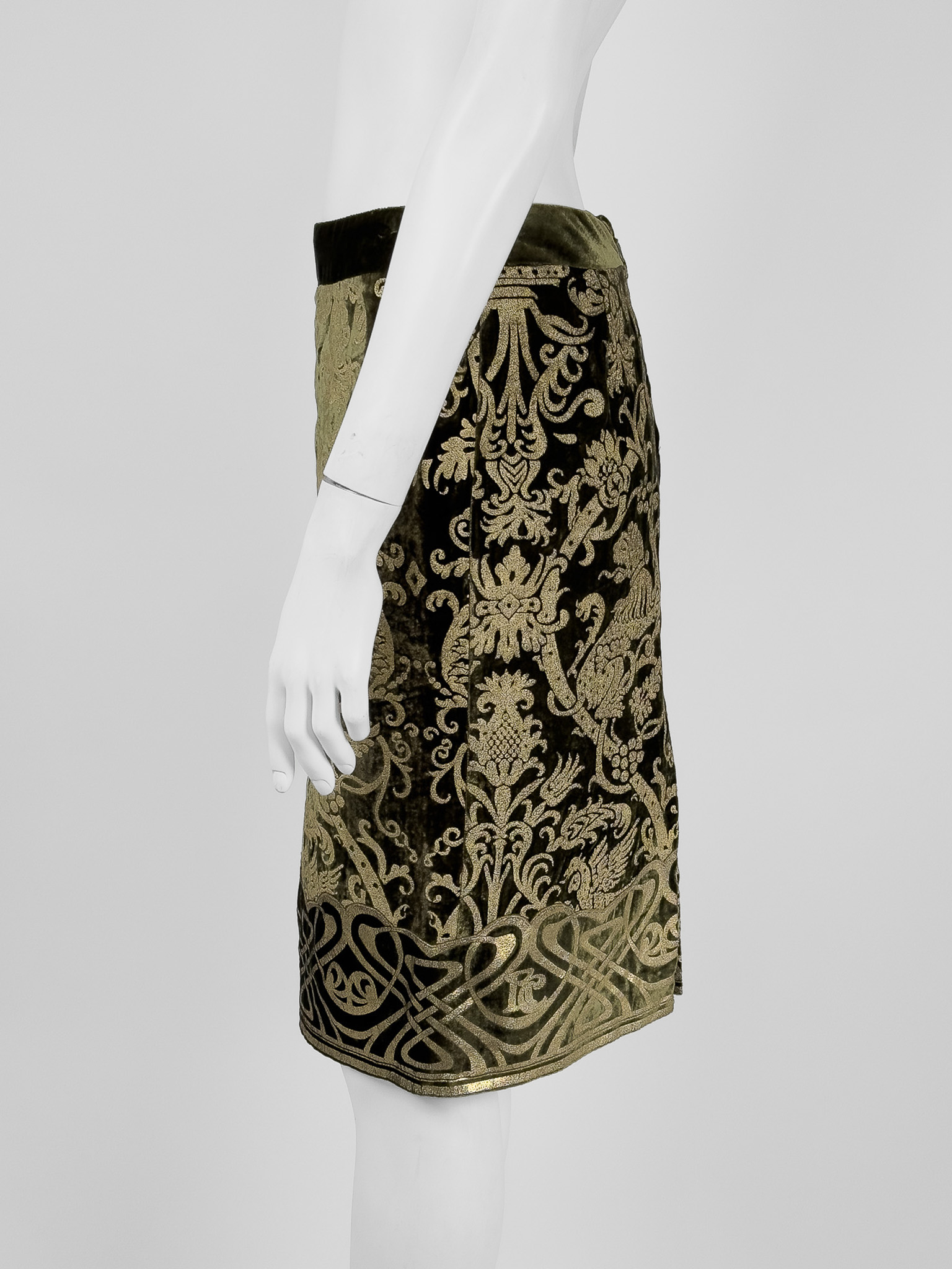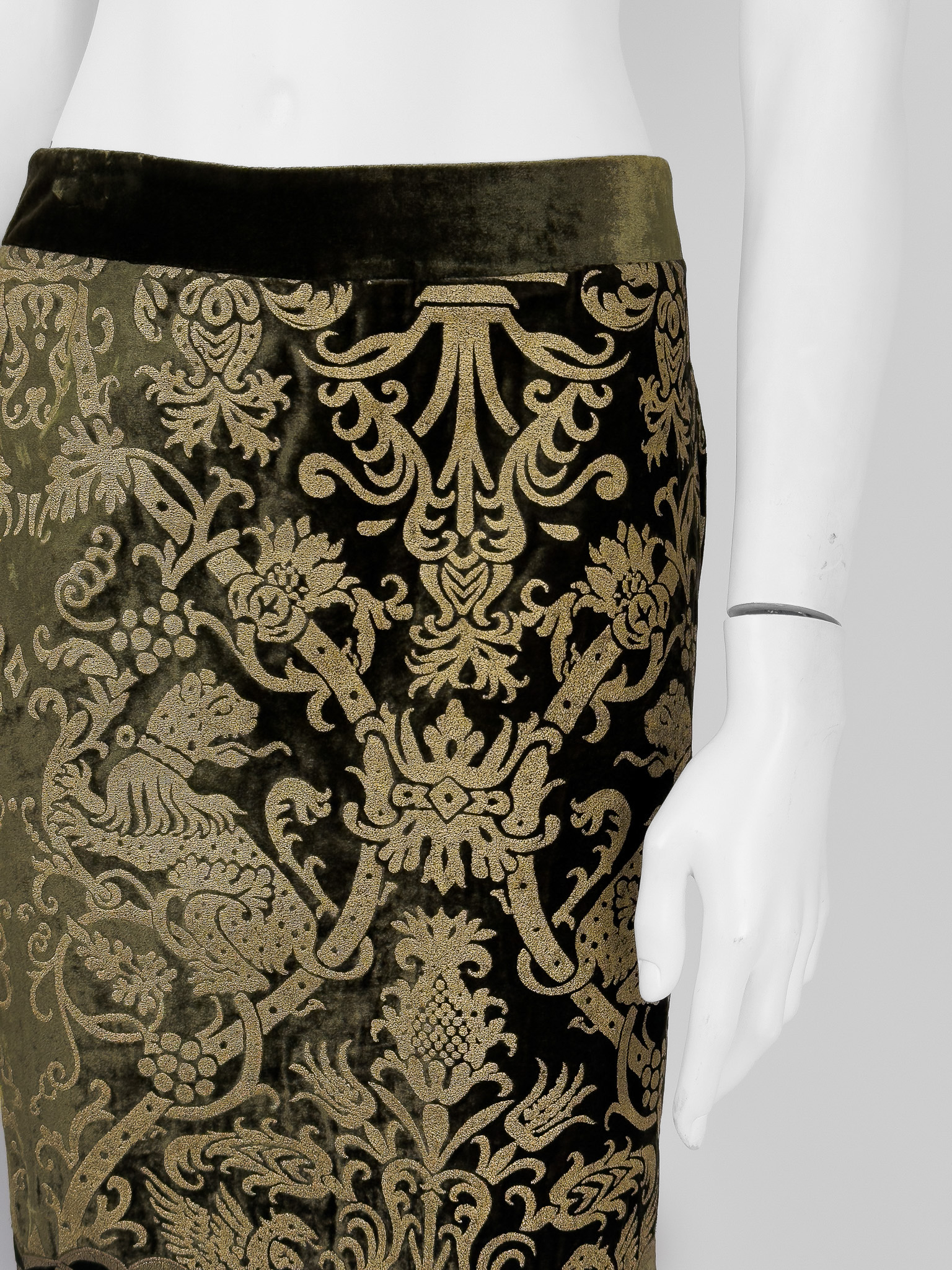 "Aksamitna spódnica w kolorze khaki ozdobiona złotym wzorem, zapinana na suwak ora haftkę, długość do kolan, ołówkowy krój, rozcięcie w tylnej części, logowana podszewka. Stan bardzo dobry, rozprucie przy suwaku. Rozmiar z metki IT 40. Skład: 16% jedwab, 82% wiskoza; podszewka: 100% kupro. Wymiary: szerokość w pasie 37,5cm, długość całkowita 59cm."