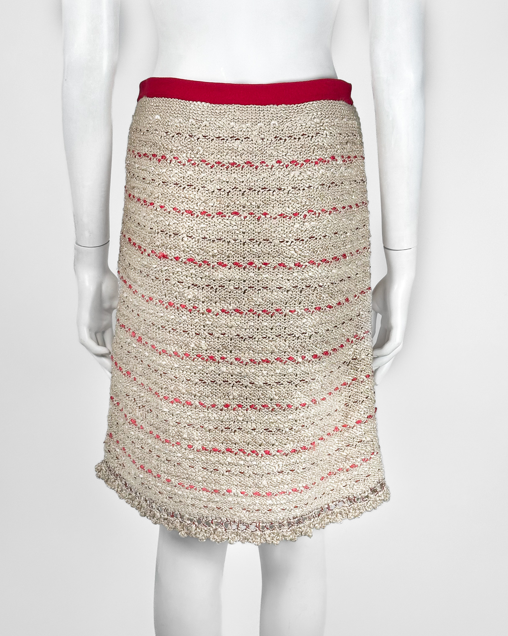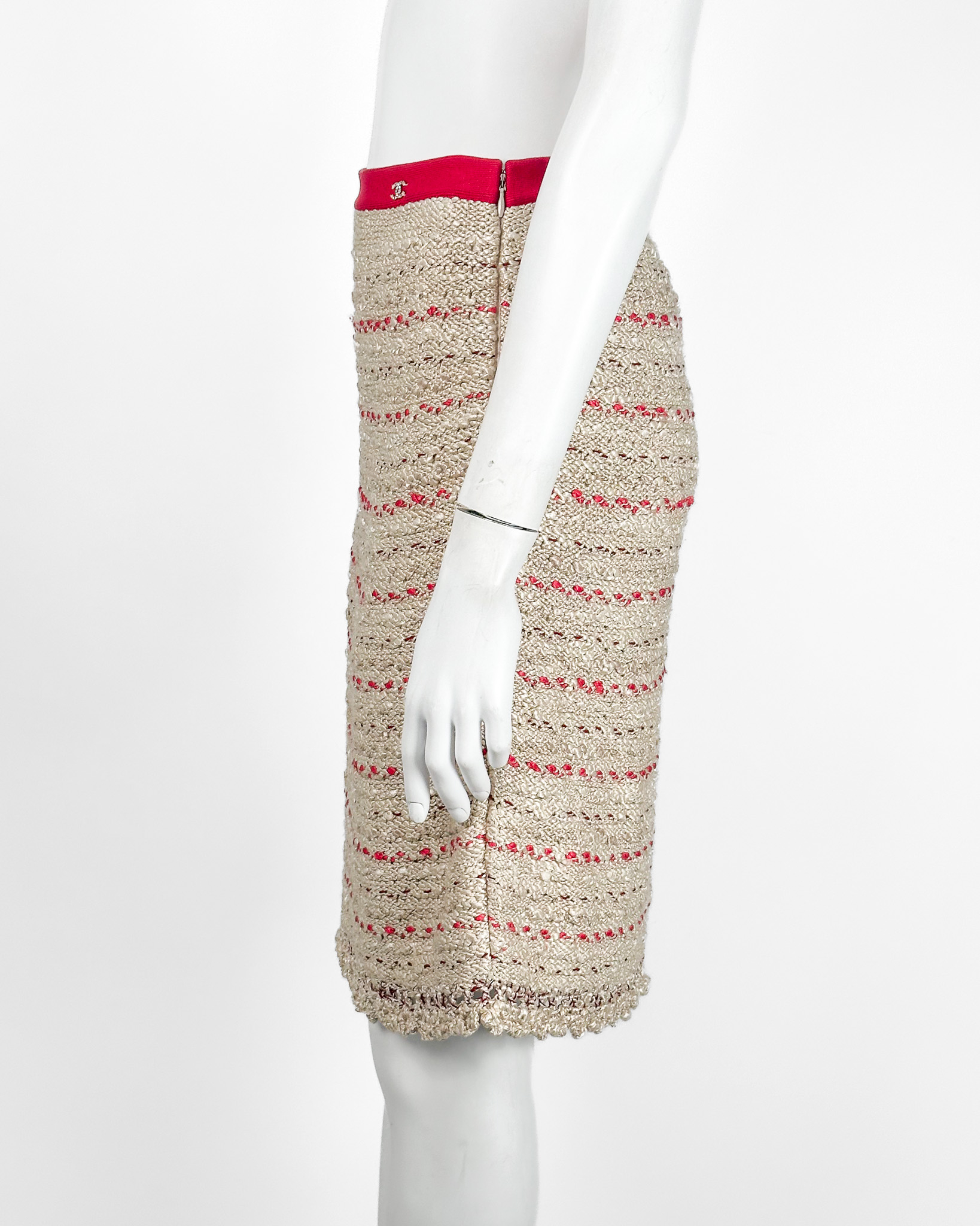 "Beżowa tweedowa spódnica ołowkowa przeplatana różowymi nitkami, na górze różowy pas z biżuteryjnym logo marki wysadzanym kryształkami, dół spódnicy wykończony ozdobnym ażurowym splotem, przecięta metka, rozmiar 36"