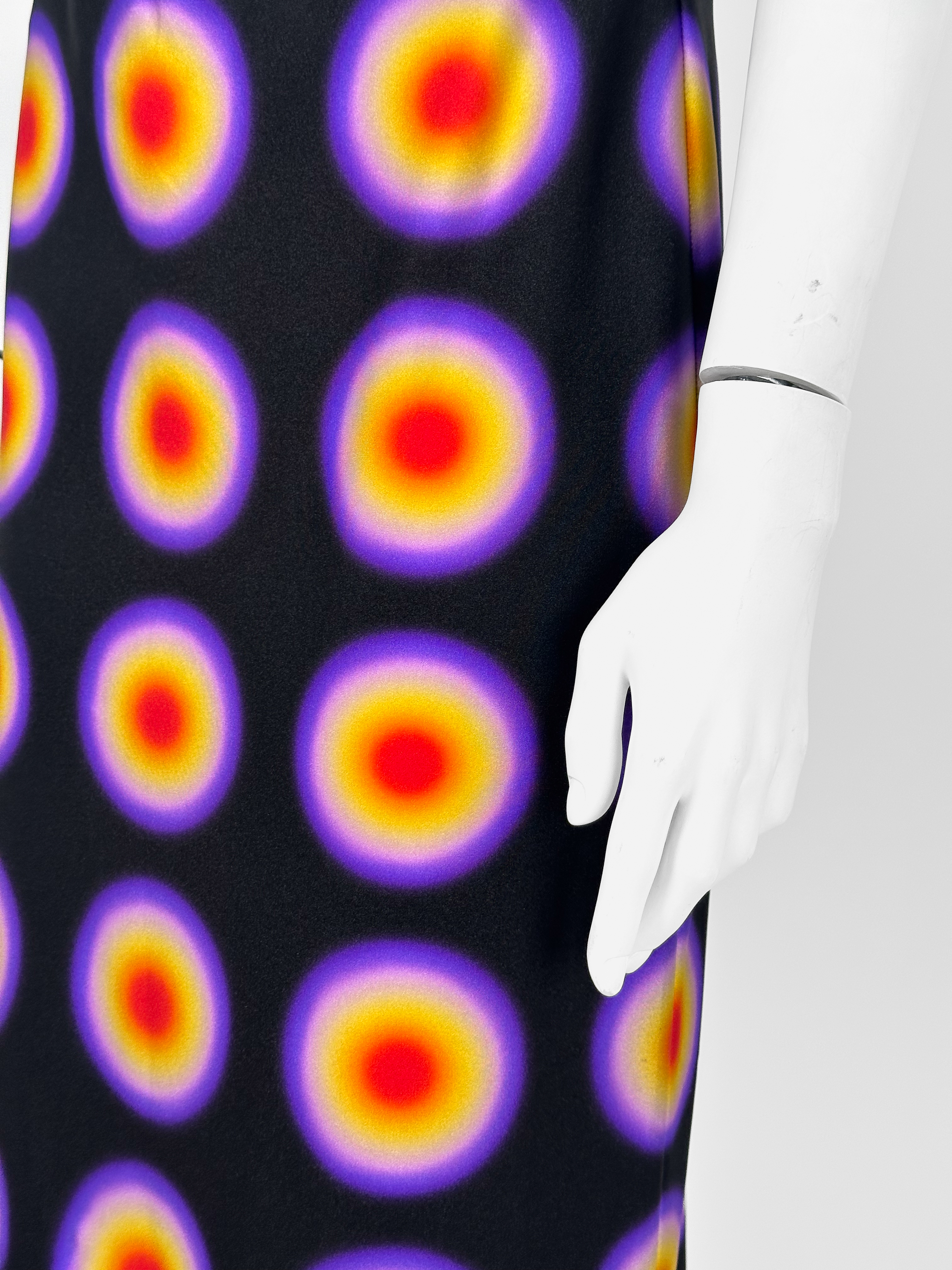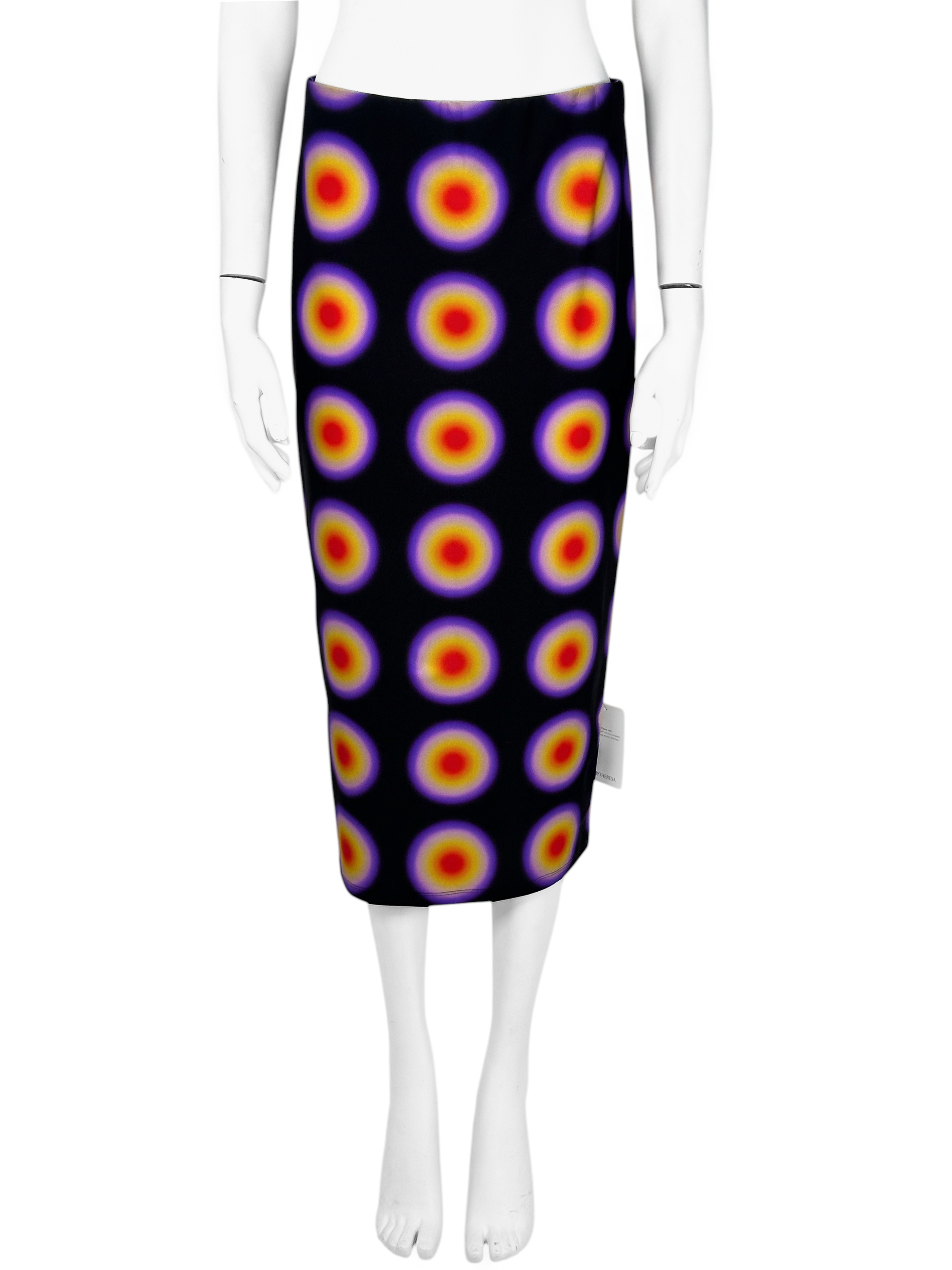 "Czarna spódnica midi w motyw fioletowo-żółto-czerwonych kół, prosty ołówkowy, dopasowany krój, guma w pasie. Stan nowa z metką. Rozmiar z metki L. Skład: 80% poliamid, 20% elastan. Wymiary: szerokość w pasie 39cm, długość całkowita 81cm."