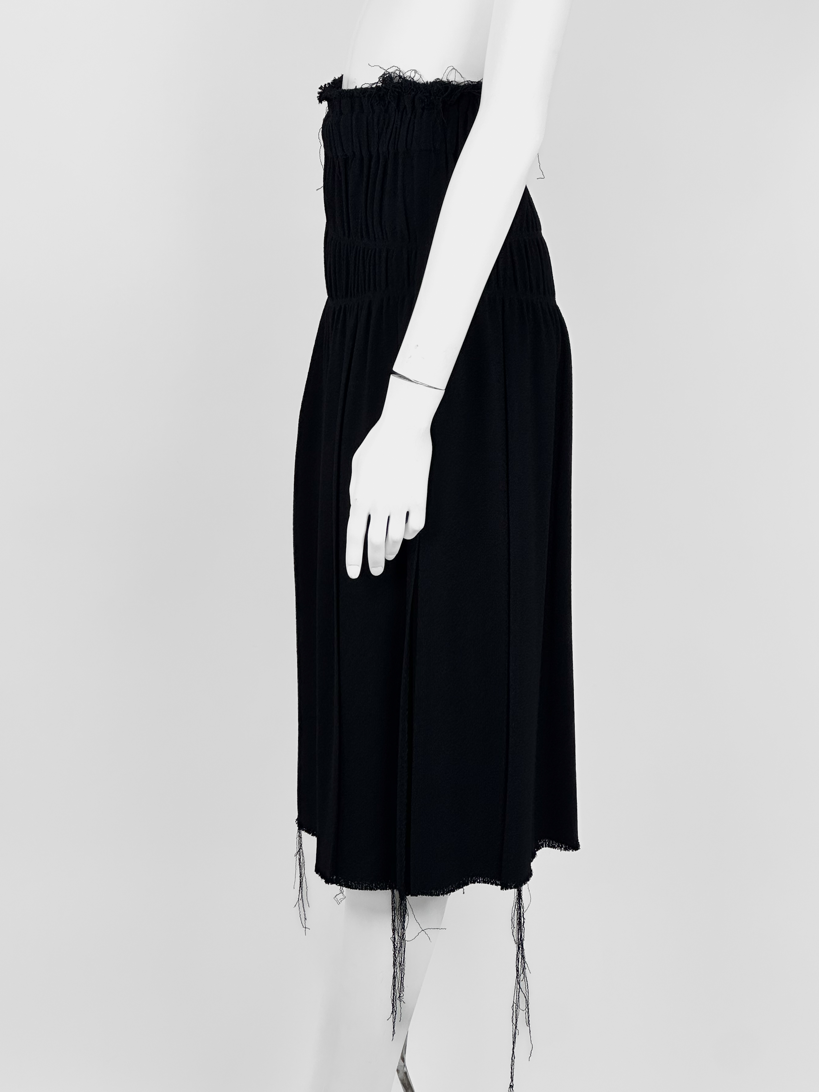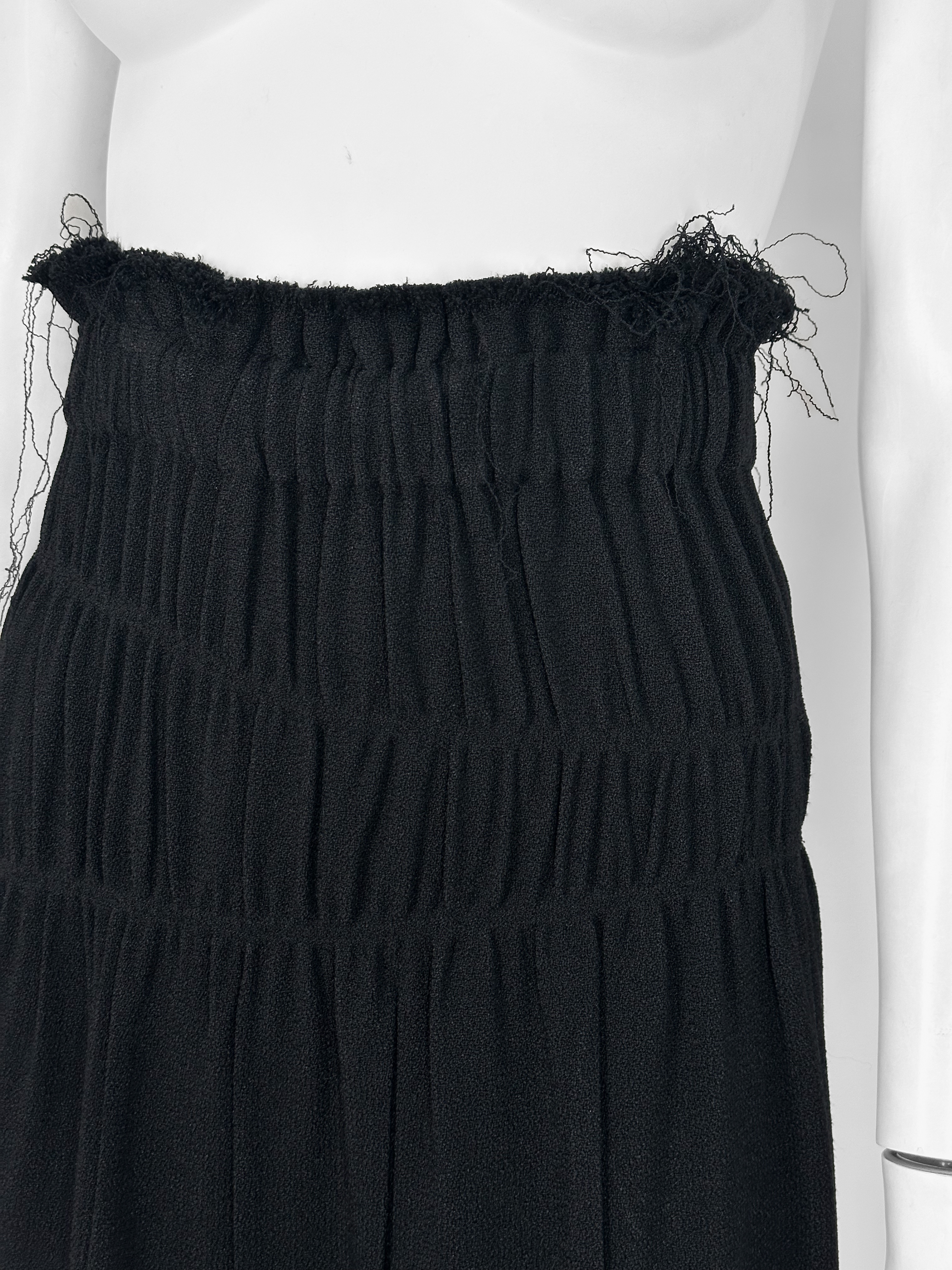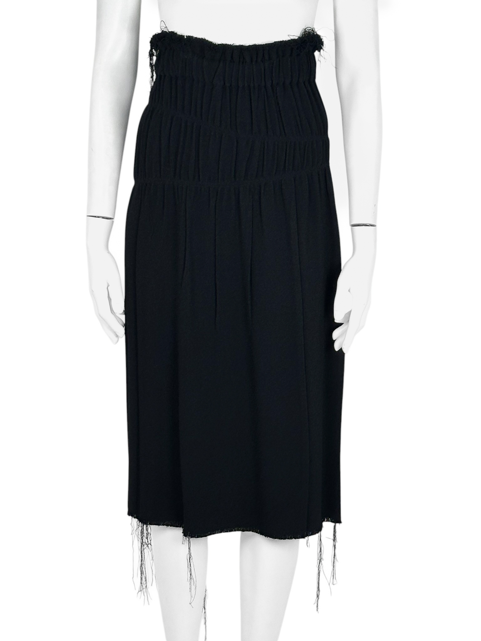 "Czarna spódnica za kolano, motyw postrzępionego materiału, drapowanie materiału. Nowa z metką. Rozmiar 6. Skład: 100% wiskoza. Wymiary: szerokość w pasie 35cm, długość całkowita 79cm."