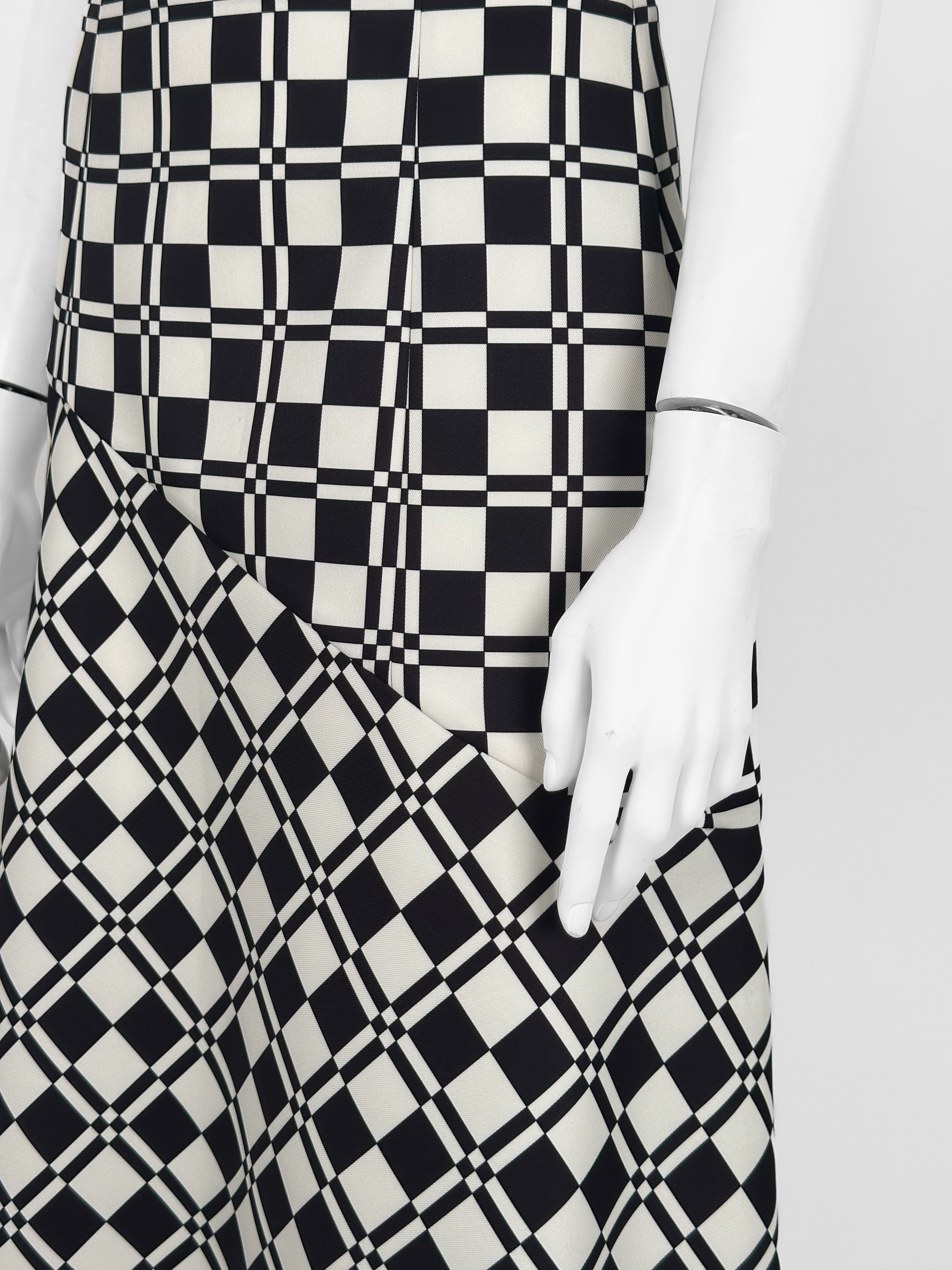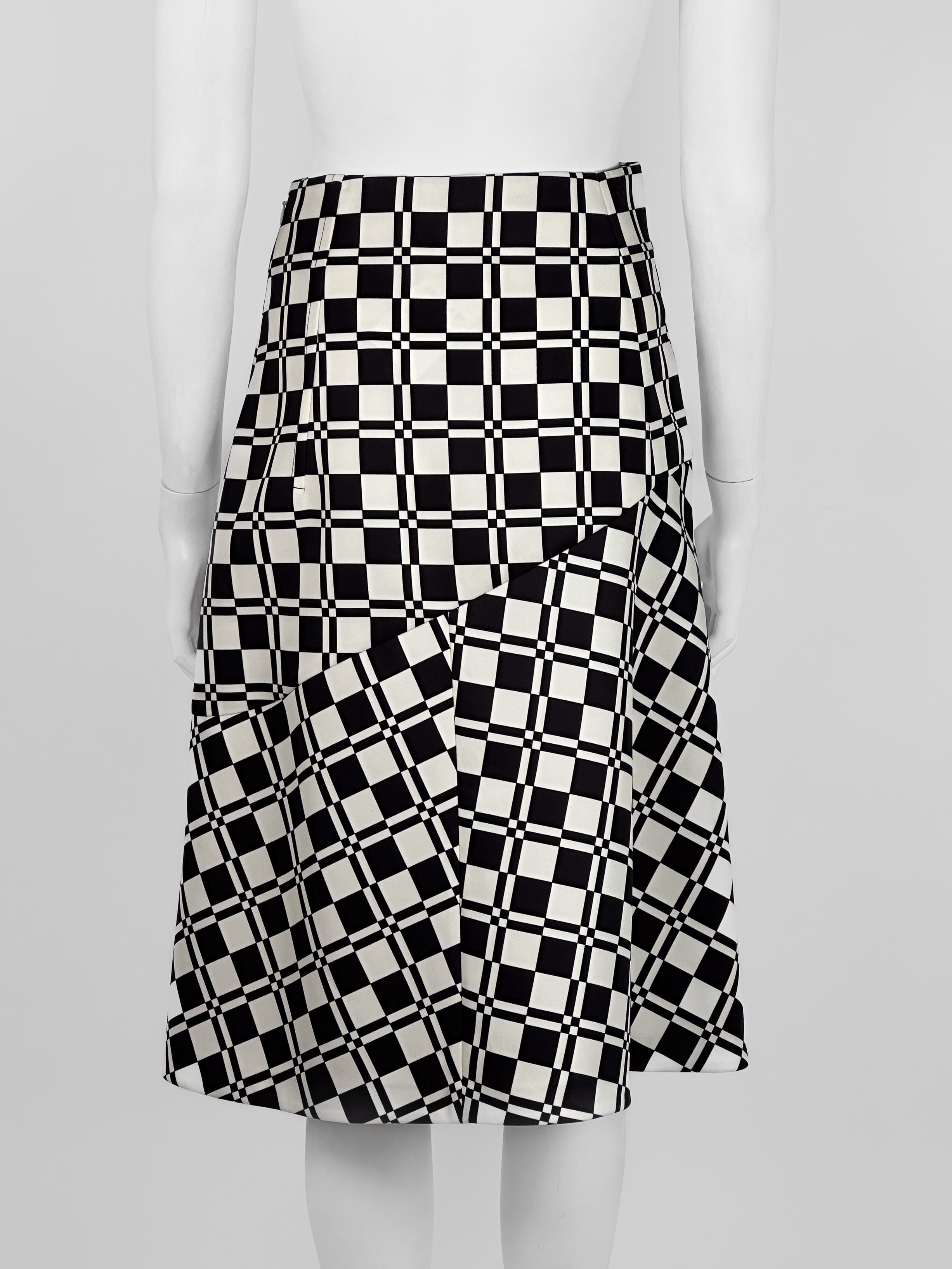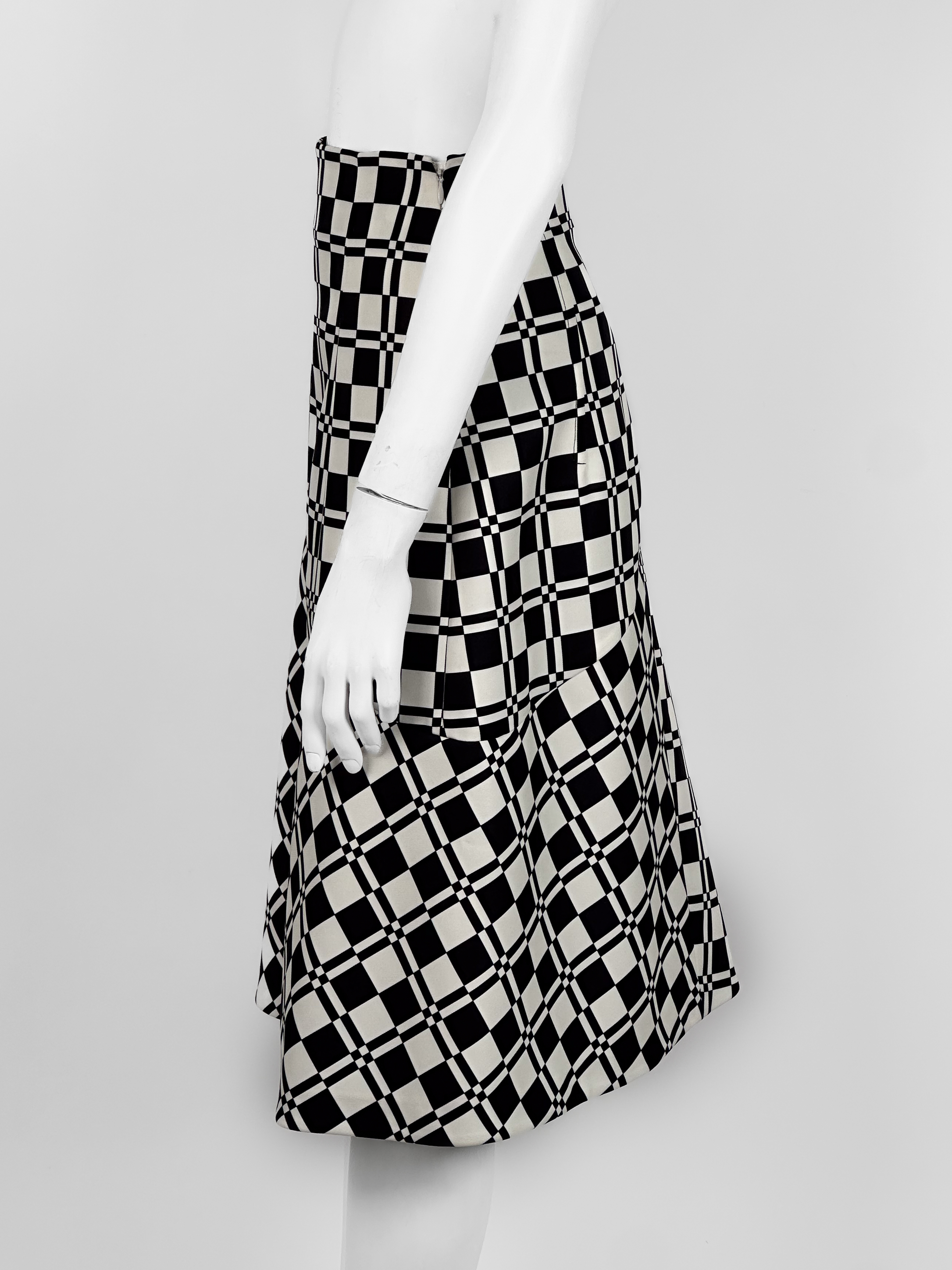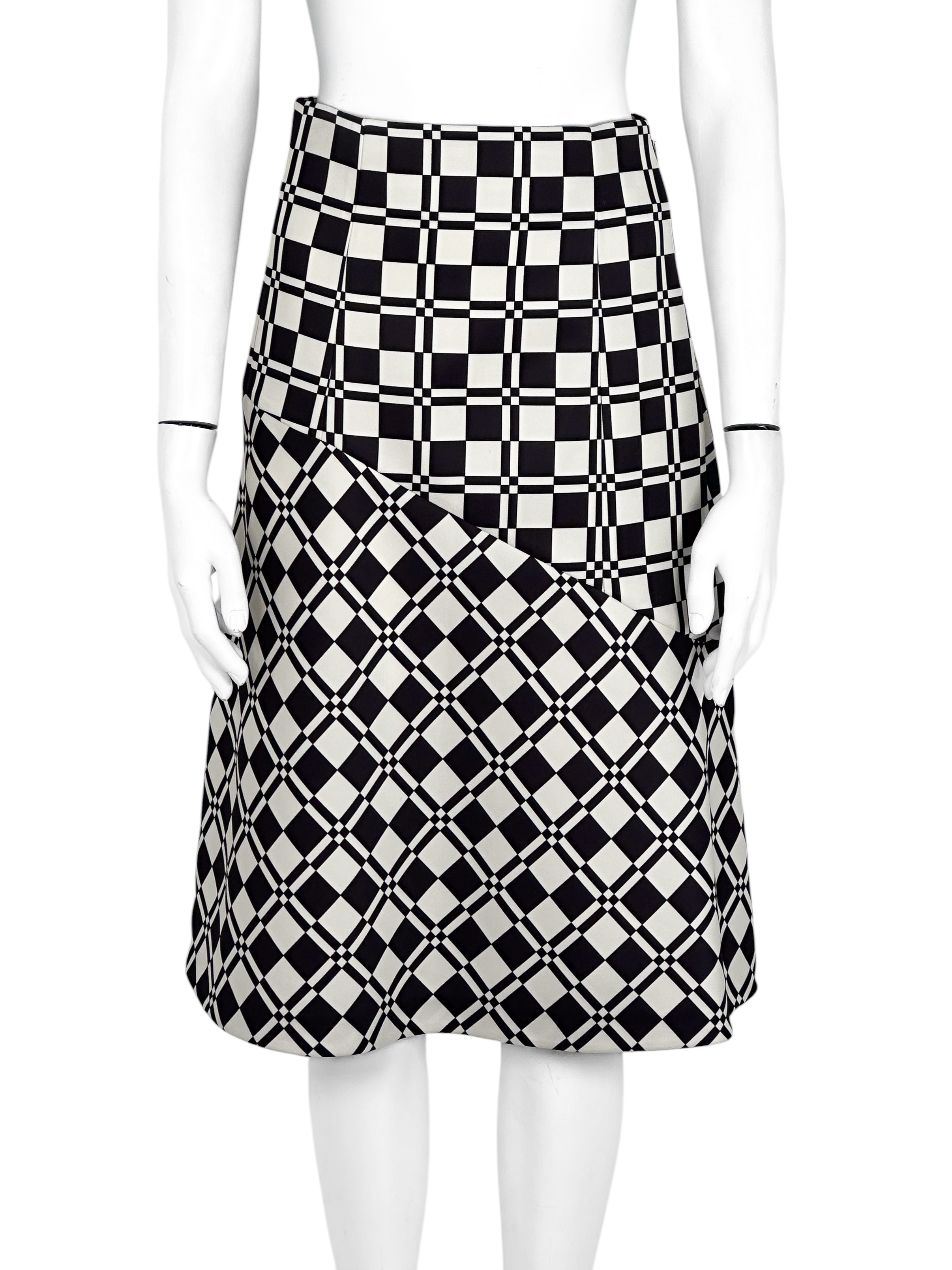 "Biało-czarna spódnica w motyw kraty, wysoki stan, rozkloszowany krój, zapinana w bocznej części na kryty suwak oraz haftkę, długość do kolan. Rozmiar z metki 32. Skład: 100% poliester; podszewka: 95% wiskoza, 5% elastan. Wymiary: szerokość w pasie 34cm, długość całkowita 69cm."