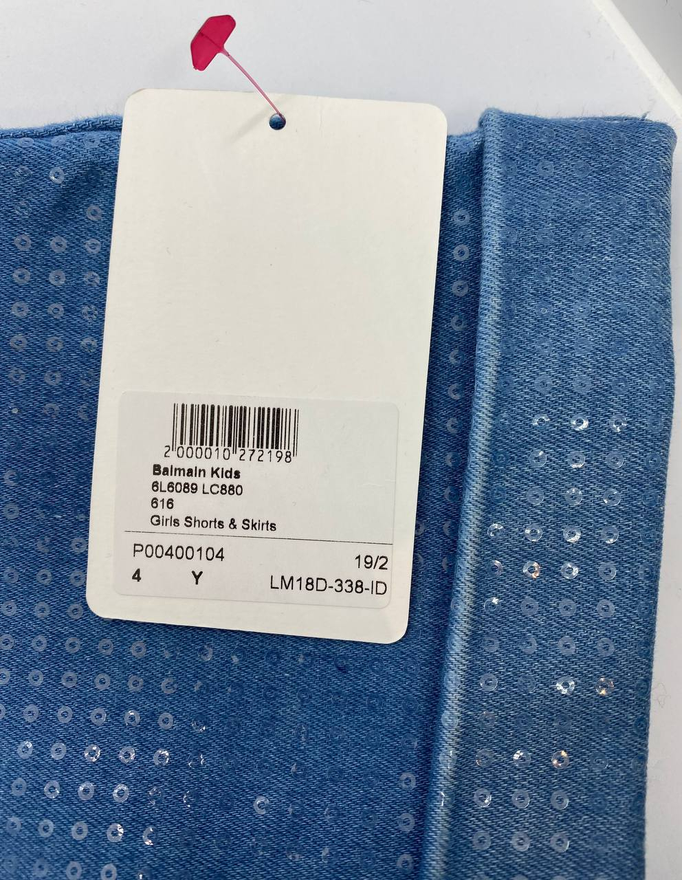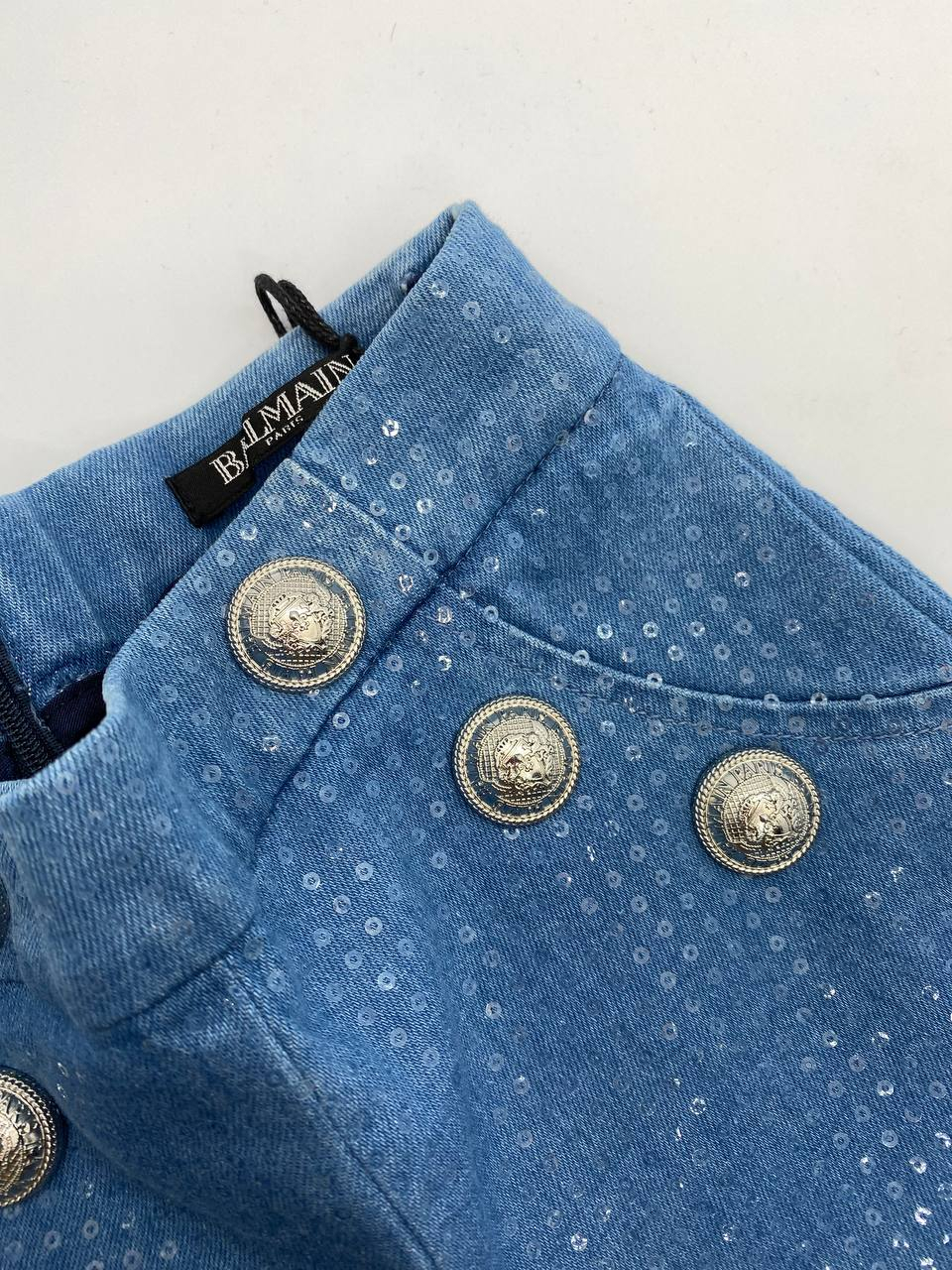 "krótkie jeansowe spodenki, wysoki stan, guziki srebrne logowane, imitacja cekinów po całości, nowe z metką, rozmiar 4A"