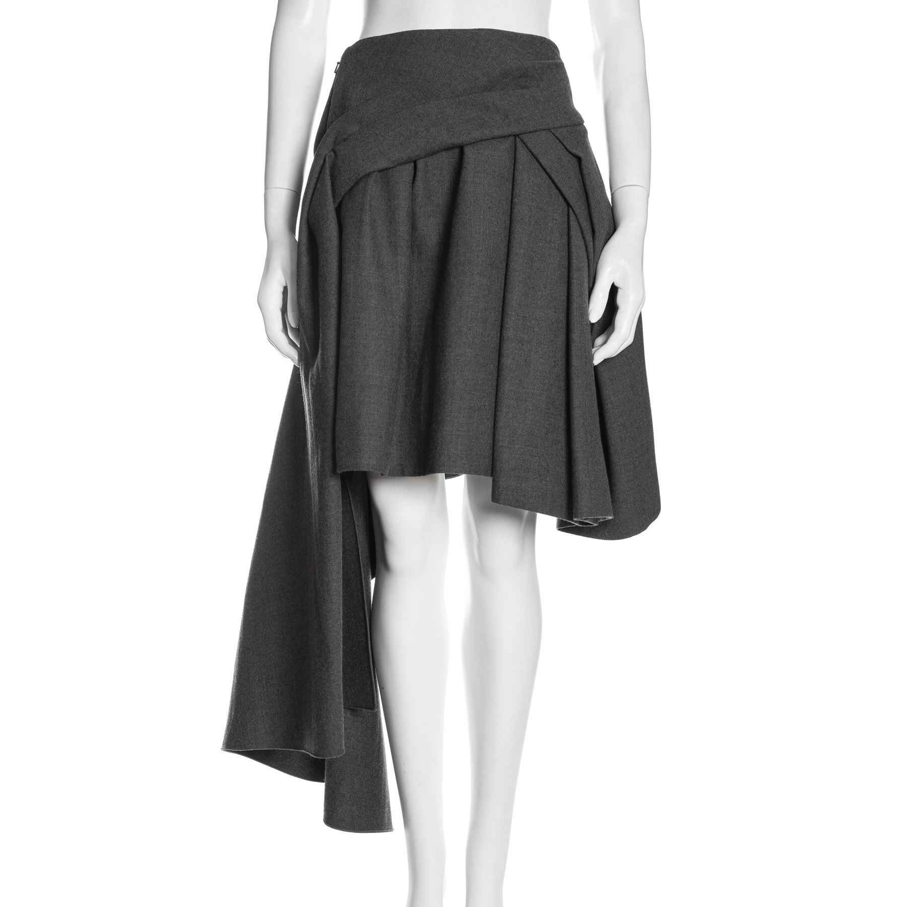 "Szara wełniana spódnica mini, plisowana z marszczeniami i przedłużanym pasem z jednej strony, rozmiar 36."