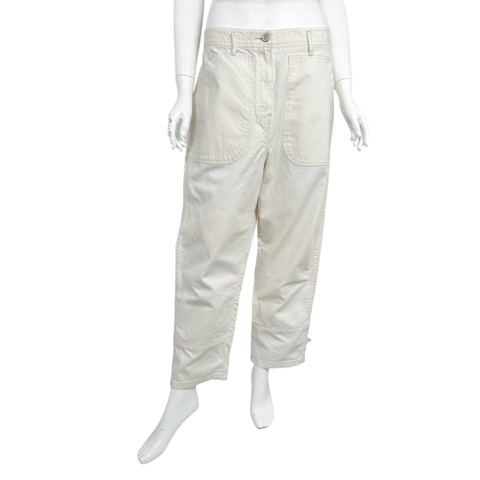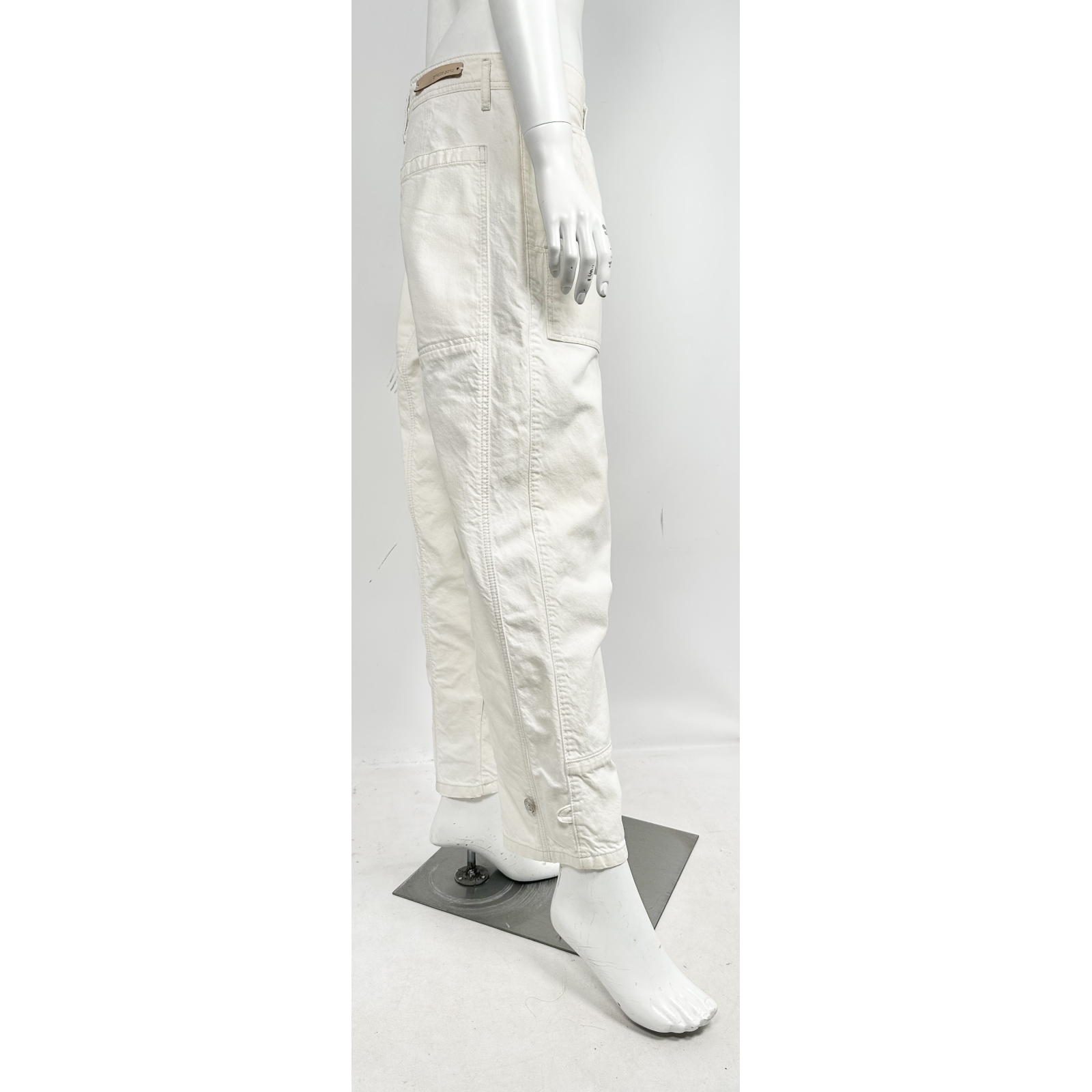 "Bawełniano-lniane spodnie w kolorze zgaszonej bieli, wysoki stan, prosta szeroka nogawka o długości 7/8, dwie duże kieszenie po bokach oraz dwie w tylnej części, podwijane nogawki, zapinane na guzik na wykończeniu, skórzana logowana wstawka na wysokości szlufek, przeszyte nitką w kolorze gołębim, używane. Stan bardzo dobry. Rozmiar z metki 40. Skład: 85% bawełna, 15% len. Wymiary: szerokość w pasie 43cm, długość nogawki mierzona od zewnętrznej strony 95cm."