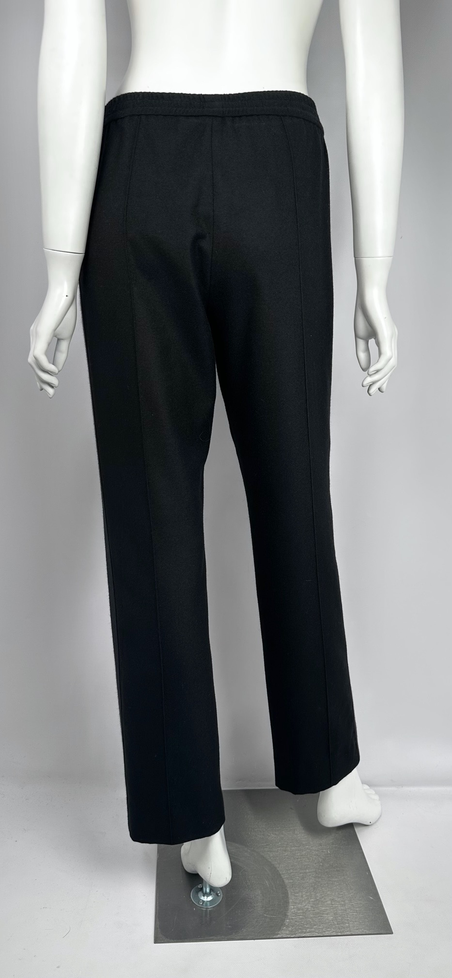 "Czarne spodnie z kaszmiru i jedwabiu. Mają proste nogawki w kant z dwiema kieszeniami po bokach oraz naszytye szerokie lampasy z innej tkaniny, ale również w kolorze czarnym. W pasie wkończone są gumką z dodatkowym wiązaniem na sznurówkę. Stan bdb. Rozmiar: 36. Skład: 96% kaszmir, 4% jedwab, podszewka: 60% wiskoza, 35% curpo, 5% elastan. Wymiary: wys. stanu: 25 cm., dł. całkowita: 94 cm., dł. wewnętrzna nogawki: 77 cm., szer. (mierzona na linii biodra): 29 cm., szer. w pasie: 36 cm., szer. w biodrach: 51 cm."