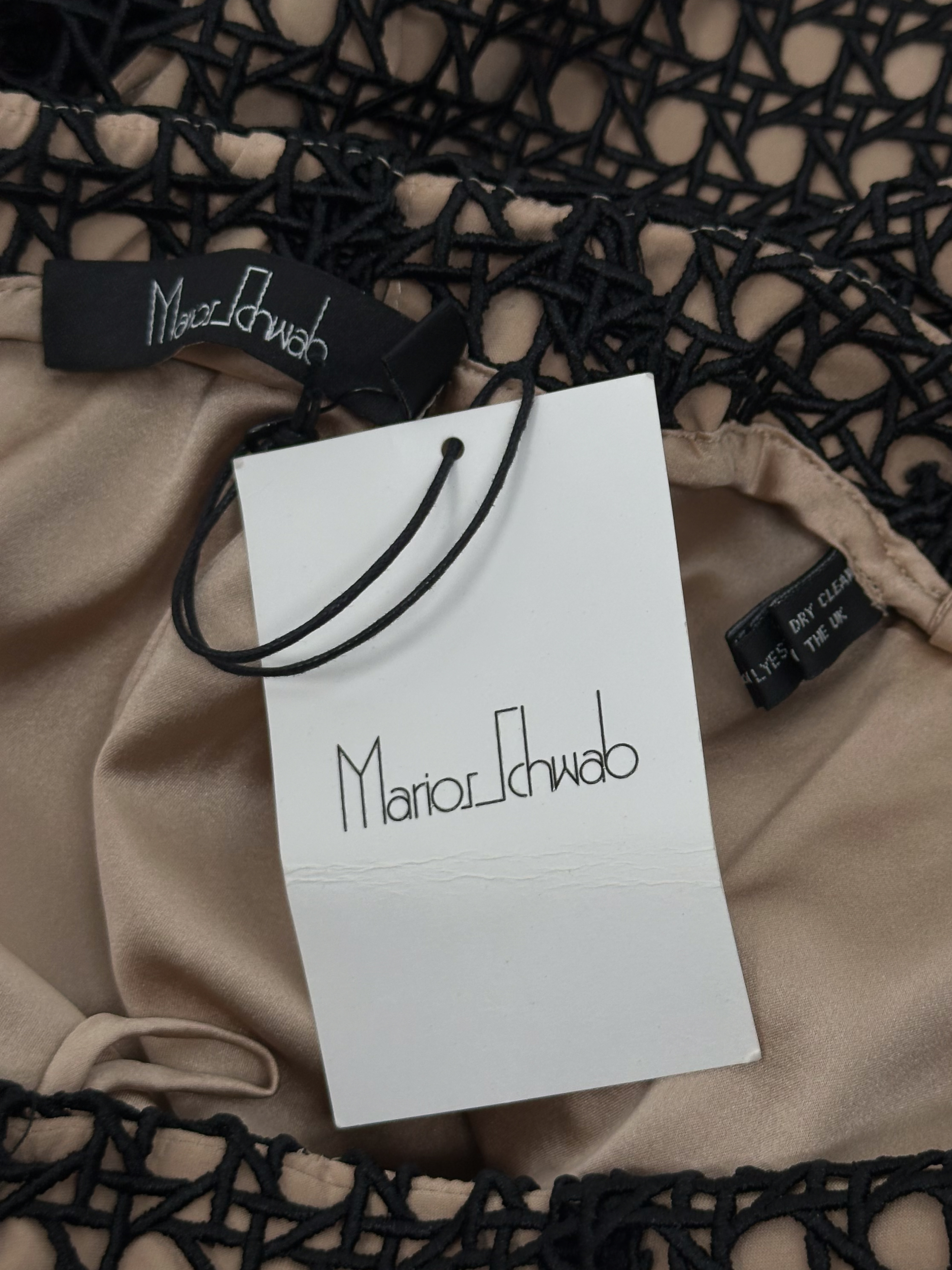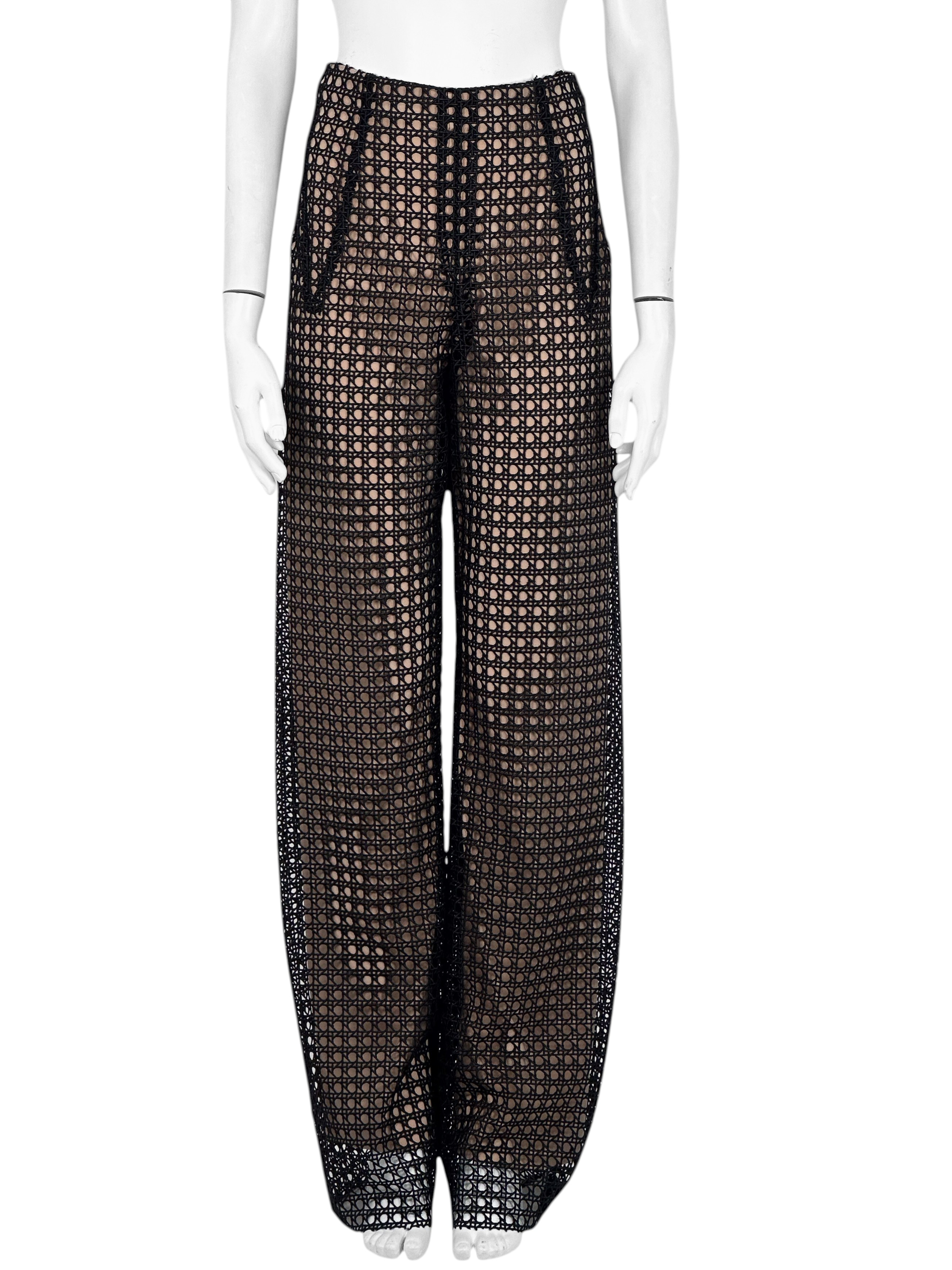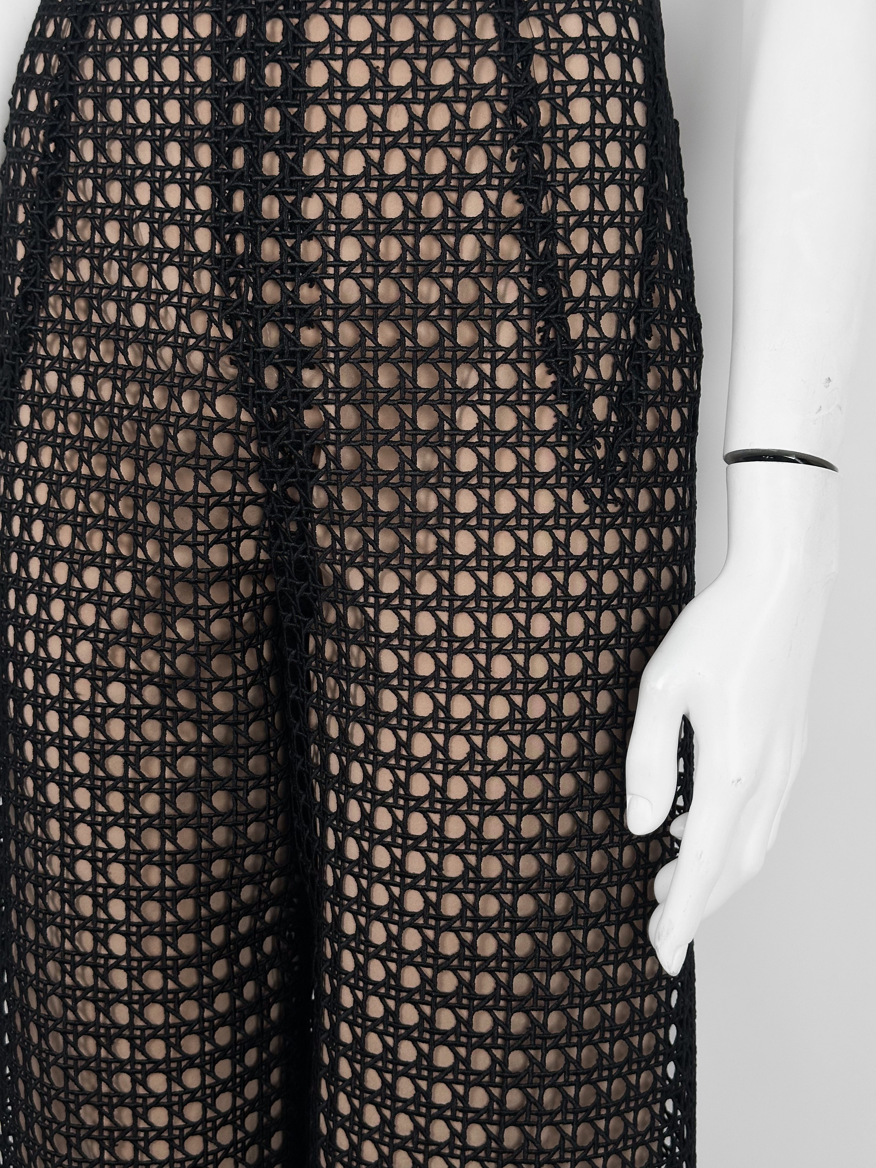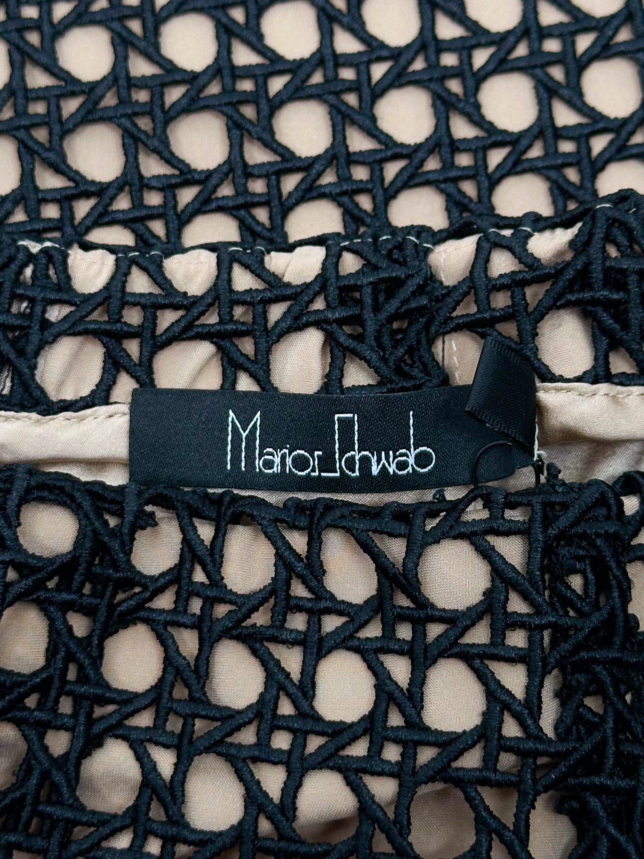 "Czarno-beżowe spodnie, prosta, długa nogawka, ażurowe, beżowa podszewka, zapinane na kryty suwak w tylnej części, wysoki stan. Stan nowe z metką. Rozmiar z metki 8. Skład: 97% poliester, 3% elastan; 100% poliester. Wymiary: szerokość w pasie 33cm, długość całkowita 122cm."