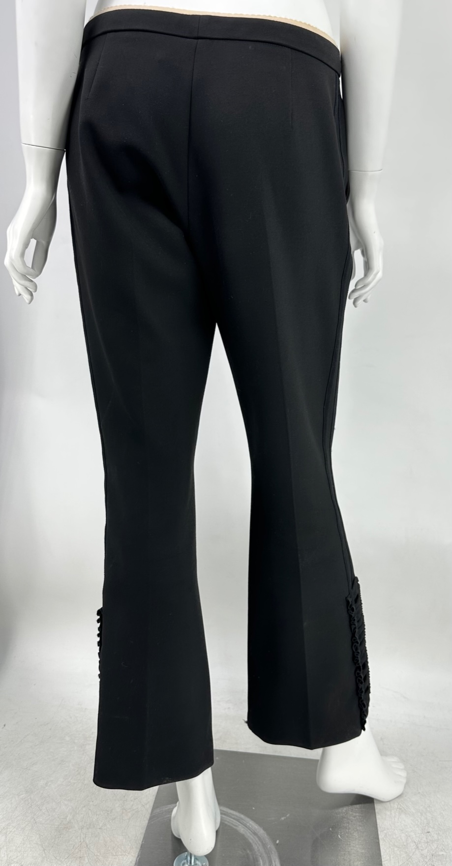 "czarne spodnie w kant, rozszerzana nogawka z ozdobnym marszczeniem na dole, w pasie beżowa lamówka, boczne kieszenie. Rozmiar 42. Skład: 63% poliester, 27% wiskoza, 7% bawełna, 3% elastan. Wymiary: szer. talii 40 cm, szer. bioder 48 cm, dł. całkowita 94 cm."