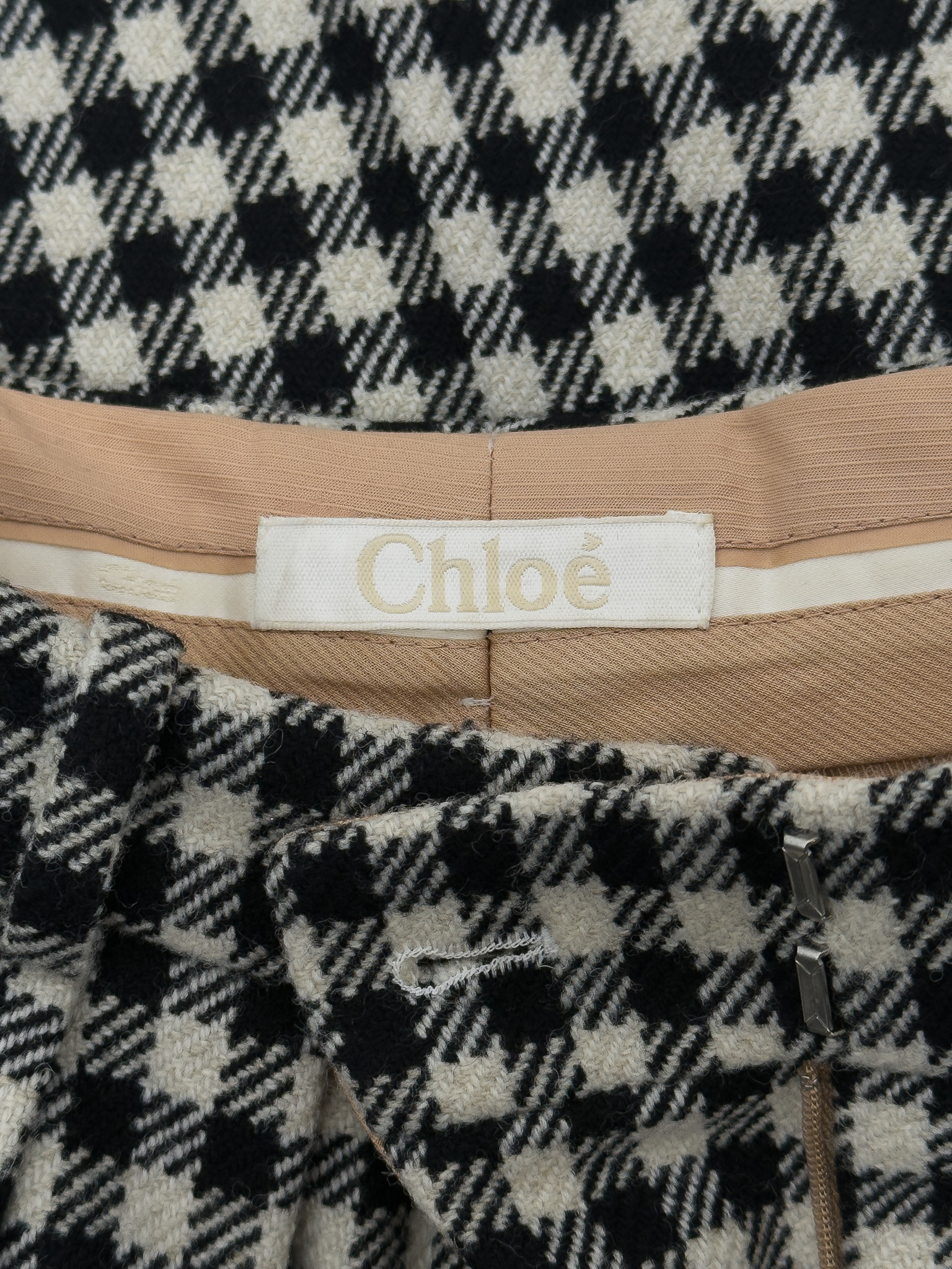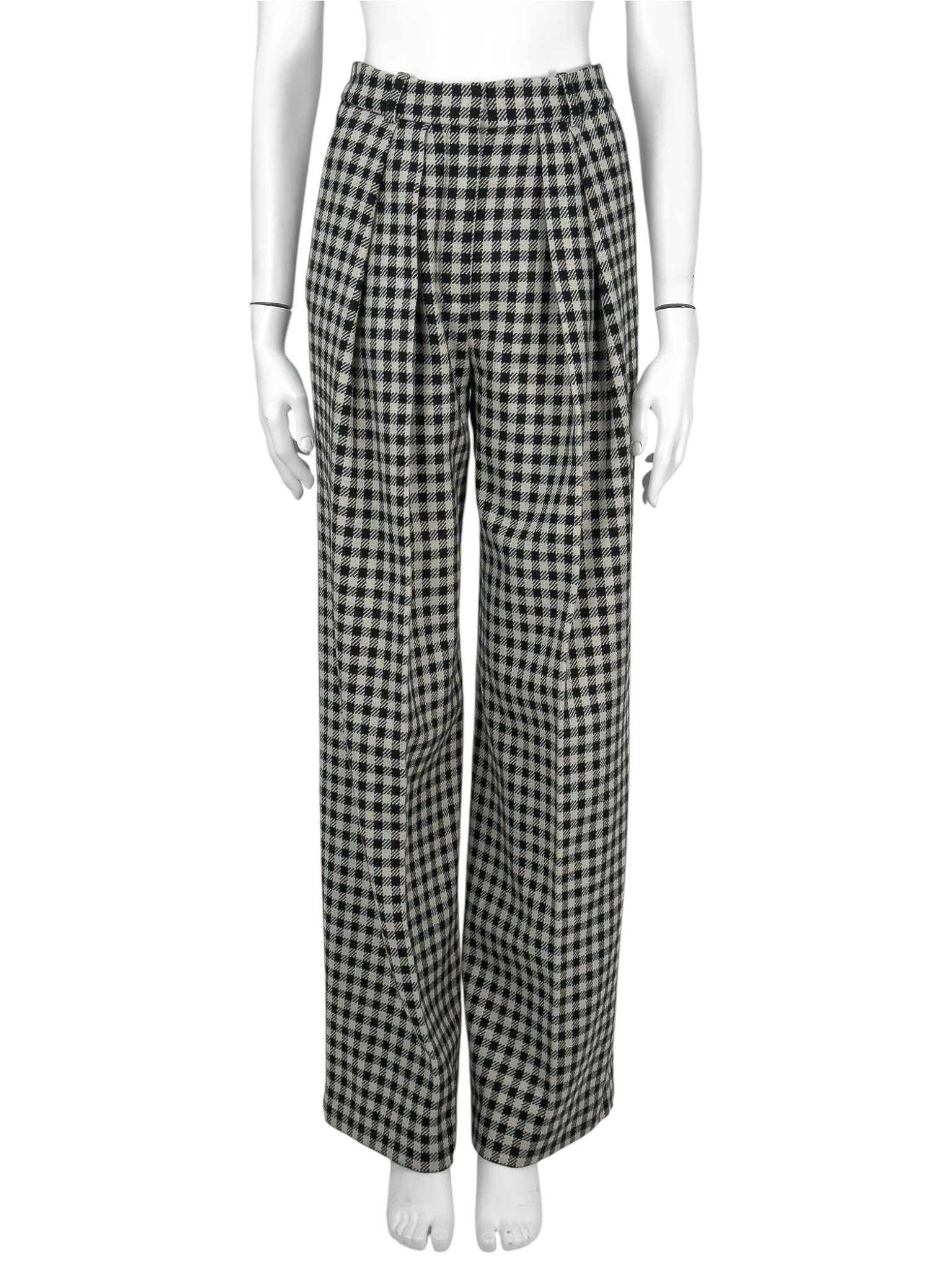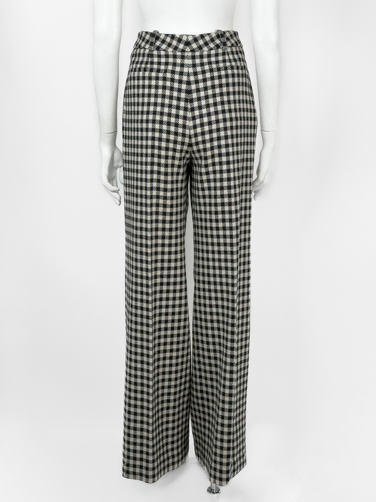 "Wełniane spodnie w beżowo-czarną pepitkę, prosta, szeroka nogawka, wysoki stan, zaszewki, szlufki w pasie, dwie kryte kieszenie po bokach, zapinane na kryty logowany suwak, haftkę oraz guzik. Stan bardzo dobry. Rozmiar z metki 34. Skład: 95% wełna, 5% poliamid; podszewka: 55% wiskoza, 45% kupro. Wymiary: szerokość w pasie 34,5cm, długość mierzona od zewnętrznej strony nogawki 116cm."