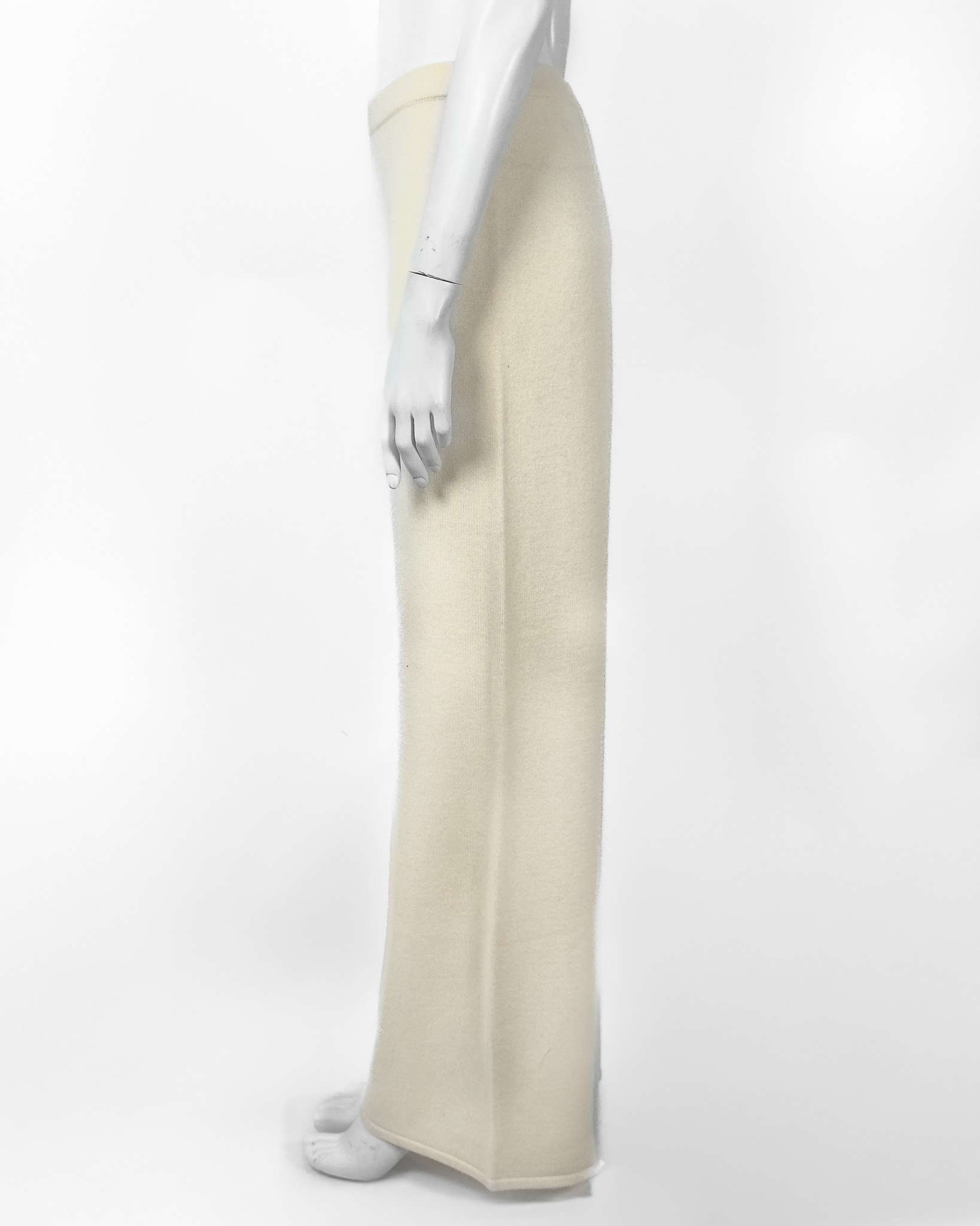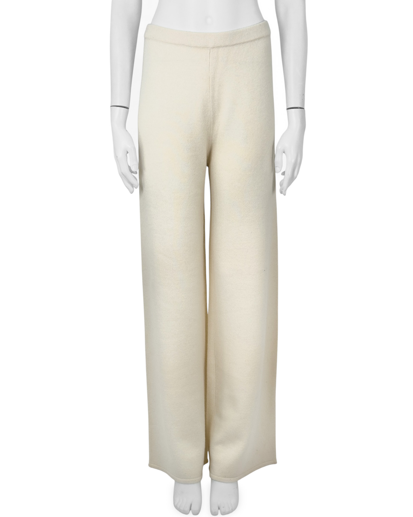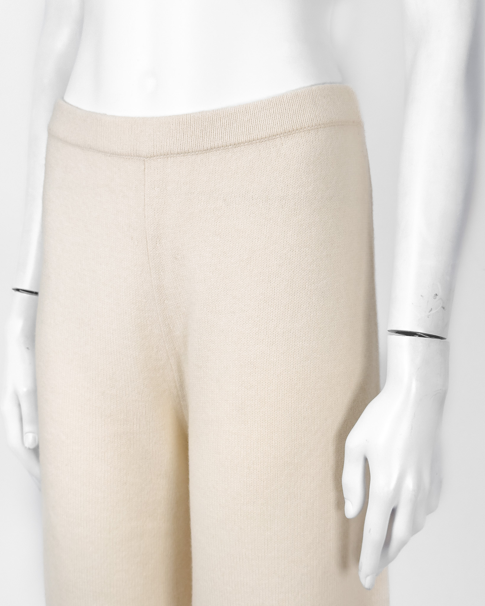 "Wełniano- kaszmirowe kremowe spodnie, prosta, szeroka nogawka, wysoki stan, guma w pasie. Stan bardzo dobry. Rozmiar z metki L. Skład: 80% wełna, 20% kaszmir. Wymiary: szerokość w pasie 38cm, długość całkowita mierzona od zewnętrznej strony nogawki 116cm."