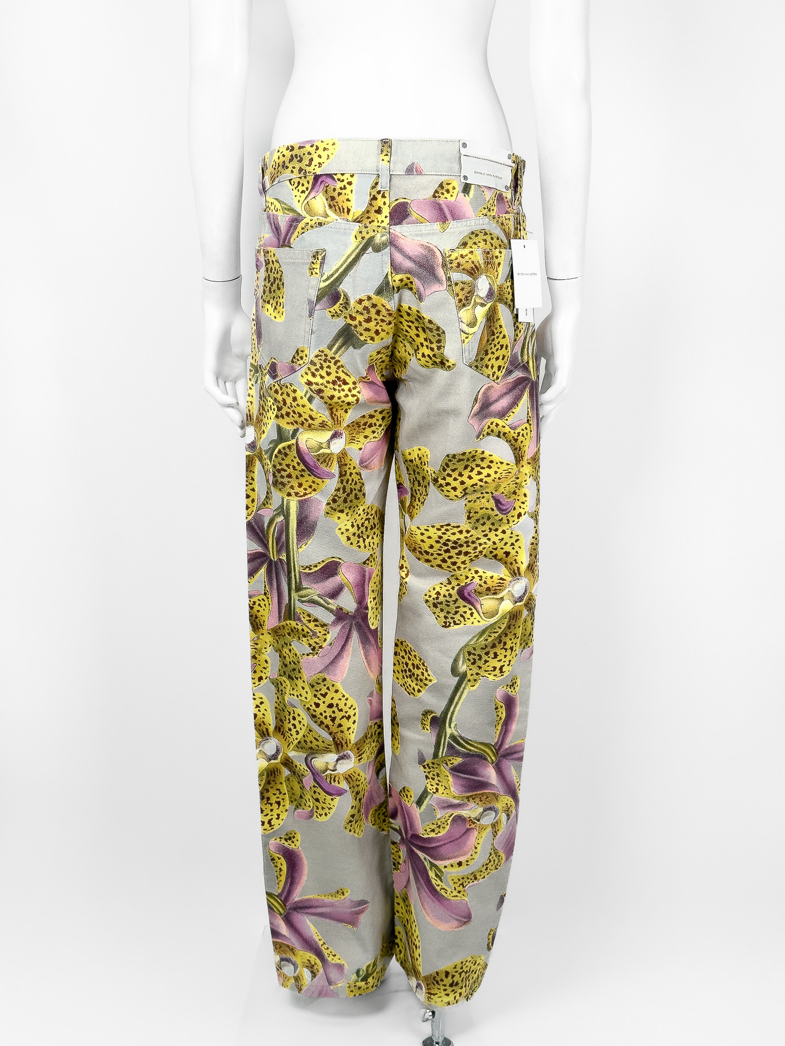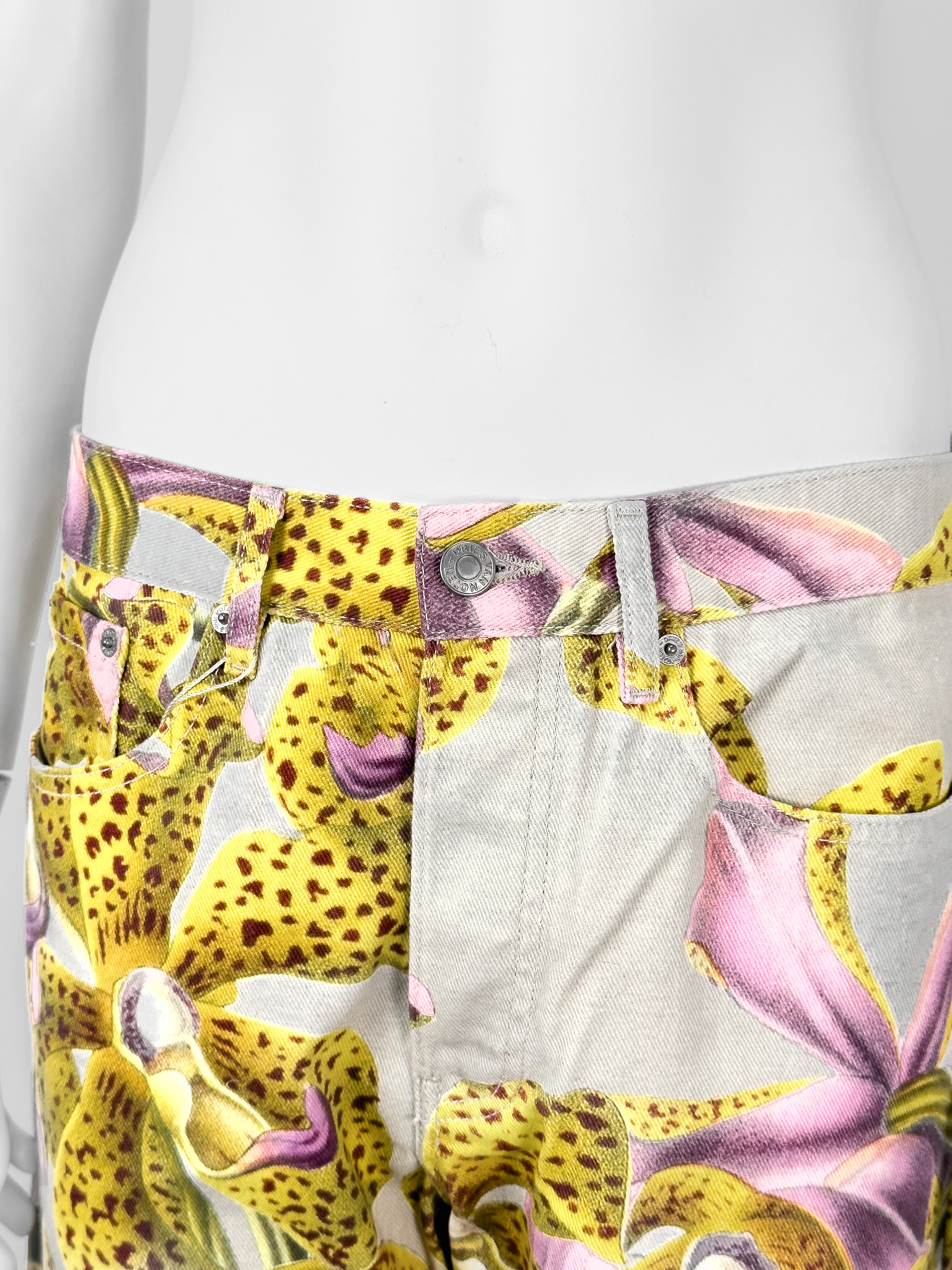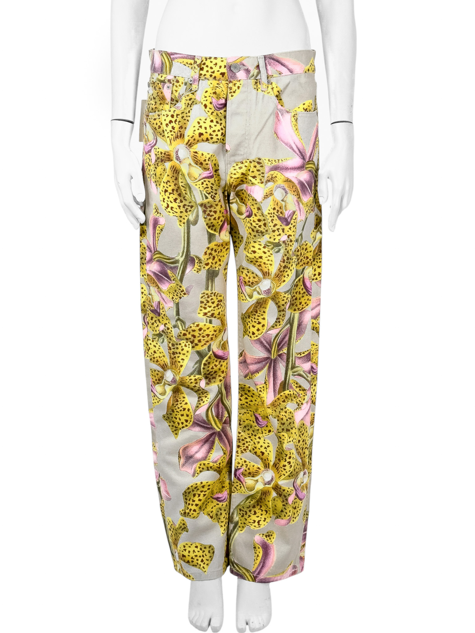 "Jasnoszare spodnie jeansowe ozdobione żółto-różowym wzorem o motywie kwiatowym, wysoki stan, prosta nogawka, zapinane na kryte guziki oraz jeden widoczny logowany, pięć kieszeni, skórzana naszywka z logo marki na wysokości szlufek. Stan nowe z metką Rozmiar z metki 30. Skład: 100% bawełna. Wymiary: szerokość w pasie 42cm, długość całkowita mierzona od zewnętrznej strony nogawki 106cm."